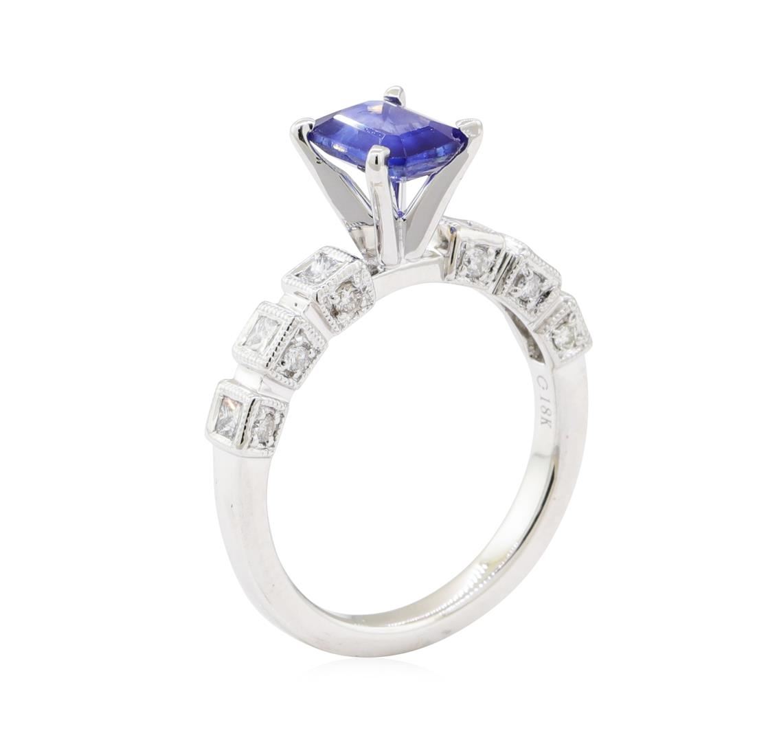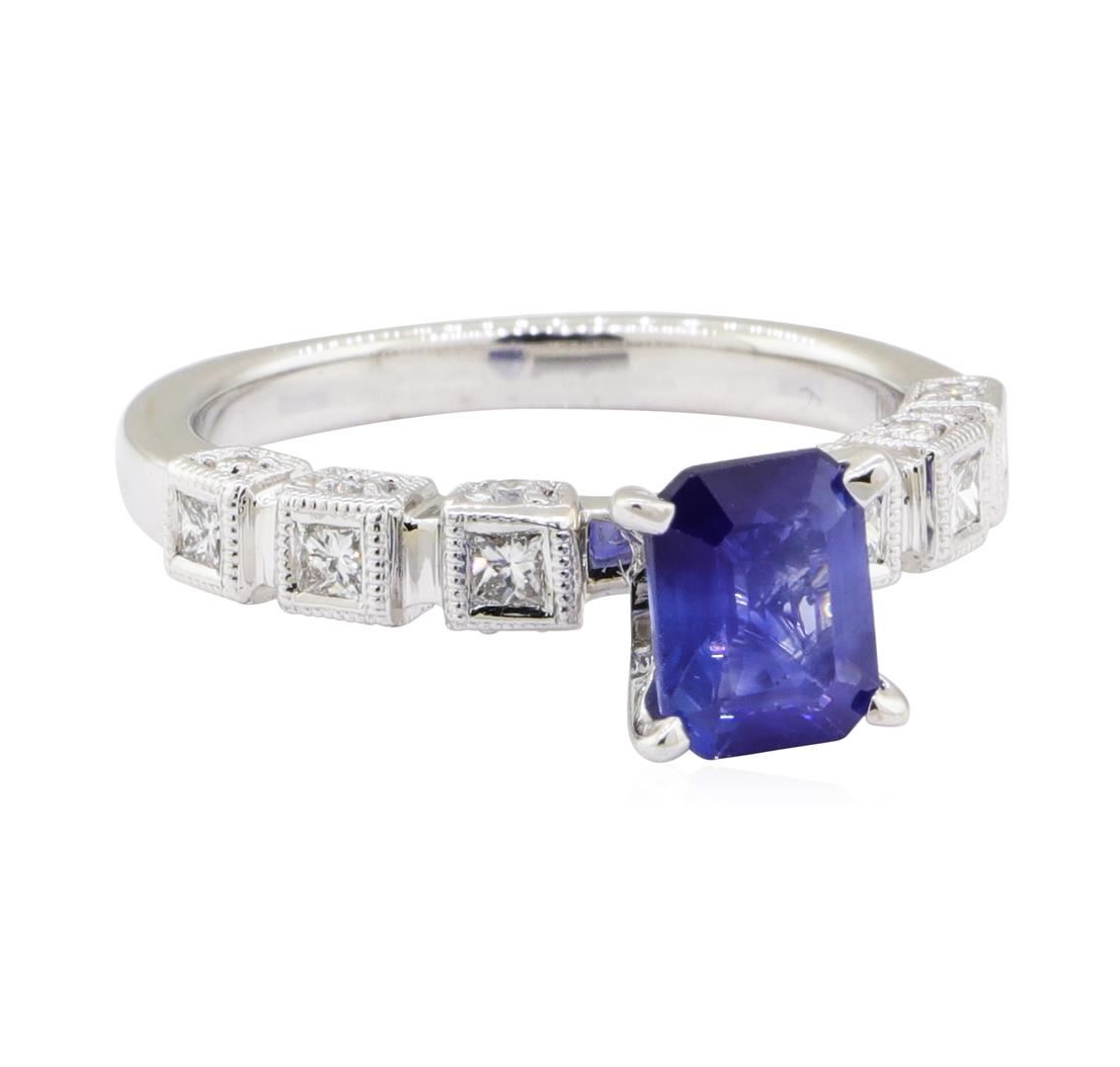 One ring with milgrain and vintage detailing featuring: 18KT white gold weighing 5.2 grams containing one emerald cut sapphire weighing 1.35ct and diamonds weighing 0.40 ctw.
