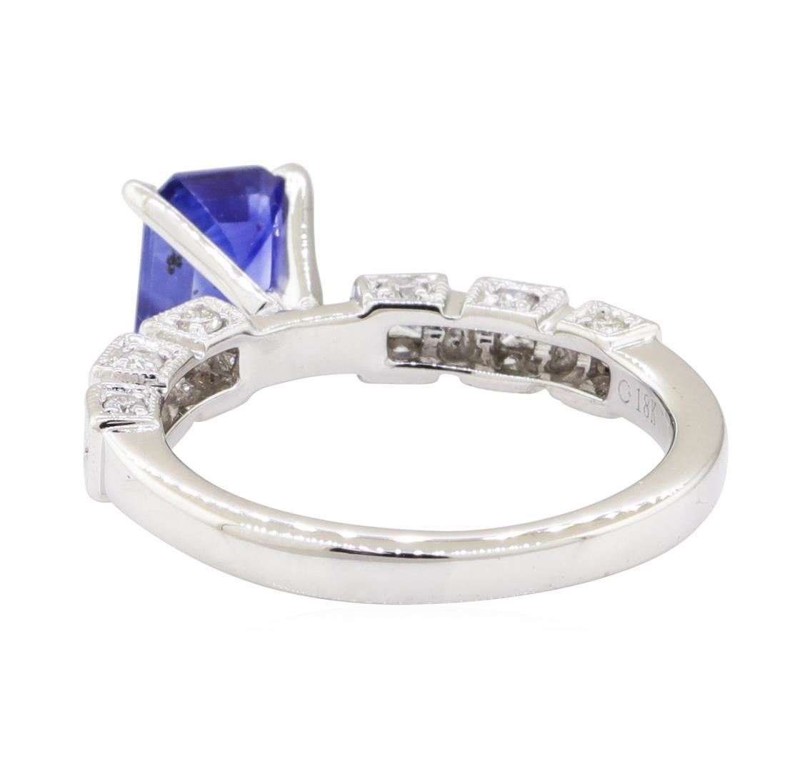 One ring with milgrain and vintage detailing featuring: 18KT white gold weighing 5.2 grams containing one emerald cut sapphire weighing 1.35ct and diamonds weighing 0.40 ctw.