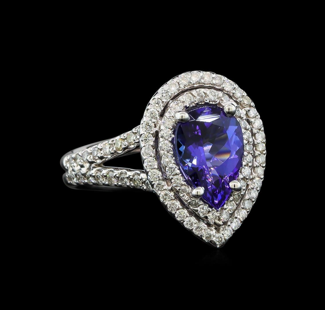 One electronically tested 14KT white gold lady's cast fashion ring with a split shank double halo with a bright polish finish. The featured lady's ring has a double shank measuring 5.27 millimeters wide. Identified with markings of '14K'. Condition is new, good workmanship. Containing: One prong set pear modified brilliant cut natural tanzanite, measuring 9.90 x 6.94 x 3.82mm, (depth est.) approximate weight of 1.75ct., clarity is eye clean, medium dark, moderately strong, violetish blue color, (GIA vB 6/4), cut is very good. Transmitting light with no distortion, transparent. Colored gemstones are presumed to have been subjected to commonly used enhancement processes. Graded in the setting. Thirty-Two prong set round brilliant cut diamonds, measuring 1.30 - 1.25 x 0.79mm (depth est.) approximate total weight of 32 Stones = 0.25ct. Graded in the setting. Clarity SI-1 to I-1. Color: G - I Cut Good Sixty-Two prong set round brilliant cut diamonds, measuring 1.20 - 1.10 x 0.71mm (depth est.) approximate total weight of 62 Stones = 0.36ct. Graded in the setting. Clarity SI-1 to I-1. Color: G - I Cut Good. Total Weight of Colored Stones 1.75ct.. Total Weight of Diamonds 0.61ct.. Total Weight of Ring 5.80gm. GAS Appraised at $5,620.00.