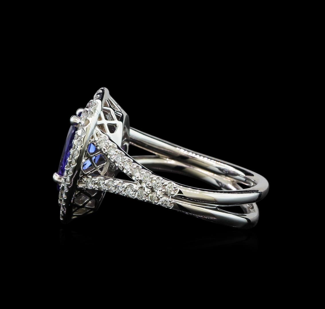 One electronically tested 14KT white gold lady's cast fashion ring with a split shank double halo with a bright polish finish. The featured lady's ring has a double shank measuring 5.27 millimeters wide. Identified with markings of '14K'. Condition is new, good workmanship. Containing: One prong set pear modified brilliant cut natural tanzanite, measuring 9.90 x 6.94 x 3.82mm, (depth est.) approximate weight of 1.75ct., clarity is eye clean, medium dark, moderately strong, violetish blue color, (GIA vB 6/4), cut is very good. Transmitting light with no distortion, transparent. Colored gemstones are presumed to have been subjected to commonly used enhancement processes. Graded in the setting. Thirty-Two prong set round brilliant cut diamonds, measuring 1.30 - 1.25 x 0.79mm (depth est.) approximate total weight of 32 Stones = 0.25ct. Graded in the setting. Clarity SI-1 to I-1. Color: G - I Cut Good Sixty-Two prong set round brilliant cut diamonds, measuring 1.20 - 1.10 x 0.71mm (depth est.) approximate total weight of 62 Stones = 0.36ct. Graded in the setting. Clarity SI-1 to I-1. Color: G - I Cut Good. Total Weight of Colored Stones 1.75ct.. Total Weight of Diamonds 0.61ct.. Total Weight of Ring 5.80gm. GAS Appraised at $5,620.00.