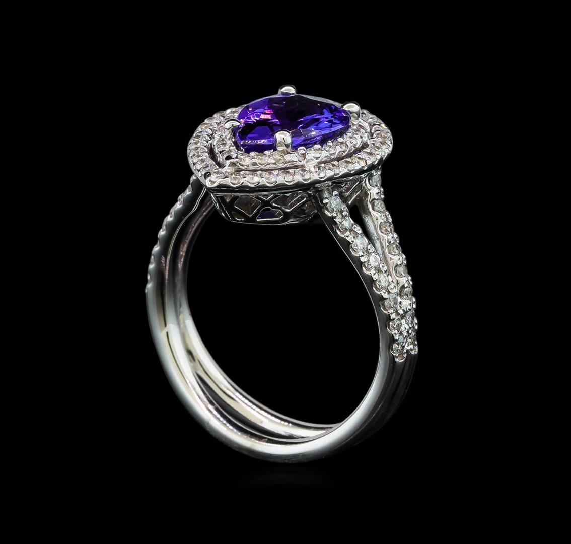 One electronically tested 14KT white gold lady's cast fashion ring with a split shank double halo with a bright polish finish. The featured lady's ring has a double shank measuring 5.27 millimeters wide. Identified with markings of '14K'. Condition is new, good workmanship. Containing: One prong set pear modified brilliant cut natural tanzanite, measuring 9.90 x 6.94 x 3.82mm, (depth est.) approximate weight of 1.75ct., clarity is eye clean, medium dark, moderately strong, violetish blue color, (GIA vB 6/4), cut is very good. Transmitting light with no distortion, transparent. Colored gemstones are presumed to have been subjected to commonly used enhancement processes. Graded in the setting. Thirty-Two prong set round brilliant cut diamonds, measuring 1.30 - 1.25 x 0.79mm (depth est.) approximate total weight of 32 Stones = 0.25ct. Graded in the setting. Clarity SI-1 to I-1. Color: G - I Cut Good Sixty-Two prong set round brilliant cut diamonds, measuring 1.20 - 1.10 x 0.71mm (depth est.) approximate total weight of 62 Stones = 0.36ct. Graded in the setting. Clarity SI-1 to I-1. Color: G - I Cut Good. Total Weight of Colored Stones 1.75ct.. Total Weight of Diamonds 0.61ct.. Total Weight of Ring 5.80gm. GAS Appraised at $5,620.00.