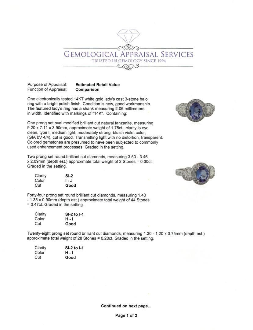 One electronically tested 14KT white gold lady's cast 3-stone halo ring with a bright polish finish. The featured lady's ring has a shank measuring 2.06 millimeters in width. Identified with markings of "14K". Condition is new, good workmanship. Containing: One prong set oval modified brilliant cut natural tanzanite, measuring 9.20 x 7.11 x 3.90mm, approximate weight of 1.75ct., clarity is eye clean, type I, medium light, moderately strong, bluish violet color, (GIA bV 4/4), cut is good. Transmitting light with no distortion, transparent. Colored gemstones are presumed to have been subjected to commonly used enhancement processes. Graded in the setting. Two prong set round brilliant cut diamonds, measuring 3.50 - 3.46 x 2.09mm (depth est.) approximate total weight of 2 Stones = 0.30 ct. Graded in the setting. Clarity: SI-2. Color: I - Good Forty-Four prong set round brilliant cut diamonds, measuring 1.40 - 1.35 x 0.90mm (depth est.) approximate total weight of 44 Stones = 0.47ct. Graded in the setting. Clarity: SI-2 to I-1. Color: H - I. Cut Good Twenty-Eight prong set round brilliant cut diamonds, measuring 1.30 - 1.20 x 0.75mm (depth est.) approximate total weight of 28 Stones = 0.20 ct. Graded in the setting. Clarity: SI-2 to I-1. Color: H - I. Cut Good. Total Weight of Colored Stones 1.75ct. Total Weight of Diamonds 0.97ct. Total Weight of Ring 5.50gm. GAS Appraised.