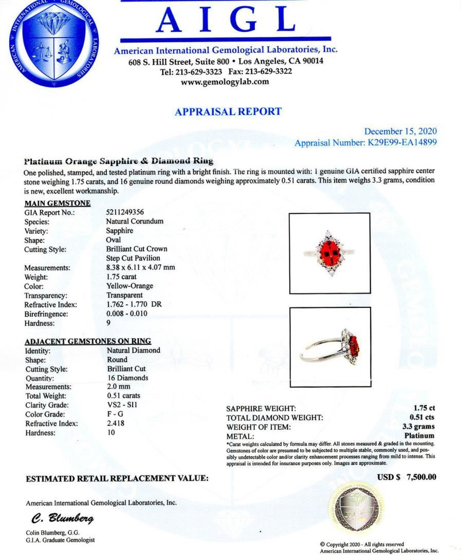 One polished, stamped, and tested platinum ring with a bright finish. The ring is mounted with: 1 genuine GIA certified sapphire center stone weighing 1.75 carats, and 16 genuine round diamonds weighing approximately 0.51 carats. This item weighs 3.3 grams, condition is new, excellent workmanship. MAIN GEMSTONE GIA Report No.: 5211249356 Species: Natural Corundum Variety: Sapphire Shape: Oval Cutting Style: Brilliant Cut Crown Step Cut Pavilion Measurements: 8.38 x 6.11 x 4.07mm Weight: 1.75 carat Color: Yellow-Orange Transparency: Transparent Refractive Index: 1.762 - 1.770 DR Birefringence: 0.008 - 0.010 Hardness: 9 ADJACENT GEMSTONES ON RING Identity: Natural Diamond Shape: Round Cutting Style: Brilliant Cut Quantity: 16 Diamonds Measurements: 2.0mm Total Weight: 0.51 carats Clarity Grade: VS2 to SI1 Color Grade: F - G Refractive Index: 2.418 Hardness: 10 SAPPHIRE WEIGHT: 1.75ct TOTAL DIAMOND WEIGHT: 0.51ctw WEIGHT OF ITEM: 33 grams METAL: Platinum #LREF-2999
