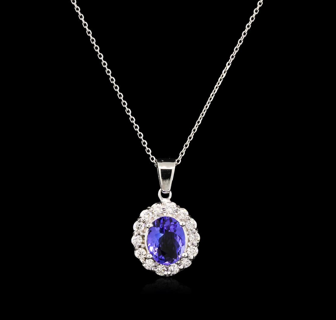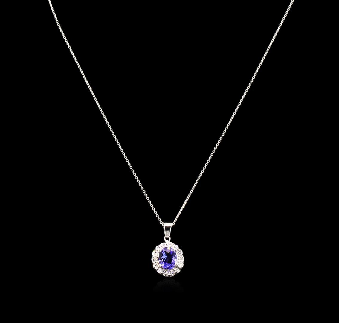 One electronically tested 14KT white gold lady's combination cast & assembled fashion pendant & chain 18.0" long, 1mm diamond cut cable link with a lobster claw clasp with a bright polish finish. Identified with markings of "14K". Condition is new, good workmanship. Containing: One prong set oval modified brilliant cut natural tanzanite, measuring 9.56 x 7.45 x 3.72mm, approximate weight of 1.75ct., clarity is eye clean, type I, medium, very slightly grayish, bluish violet color, (GIA bV 5/3), cut is fair. Transmitting light with no distortion, transparent. Colored gemstones are presumed to have been subjected to commonly used enhancement processes. Graded in the setting. Fourteen prong set round brilliant cut diamonds, measuring 2.30 - 2.20 x 1.39mm (depth est.) approximate total weight of 14 Stones = 0.60ct. Graded in the setting. Clarity: SI-2 to I-1. Color: H - Good. Total Weight of Colored Stones 1.75ct. Total Weight of Diamonds 0.60ct. Total Weight of Pendant & Chain 5.20gm. GAS Appraised at $4,145.00.