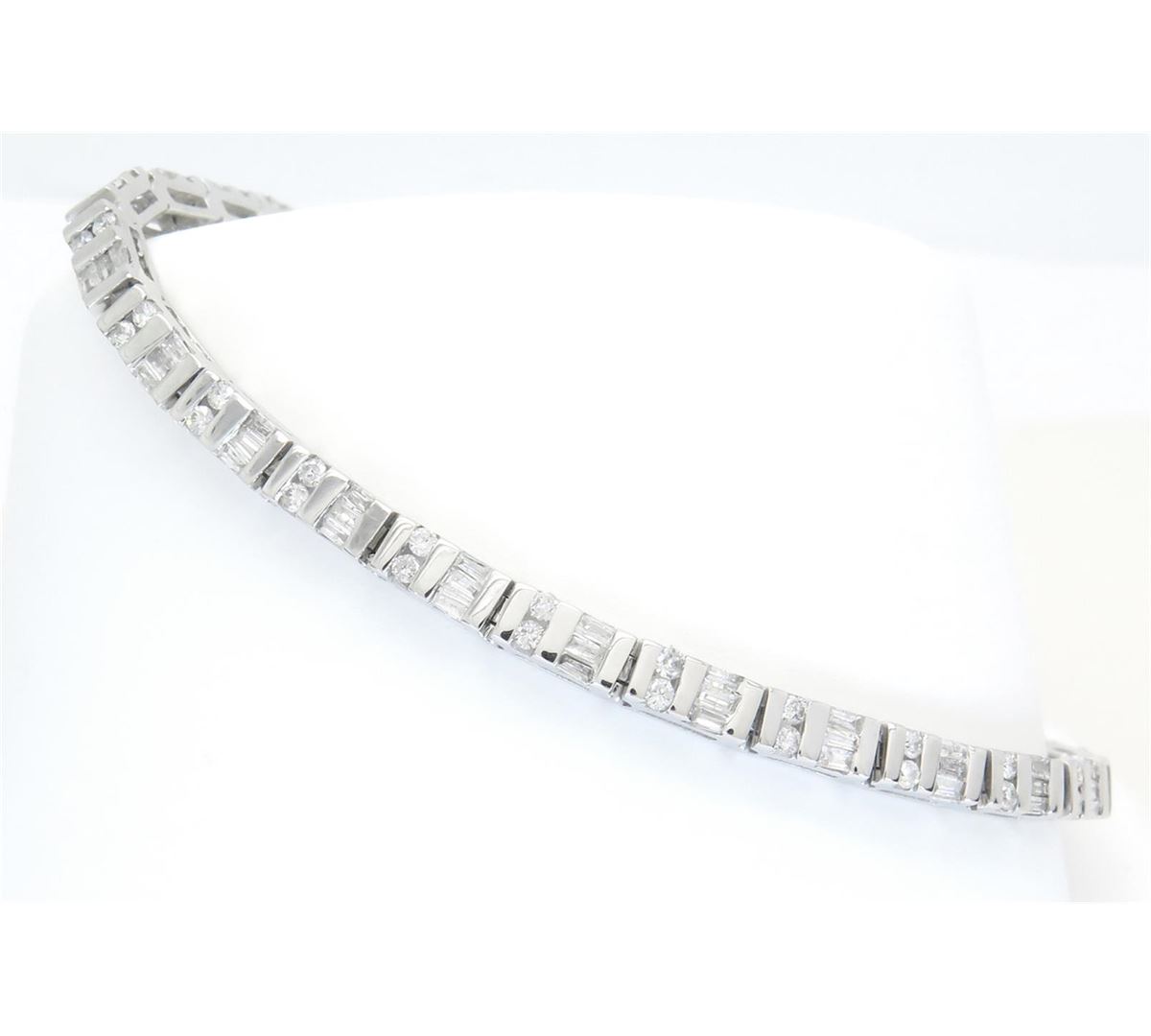 One tested 14K white gold diamond bracelet. Containing: 54 Round Brilliant Cut Diamonds, 81 Baguette Cut Diamonds. Clarity: I, Color: G-I. Approximate Total diamond weight: 1.75CTW. Diamonds are graded in the mounting, unless otherwise stated. Weight of bracelet: 10.8 grams. Size: 7" long.