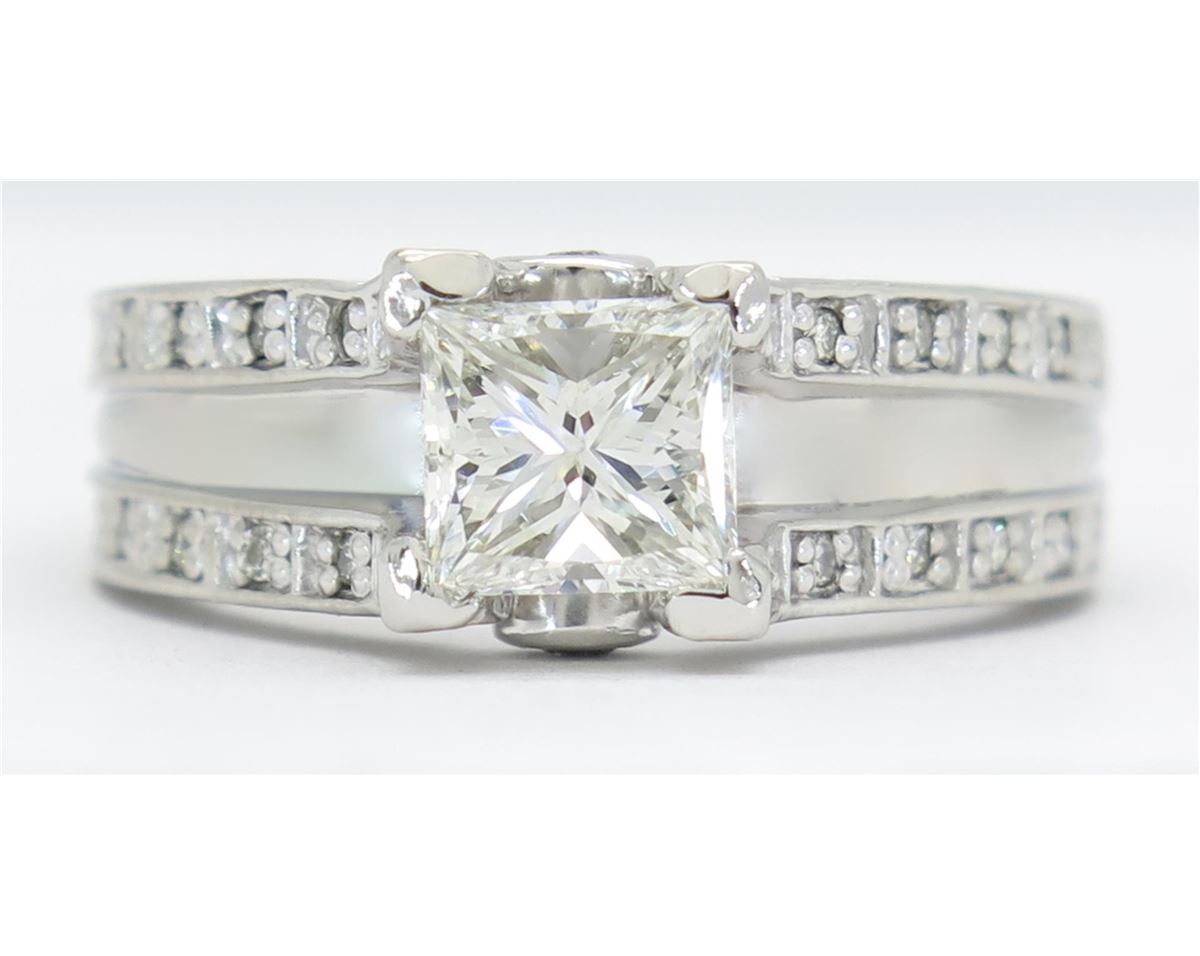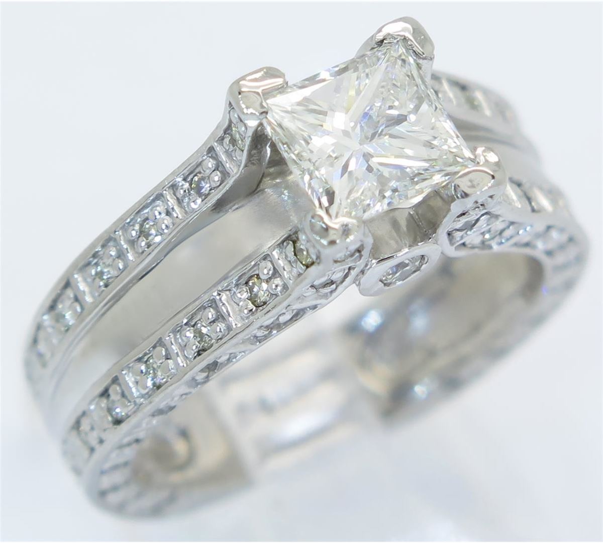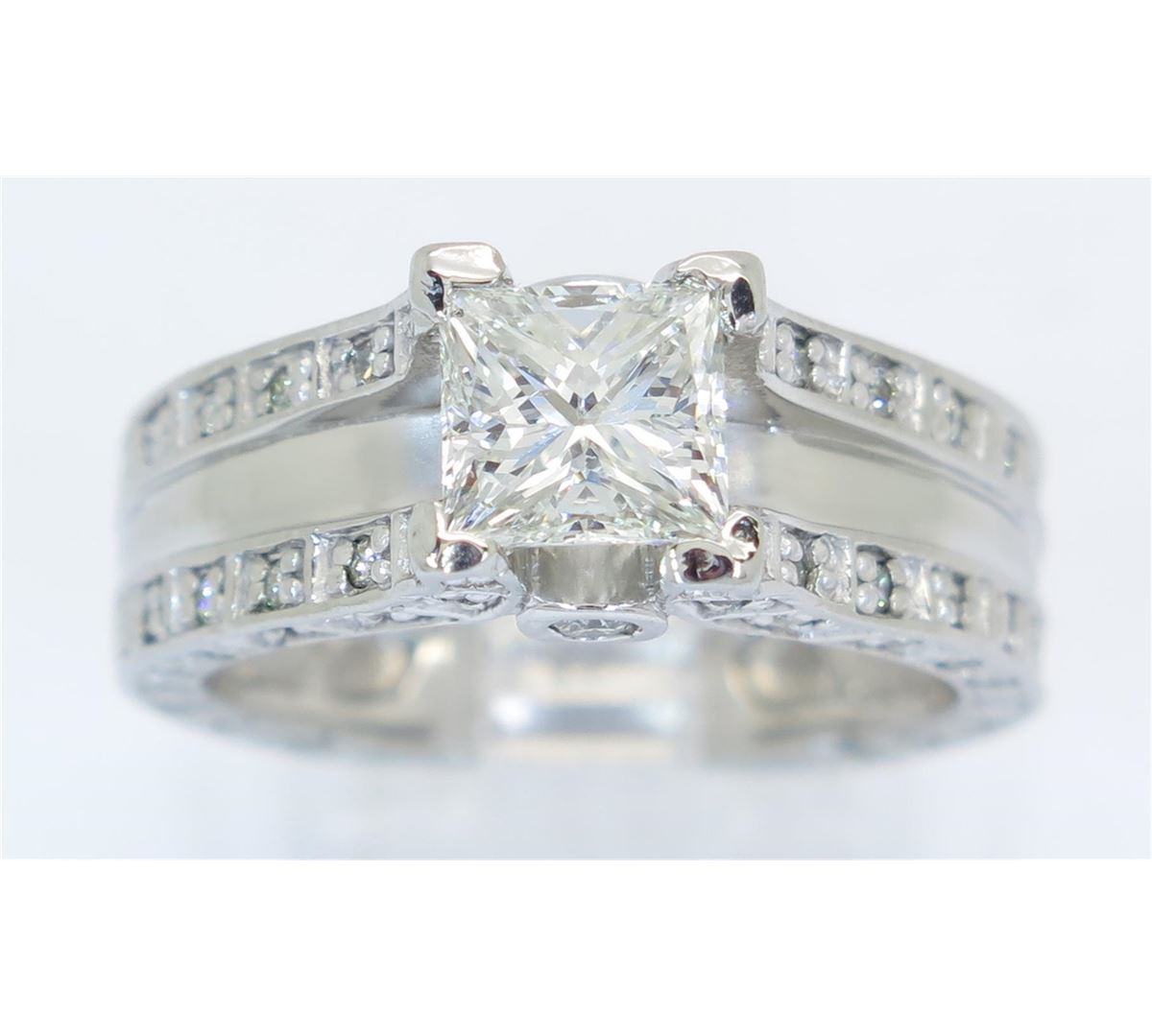 One tested platinum diamond ring. Containing: 1 Princess Cut Diamond. Approximate Weight: 1.05CT, Clarity: SI2, Color: H-I. 82 Round Brilliant Cut Diamonds. Approximate total diamond weight: 1.75CTW. Diamonds are graded in the mounting, unless otherwise stated. Weight of ring: 9.5 grams. Size: 5.5.