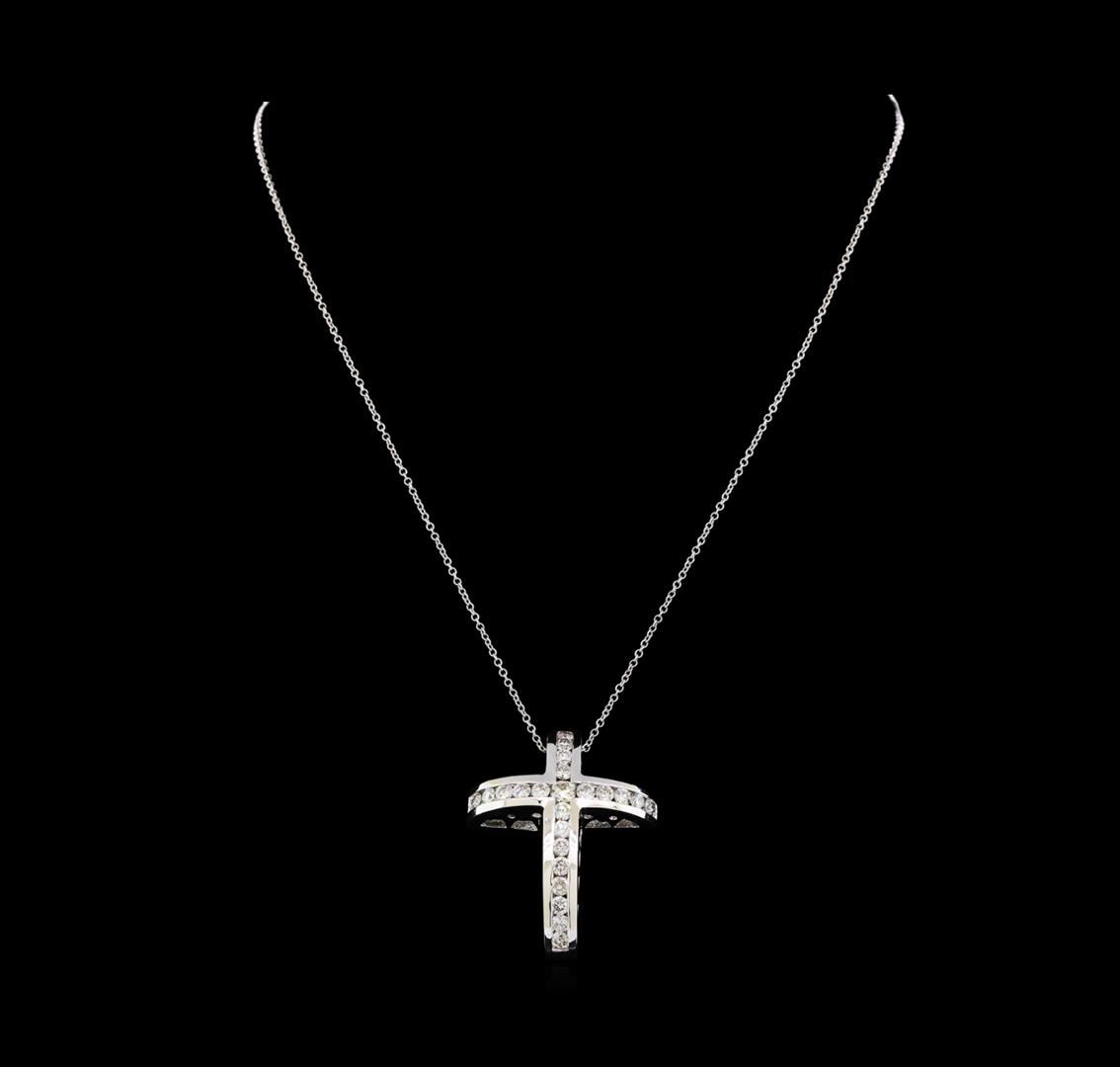 One electronically tested 14KT white gold cast & assembled diamond cross pendant with chain. The one and one-quarter inch length pendant features a convex diamond ribbon cross, completed by a hidden bail. The pendant is supported by a sixteen inch length 14KT white gold cable chain, terminating in a lobster claw clasp. Bright polish finish. Identified with markings of "14K". Condition is new, good workmanship. Containing: One channel set round brilliant cut diamond, measuring 3.55 - 3.50 x 2.12mm (depth est.) approximate weight of 0.16ct. Graded in the setting. Clarity: I-1. Color: H - J Twenty-Three channel set round brilliant cut diamonds, measuring 2.70 - 2.60 x 1.59mm (depth est.) approximate total weight of 23 Stones = 1.60ct. Graded in the setting. Clarity: SI-2 to I-2. Color: H - J. Total Weight of Diamonds 1.76ct. Total Weight of Pendant With Chain 12.58gm. AIG Appraised at $6,145.00.