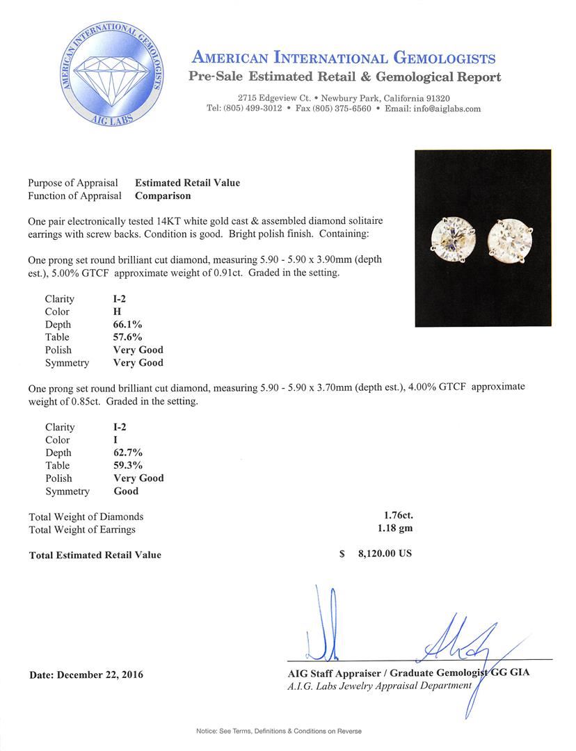 One pair electronically tested 14KT white gold cast & assembled diamond solitaire earrings with screw backs. Bright polish finish. Condition is good. Containing: One prong set round brilliant cut diamond, measuring 5.90 - 5.90 x 3.90mm (depth est.), 5.00.%. GTCF approximate weight of 0.91ct. Graded in the setting. Clarity I-2. Color: H Depth 66.1%. Table: 57.6%. One prong set round brilliant cut diamond, measuring 5.90 - 5.90 x 3.70mm (depth est.), 4.00.%. GTCF approximate weight of 0.85ct. Graded in the setting. Clarity I-2. Color: I Depth 62.7%. Table: 59.3%.. Total Weight of Diamonds 1.76ct.. Total Weight of Earrings 1.18gm. AIG Appraised at $8,120.00.