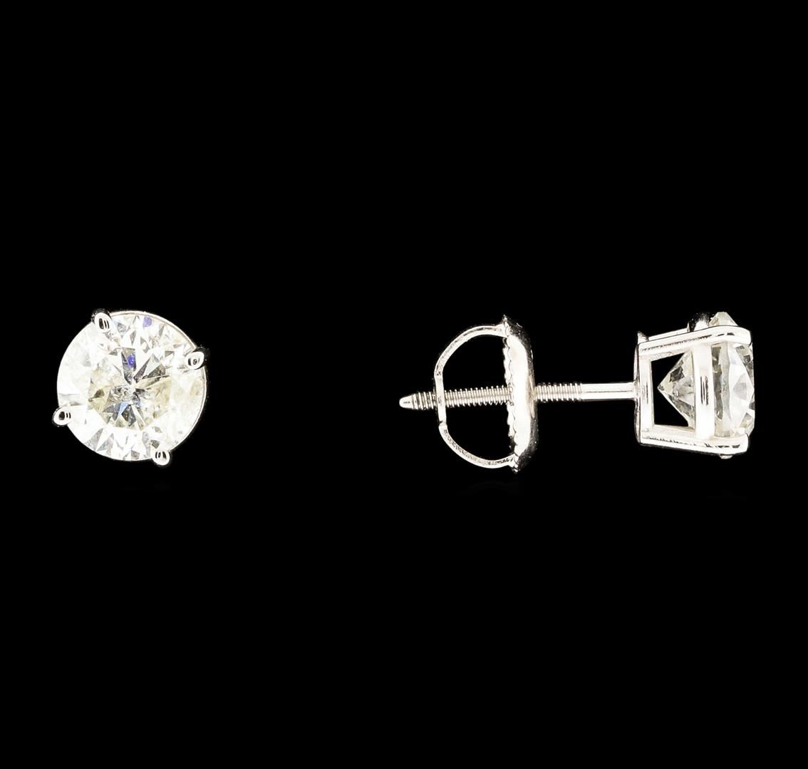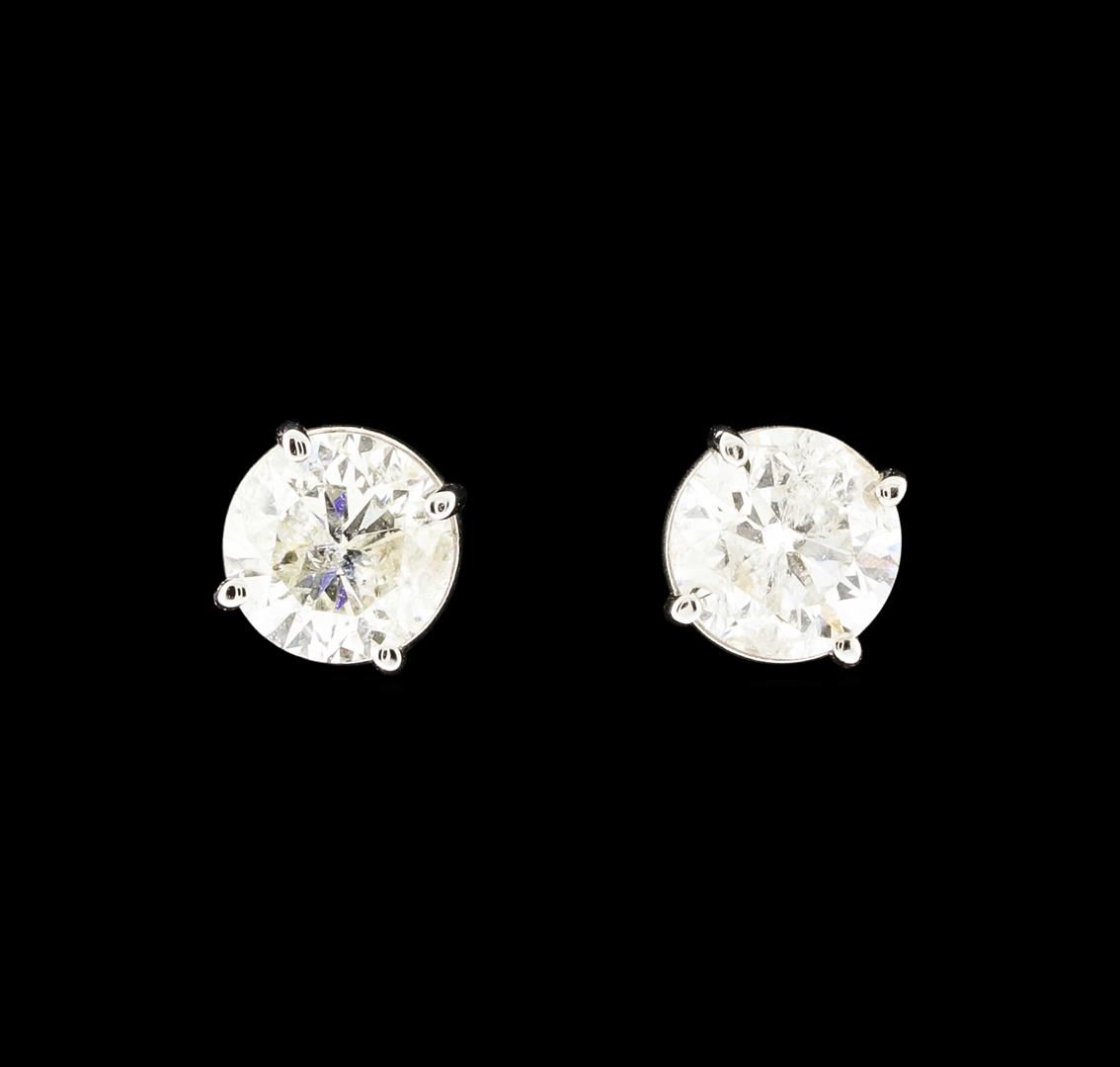 One pair electronically tested 14KT white gold cast & assembled diamond solitaire earrings with screw backs. Bright polish finish. Condition is good. Containing: One prong set round brilliant cut diamond, measuring 5.90 - 5.90 x 3.90mm (depth est.), 5.00.%. GTCF approximate weight of 0.91ct. Graded in the setting. Clarity I-2. Color: H Depth 66.1%. Table: 57.6%. One prong set round brilliant cut diamond, measuring 5.90 - 5.90 x 3.70mm (depth est.), 4.00.%. GTCF approximate weight of 0.85ct. Graded in the setting. Clarity I-2. Color: I Depth 62.7%. Table: 59.3%.. Total Weight of Diamonds 1.76ct.. Total Weight of Earrings 1.18gm. AIG Appraised at $8,120.00.