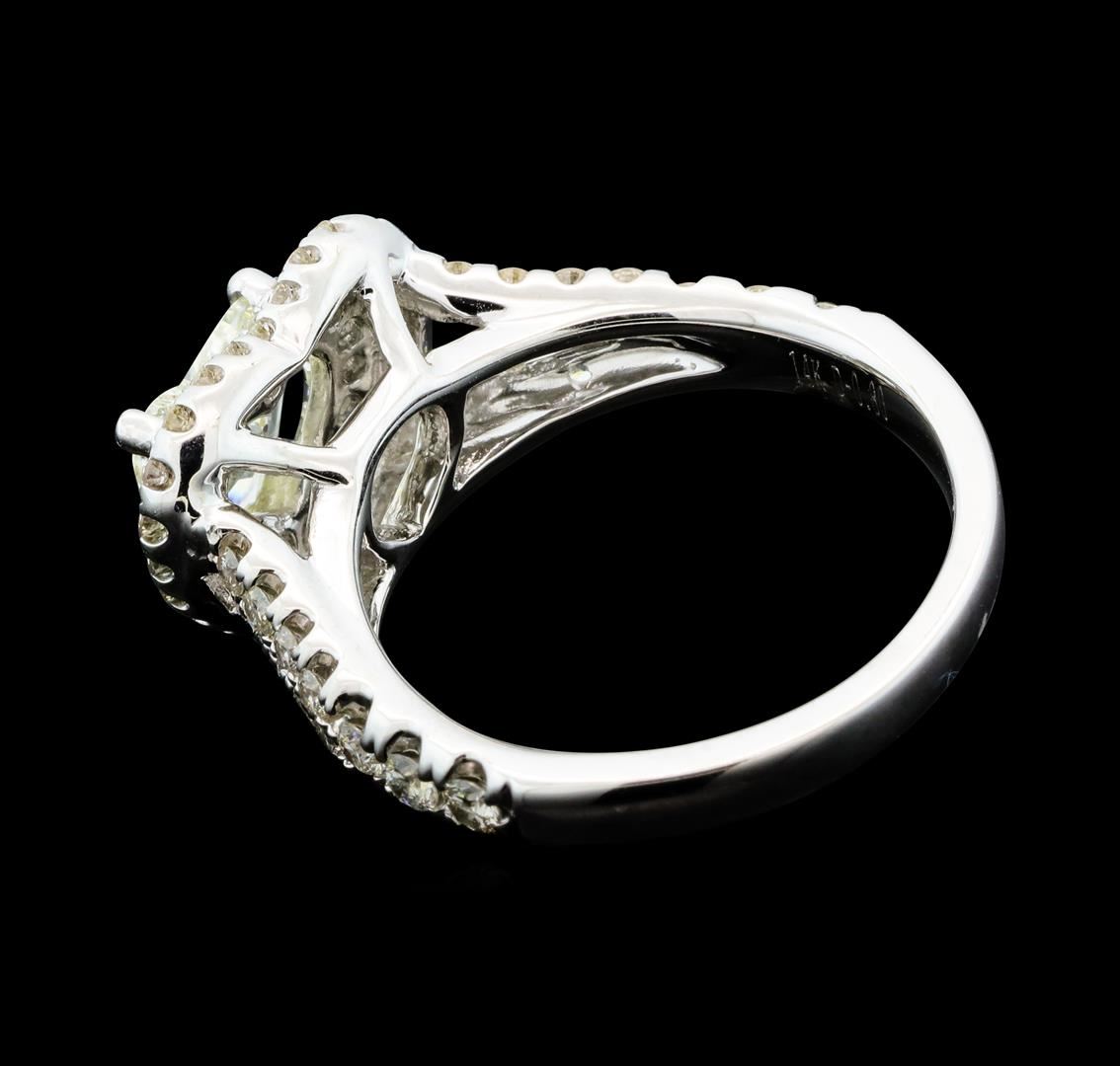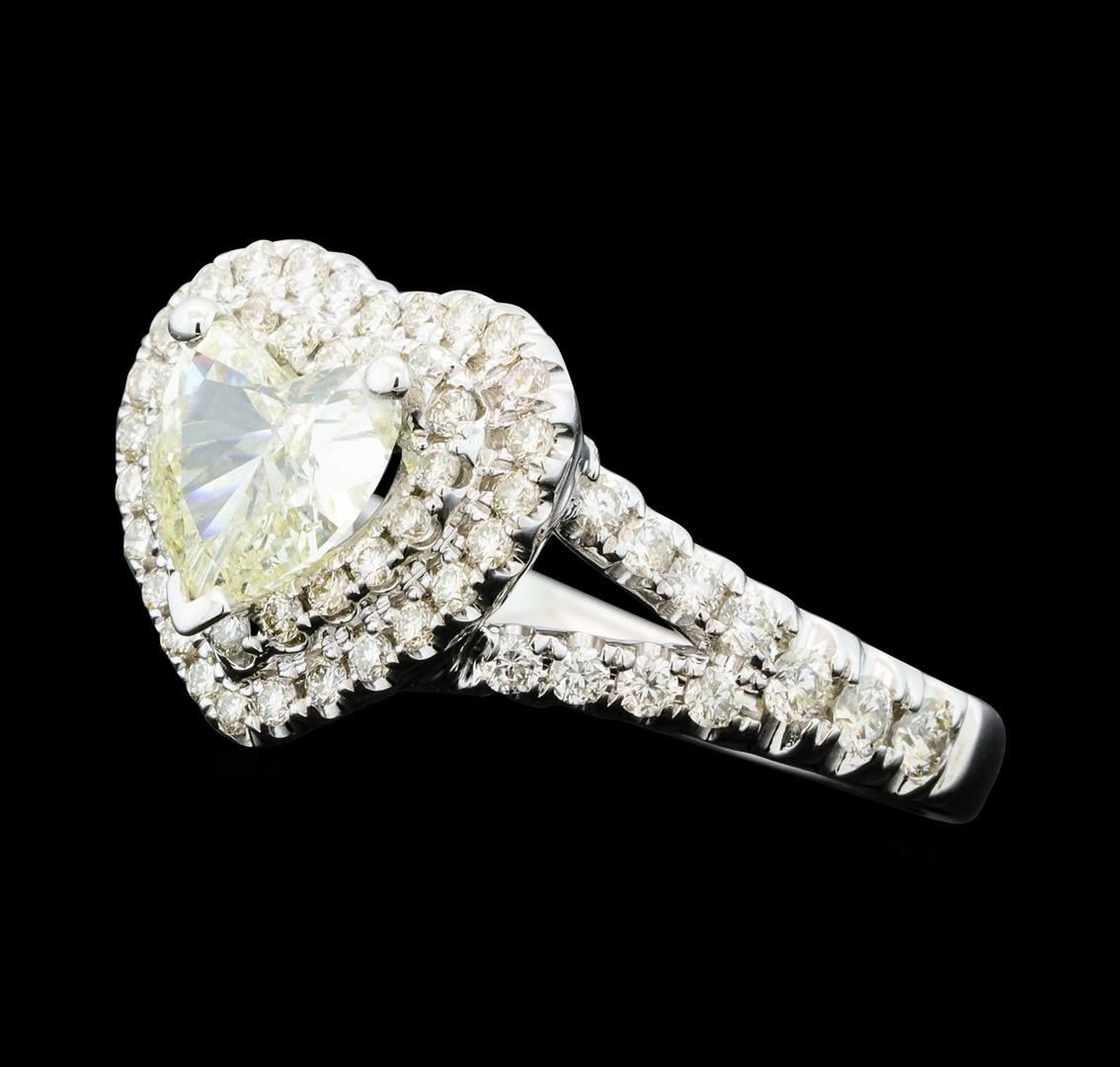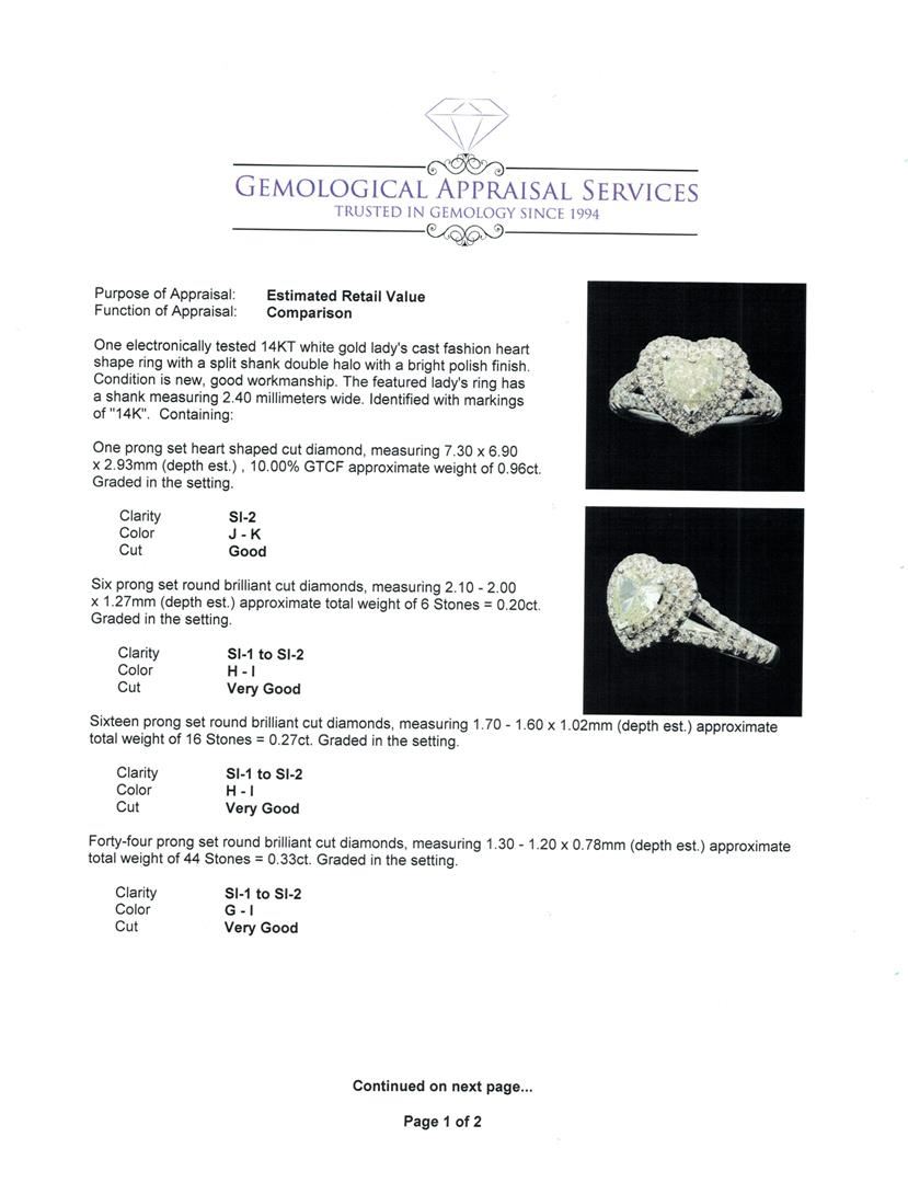 One electronically tested 14KT white gold lady's cast fashion heart shape ring with a split shank double halo with a bright polish finish. The featured lady's ring has a shank measuring 2.40 millimeters wide. Identified with markings of '14K'. Condition is new, good workmanship. Containing: One prong set heart shaped cut diamond, measuring 7.30 x 6.90 x 2.93mm (depth est.) , 10.00.%. GTCF approximate weight of 0.96ct. Graded in the setting. Clarity SI-2. Color: J - K Cut Good Six prong set round brilliant cut diamonds, measuring 2.10 - 2.00 x 1.27mm (depth est.) approximate total weight of 6 Stones = 0.20ct. Graded in the setting. Clarity SI-1 to SI-2. Color: H - I Cut Very Good Sixteen prong set round brilliant cut diamonds, measuring 1.70 - 1.60 x 1.02mm (depth est.) approximate total weight of 16 Stones = 0.27ct. Graded in the setting. Clarity SI-1 to SI-2. Color: H - I Cut Very Good Forty-Four prong set round brilliant cut diamonds, measuring 1.30 - 1.20 x 0.78mm (depth est.) approximate total weight of 44 Stones = 0.33ct. Graded in the setting. Clarity SI-1 to SI-2. Color: G - I Cut Very Good. Total Weight of Diamonds 1.76ct.. Total Weight of Ring 5.70gm. GAS Appraised at $9,290.00.