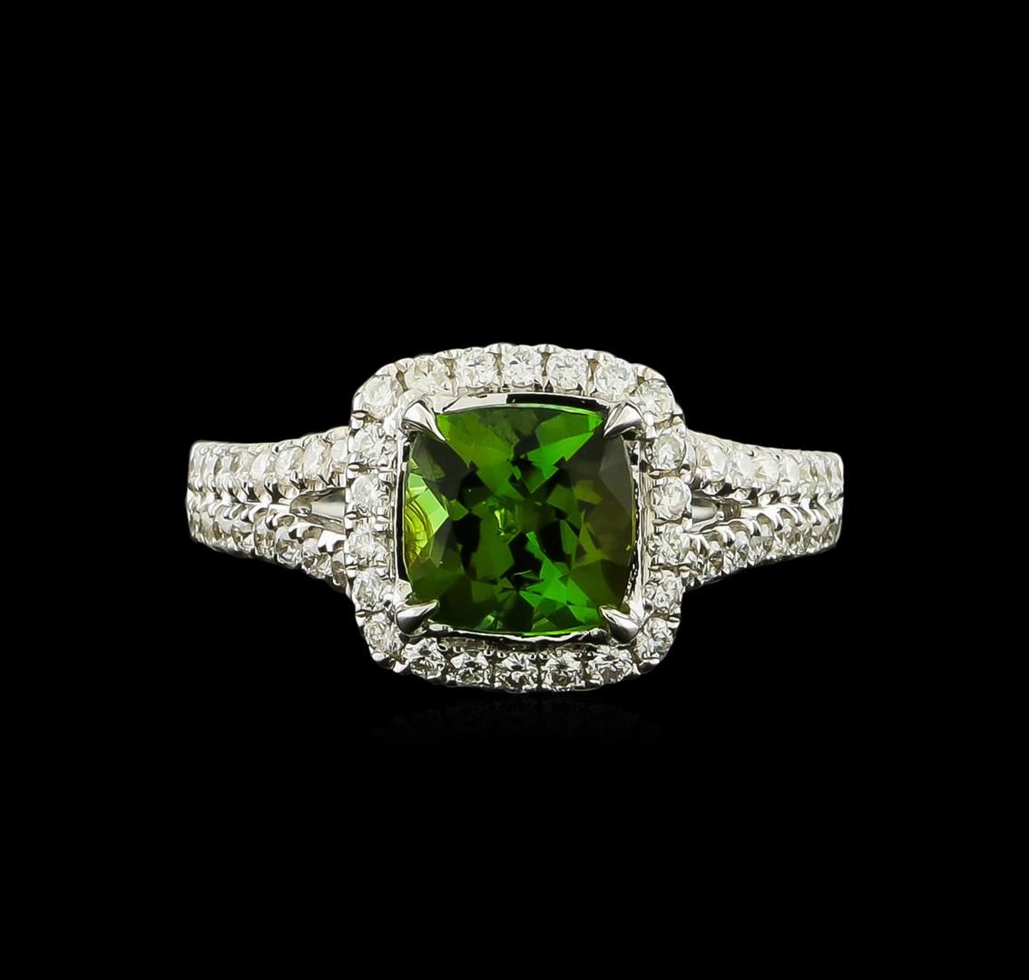One electronically tested 14KT white gold lady's cast fashion ring with a split shank halo with a bright polish finish. The featured lady's ring has a shank measuring 2.42 millimeters wide. Identified with markings of "14K". Condition is new, good workmanship. Containing: One prong set square cushion modified brilliant cut natural green tourmaline, measuring 7.05 x 7.04 x 4.93mm, approximate weight of 1.76ct., clarity is slightly included, type I, medium dark, moderately strong, slightly yellowish green color, (GIA slyG 6/4), cut is very good. Transmitting light with a minimum of distortion, transparent. Colored gemstones are presumed to have been subjected to commonly used enhancement processes. Graded in the setting. Fifty-Four prong set round brilliant cut diamonds, measuring 1.40 - 1.35 x 0.86mm (depth est.) approximate total weight of 54 Stones = 0.54ct. Graded in the setting. Clarity: SI-1 to SI-2. Color: G - Good. Total Weight of Colored Stones 1.76ct. Total Weight of Diamonds 0.54ct. Total Weight of Ring 4.20gm GAS Appraised at $3,750.00.