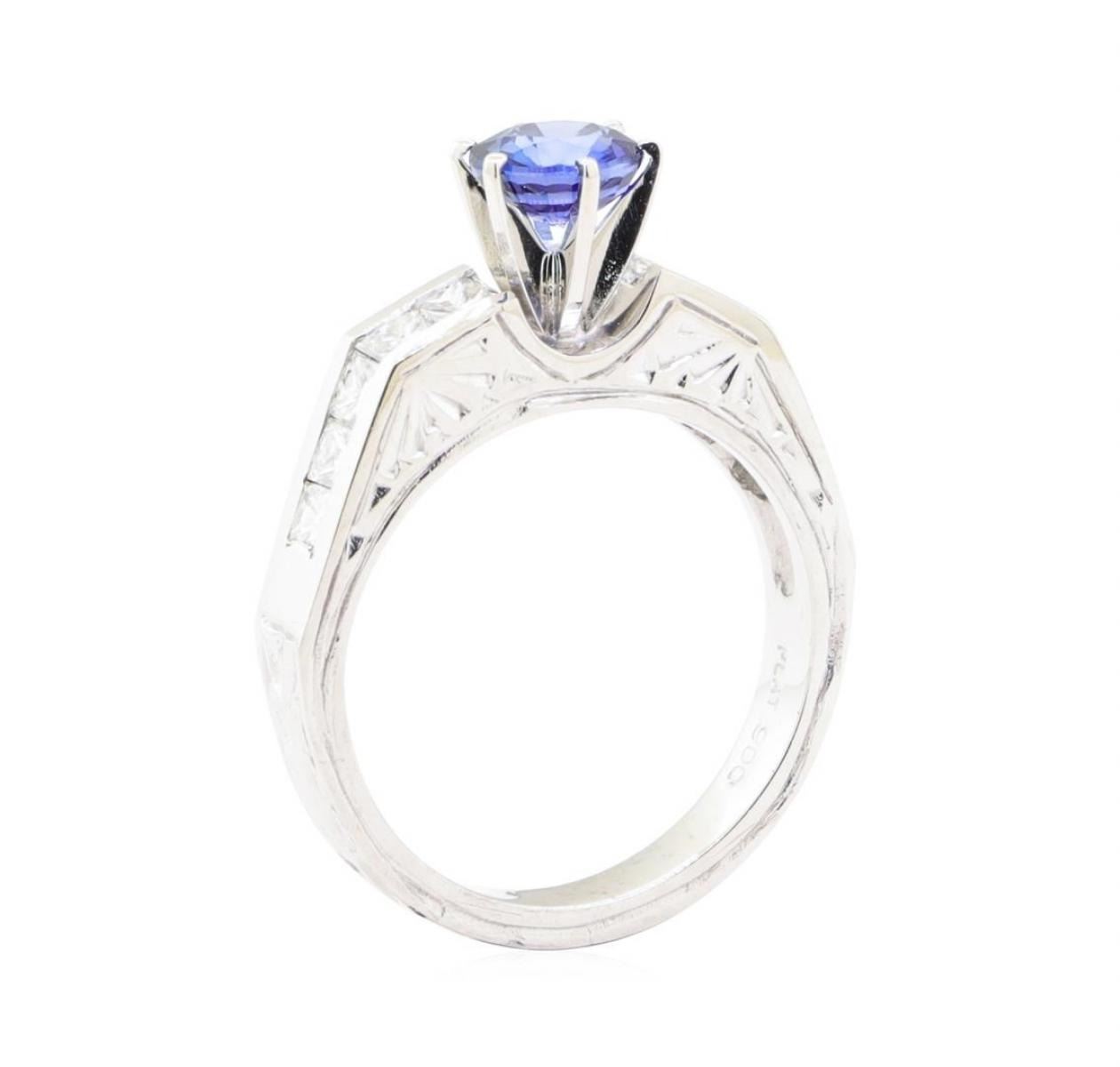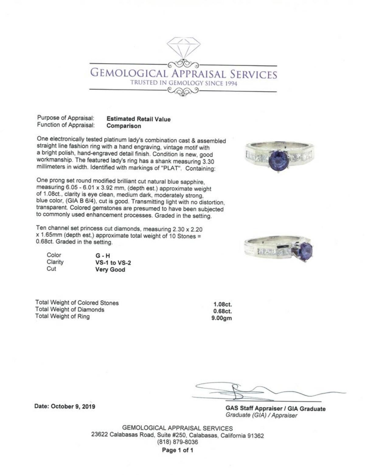 One electronically tested platinum lady's combination cast & assembled straight line fashion ring with a hand engraving, vintage motif with a bright polish, hand-engraved detail finish. The featured lady's ring has a shank measuring 3.30 millimeters in width. Identified with markings of 'PLAT'. Condition is new, good workmanship. Containing: One prong set round modified brilliant cut natural blue sapphire, measuring 6.05 - 6.01 x 3.92 mm, (depth est.) approximate weight of 1.08ct., clarity is eye clean, medium dark, moderately strong, blue color, (GIA B 6/4), cut is good. Transmitting light with no distortion, transparent. Colored gemstones are presumed to have been subjected to commonly used enhancement processes. Graded in the setting. Ten channel set princess cut diamonds, measuring 2.30 x 2.20 x 1.65mm (depth est.) approximate total weight of 10 Stones = 0.68ct. Graded in the setting. Color G - H Clarity VS-1 to VS-2 Cut Very Good. Total Weight of Colored Stones 1.08ct.. Total Weight of Diamonds 0.68ct.. Total Weight of Ring 9.00gm GAS Appraised at $4495.00. GAS Appraised.