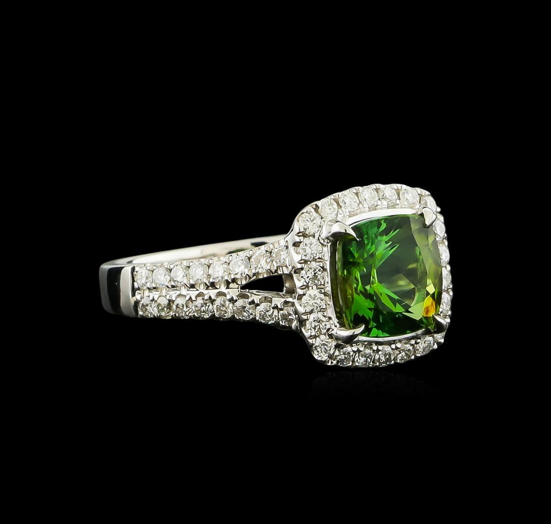 One electronically tested 14KT white gold lady's cast fashion ring with a split shank halo with a bright polish finish. The featured lady's ring has a shank measuring 2.42 millimeters wide. Identified with markings of "14K". Condition is new, good workmanship. Containing: One prong set square cushion modified brilliant cut natural green tourmaline, measuring 7.05 x 7.04 x 4.93mm, approximate weight of 1.76ct., clarity is slightly included, type I, medium dark, moderately strong, slightly yellowish green color, (GIA slyG 6/4), cut is very good. Transmitting light with a minimum of distortion, transparent. Colored gemstones are presumed to have been subjected to commonly used enhancement processes. Graded in the setting. Fifty-Four prong set round brilliant cut diamonds, measuring 1.40 - 1.35 x 0.86mm (depth est.) approximate total weight of 54 Stones = 0.54ct. Graded in the setting. Clarity: SI-1 to SI-2. Color: G - Good. Total Weight of Colored Stones 1.76ct. Total Weight of Diamonds 0.54ct. Total Weight of Ring 4.20gm GAS Appraised at $3,750.00.