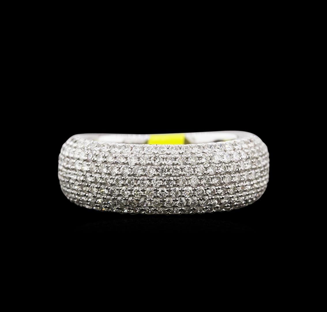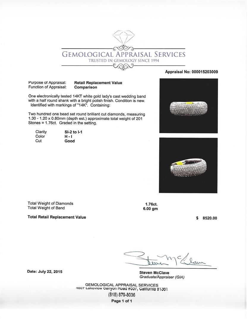 One electronically tested 14KT white gold lady's cast wedding band with a half round shank with a bright polish finish. Condition is new. Identified with markings of "14K". Containing: Two hundred one bead set round brilliant cut diamonds, measuring 1.30 - 1.20 x 0.80mm (depth est.) approximate total weight of 201 Stones = 1.76ct. Graded in the setting. Clarity: SI-2 to I-1. Color: H - I. Cut: Good. Total Weight of Diamonds: 1.76ct. Total Weight of Band: 6.00 gm. GAS Appraised at $8,520.00.