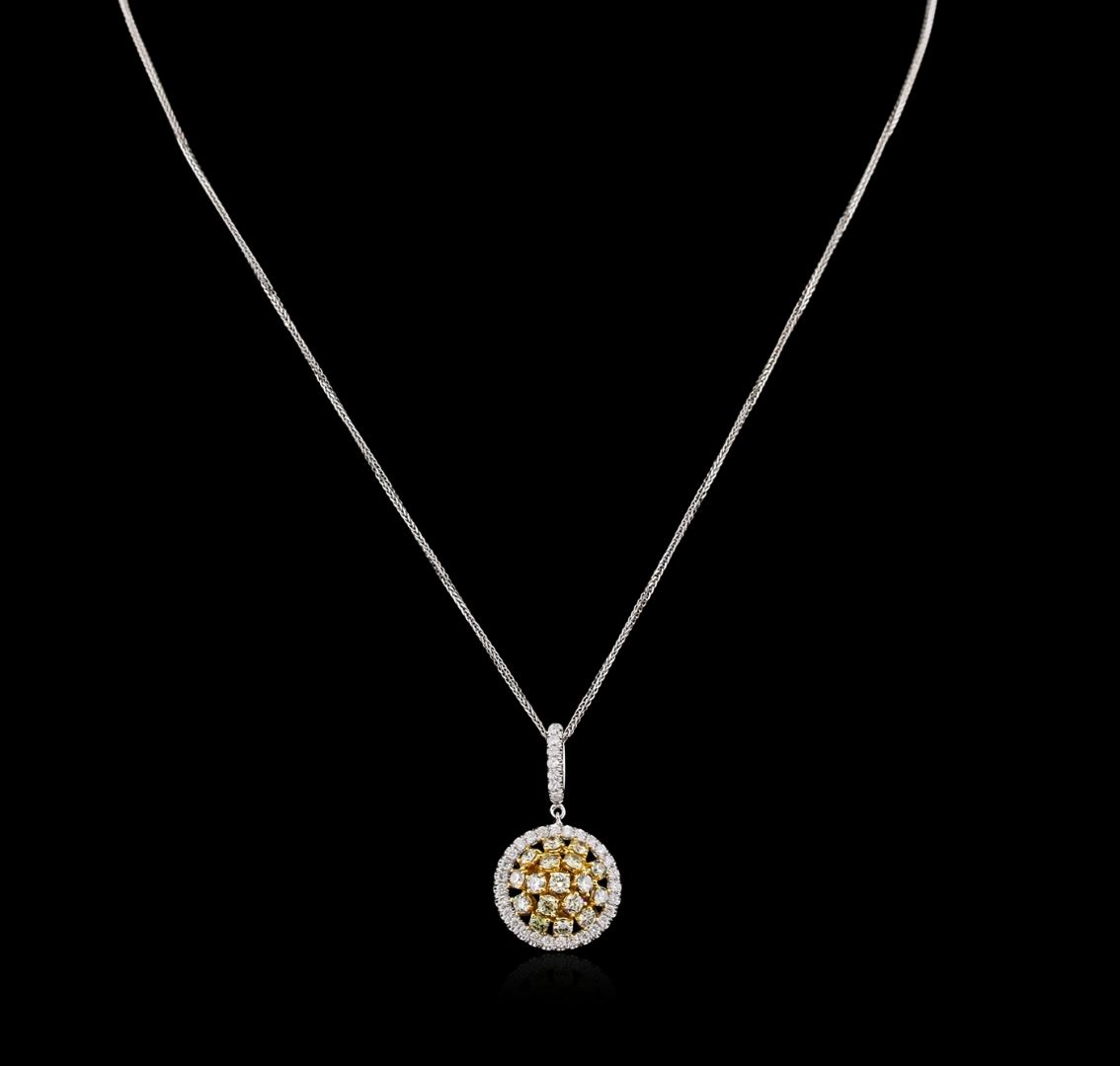 One electronically tested 14KT white and yellow gold lady's combination cast & assembled fashion pendant & chain 18.0" long, 1.2mm square wheat link with a spring ring clasp with a bright polish finish. Identified with markings of "14K". Condition is new, good workmanship. Containing: Seventeen prong set round brilliant cut diamonds, measuring 2.90 - 2.80 x 1.71mm (depth est.) approximate total weight of 17 Stones = 1.44ct. Colors range from fancy light yellow to fancy yellow. Colored gemstones are presumed to have been subjected to commonly used enhancement processes. Graded in the setting. Clarity VS-2 to SI-1 Thirty-Six split prong set round brilliant cut diamonds, measuring 1.40 - 1.30 x 0.81mm (depth est.) approximate total weight of 36 Stones = 0.32ct. Graded in the setting. Clarity SI-2 to I-1 Color G - Good Total Weight of Diamonds 1.76ct. Total Weight of Pendant & Chain 6.60gm GAS Appraised at $7,275.00.
