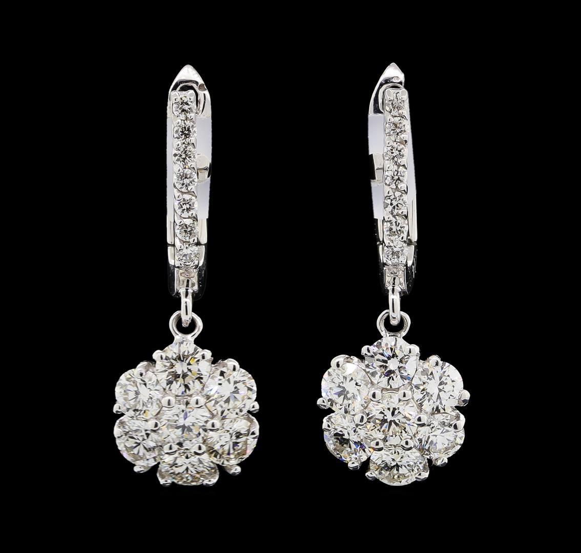 One pair electronically tested 14KT white gold lady's combination cast & assembled fashion dangle earrings with hinged, snap locking posts with a bright polish finish. The featured lady's dangle earrings have a drop of approximately 23.5 millimeters. Identified with markings of 'K14'. Condition is new, good workmanship. Containing: Fourteen prong set round brilliant cut diamonds, measuring 3.20 - 3.15 x 1.91mm (depth est.) approximate total weight of 14 Stones = 1.65ct. Graded in the setting. Clarity SI-1 to SI-2. Color: H - I Cut Good Fourteen prong set round brilliant cut diamonds, measuring 1.35 - 1.25 x 0.81mm (depth est.) approximate total weight of 14 Stones = 0.12ct. Graded in the setting. Clarity SI-1 to SI-2. Color: H - I Cut Good. Total Weight of Diamonds 1.77ct.. Total Weight of Earrings 3.70gm. GAS Appraised at $4,565.00.