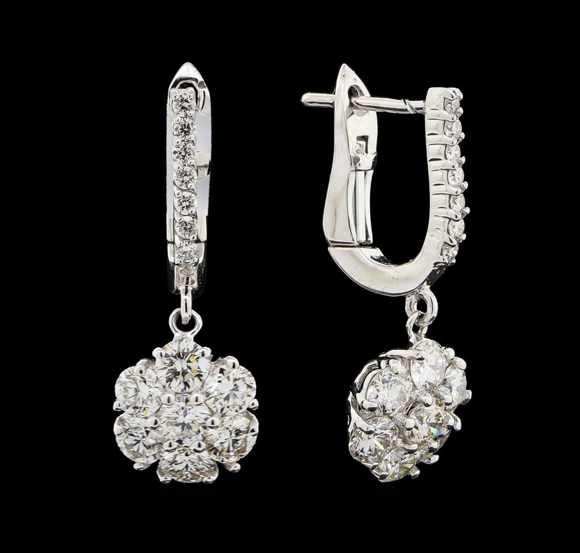 One pair electronically tested 14KT white gold lady's combination cast & assembled fashion dangle earrings with hinged, snap locking posts with a bright polish finish. The featured lady's dangle earrings have a drop of approximately 23.5 millimeters. Identified with markings of 'K14'. Condition is new, good workmanship. Containing: Fourteen prong set round brilliant cut diamonds, measuring 3.20 - 3.15 x 1.91mm (depth est.) approximate total weight of 14 Stones = 1.65ct. Graded in the setting. Clarity SI-1 to SI-2. Color: H - I Cut Good Fourteen prong set round brilliant cut diamonds, measuring 1.35 - 1.25 x 0.81mm (depth est.) approximate total weight of 14 Stones = 0.12ct. Graded in the setting. Clarity SI-1 to SI-2. Color: H - I Cut Good. Total Weight of Diamonds 1.77ct.. Total Weight of Earrings 3.70gm. GAS Appraised at $4,565.00.
