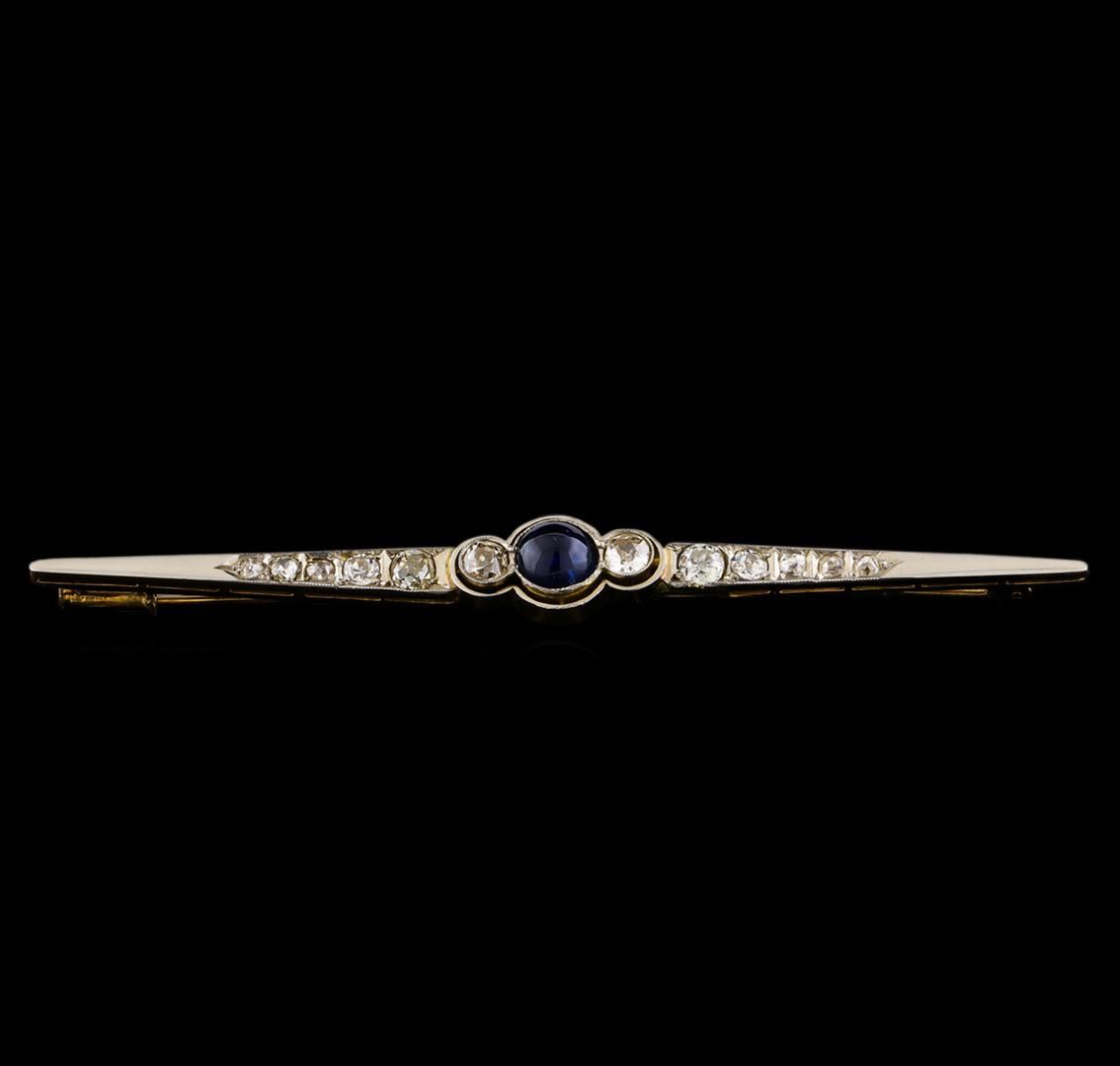 One electronically tested 14KT yellow and white gold ladies cast & assembled sapphire and diamond brooch. The three and one-half inch length brooch features a sapphire and diamond trio set within mirroring diamond ribbons, terminating in a horizontally/vertically placed pink. Bright polish finish with milgrain detailing. Condition is good. Containing: One bezel set round cabochon cut natural blue sapphire, measuring 6.60 x 6.50 x 3.60mm, approximate weight of 1.77ct., clarity is heavily included, type II, dark, very slightly grayish, blue color, (GIA B 7/3), cut is good. Transmitting light somewhat diffusely, transparent to translucent. Naturally occurring internal & external characteristics are present. Graded in the setting. Four prong & bezel set Old European cut diamonds, measuring 4.00 - 3.80 x 2.60mm (depth est.) approximate total weight of 4 Stones = 1.06ct. Cutting style circa early and late 19thcentury. The color grade reflects the entire range of color for this group. Graded in the setting. Clarity: SI-1 to SI-2. Color: G - K Two bead set Old European cut diamonds, measuring 3.10 - 3.00 x 1.90mm (depth est.) approximate total weight of 2 Stones = 0.24ct. Cutting style circa late 19th century. Graded in the setting. Clarity: SI-2. Color: H Six bead set Old European cut diamonds, measuring 2.50 - 2.10 x 1.50mm (depth est.) approximate total weight of 6 Stones = 0.35ct. Cutting style circa early and late 19th century. Graded in the setting. Clarity: SI-2 to I-1. Color: H - J. Total Weight of Colored Stones 1.77ct. Total Weight of Diamonds 1.65ct. Total Weight of Brooch 8.03gm. AIG Appraised at $6,645.00.