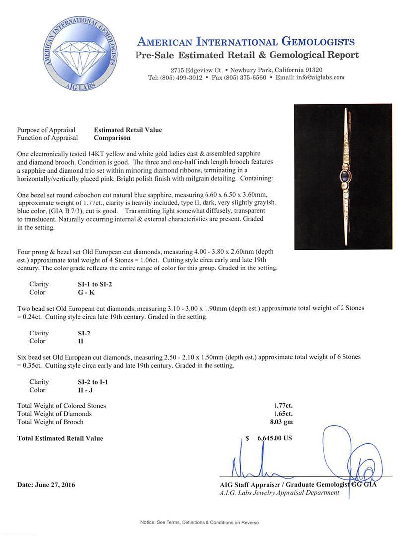 One electronically tested 14KT yellow and white gold ladies cast & assembled sapphire and diamond brooch. The three and one-half inch length brooch features a sapphire and diamond trio set within mirroring diamond ribbons, terminating in a horizontally/vertically placed pink. Bright polish finish with milgrain detailing. Condition is good. Containing: One bezel set round cabochon cut natural blue sapphire, measuring 6.60 x 6.50 x 3.60mm, approximate weight of 1.77ct., clarity is heavily included, type II, dark, very slightly grayish, blue color, (GIA B 7/3), cut is good. Transmitting light somewhat diffusely, transparent to translucent. Naturally occurring internal & external characteristics are present. Graded in the setting. Four prong & bezel set Old European cut diamonds, measuring 4.00 - 3.80 x 2.60mm (depth est.) approximate total weight of 4 Stones = 1.06ct. Cutting style circa early and late 19thcentury. The color grade reflects the entire range of color for this group. Graded in the setting. Clarity: SI-1 to SI-2. Color: G - K Two bead set Old European cut diamonds, measuring 3.10 - 3.00 x 1.90mm (depth est.) approximate total weight of 2 Stones = 0.24ct. Cutting style circa late 19th century. Graded in the setting. Clarity: SI-2. Color: H Six bead set Old European cut diamonds, measuring 2.50 - 2.10 x 1.50mm (depth est.) approximate total weight of 6 Stones = 0.35ct. Cutting style circa early and late 19th century. Graded in the setting. Clarity: SI-2 to I-1. Color: H - J. Total Weight of Colored Stones 1.77ct. Total Weight of Diamonds 1.65ct. Total Weight of Brooch 8.03gm. AIG Appraised at $6,645.00.