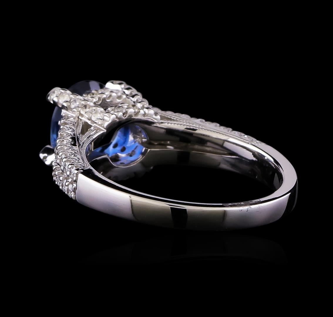 One electronically tested 18KT white gold ladies cast sapphire and diamond ring. The featured sapphire is supported by a diamond set under gallery and diamond set tapering shoulders, completed by a two millimeter wide band. Bright polish finish with milgrain detailing. Identified with markings of "18K 750". Condition is good. Containing: One prong set oval mixed cut natural blue sapphire, measuring 7.90 x 6.60 x 3.80mm, approximate weight of 1.77ct., clarity is slightly included, type II, medium dark, very slightly grayish, blue color, (GIA B 6/3), cut is good. Transmitting light with a minimum of distortion, transparent. Naturally occurring internal & external characteristics are present. Graded in the setting. Four channel set baguette cut (tapered) diamonds, measuring from 0.00 x 1.00 x 0.70mm (depth est.) to 3.20 x 1.40 x 0.98mm (depth est.) approximate total weight of 4 Stones = 0.12ct. Graded in the setting. Clarity: VVS-2 to VS-1. Color: G - I Sixty-Six prong set round brilliant cut diamonds, measuring 1.30 - 1.30 x 0.78mm (depth est.) approximate total weight of 66 Stones = 0.56ct. The clarity grade reflects the entire range of clarity for this group. Graded in the setting. Clarity: SI-1 to I-2. Color: G - I. Total Weight of Colored Stones 1.77ct. Total Weight of Diamonds 0.68ct. Total Weight of Ring 6.42gm. AIG Appraised at $6,840.00.