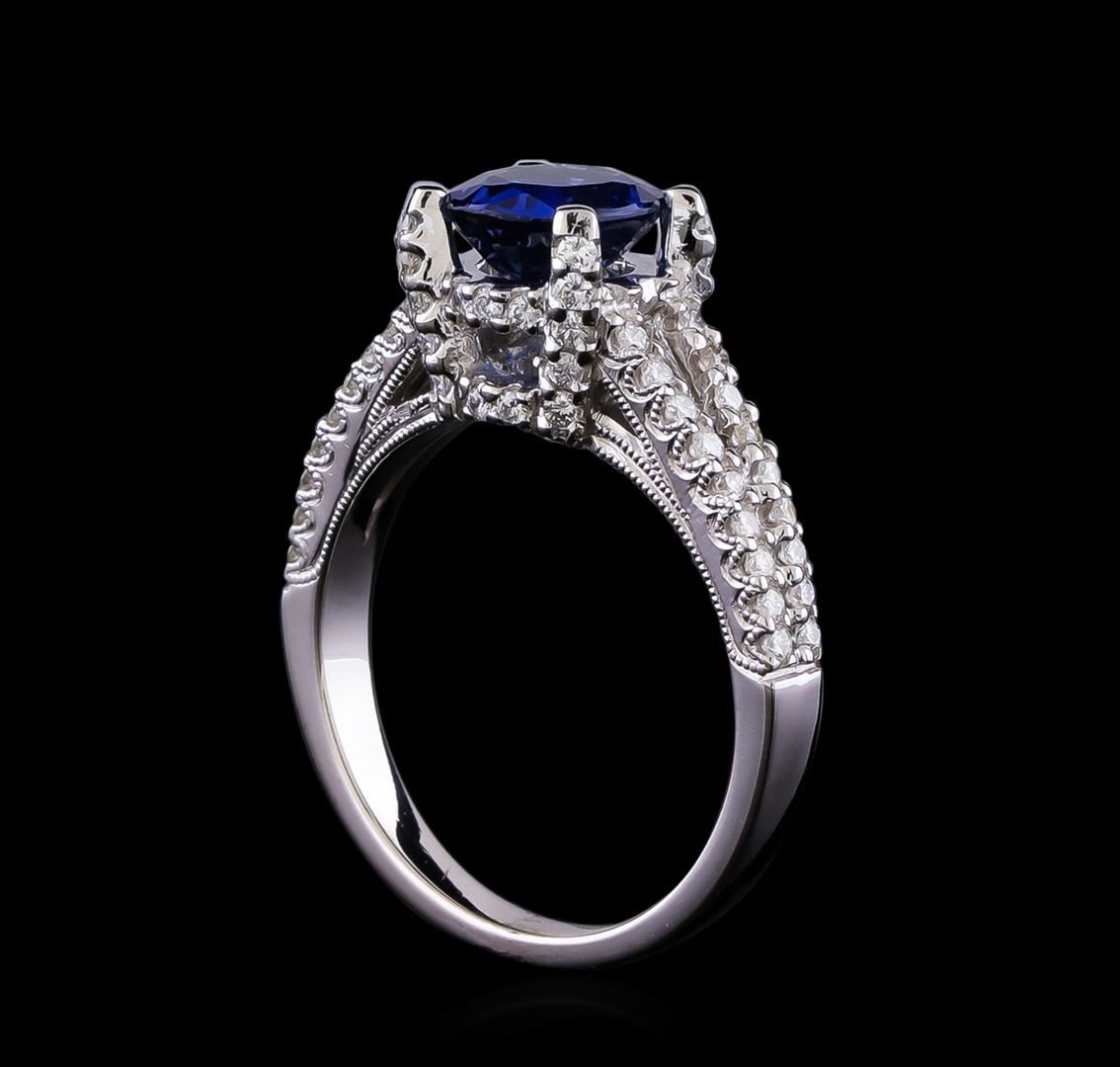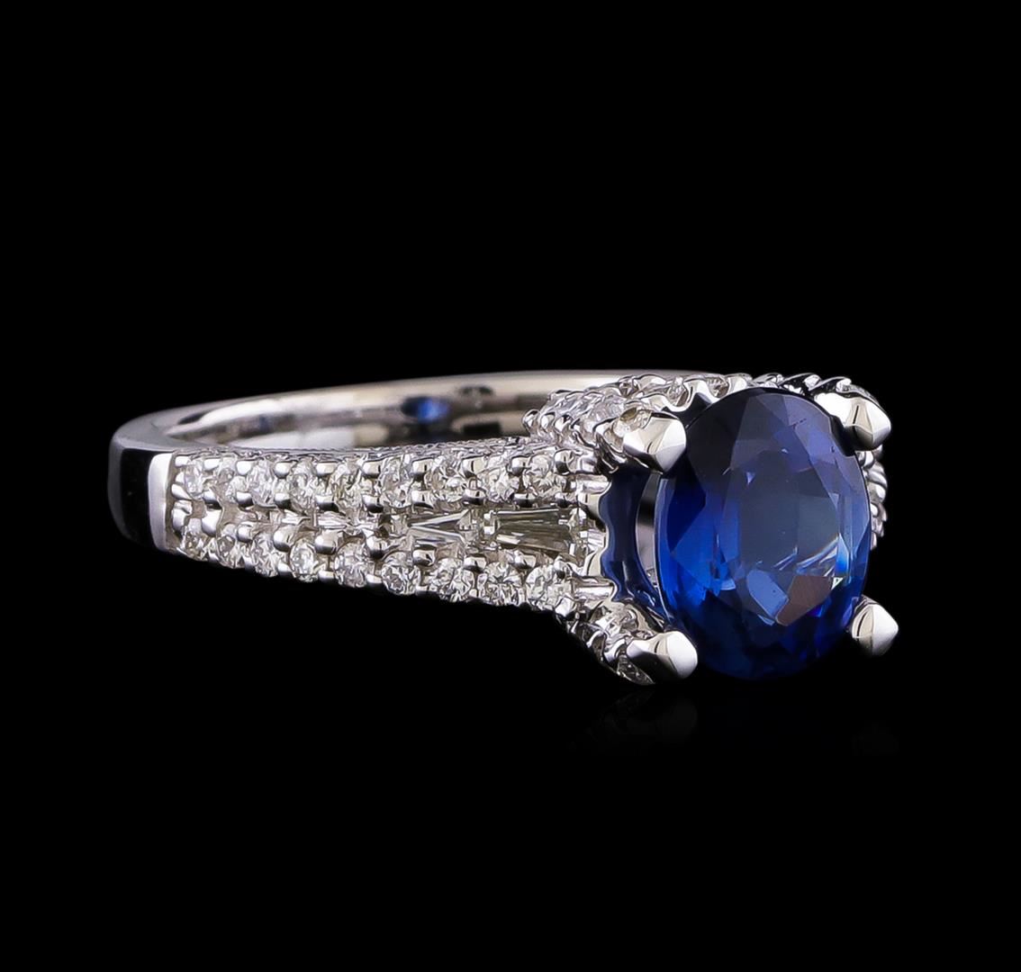 One electronically tested 18KT white gold ladies cast sapphire and diamond ring. The featured sapphire is supported by a diamond set under gallery and diamond set tapering shoulders, completed by a two millimeter wide band. Bright polish finish with milgrain detailing. Identified with markings of "18K 750". Condition is good. Containing: One prong set oval mixed cut natural blue sapphire, measuring 7.90 x 6.60 x 3.80mm, approximate weight of 1.77ct., clarity is slightly included, type II, medium dark, very slightly grayish, blue color, (GIA B 6/3), cut is good. Transmitting light with a minimum of distortion, transparent. Naturally occurring internal & external characteristics are present. Graded in the setting. Four channel set baguette cut (tapered) diamonds, measuring from 0.00 x 1.00 x 0.70mm (depth est.) to 3.20 x 1.40 x 0.98mm (depth est.) approximate total weight of 4 Stones = 0.12ct. Graded in the setting. Clarity: VVS-2 to VS-1. Color: G - I Sixty-Six prong set round brilliant cut diamonds, measuring 1.30 - 1.30 x 0.78mm (depth est.) approximate total weight of 66 Stones = 0.56ct. The clarity grade reflects the entire range of clarity for this group. Graded in the setting. Clarity: SI-1 to I-2. Color: G - I. Total Weight of Colored Stones 1.77ct. Total Weight of Diamonds 0.68ct. Total Weight of Ring 6.42gm. AIG Appraised at $6,840.00.