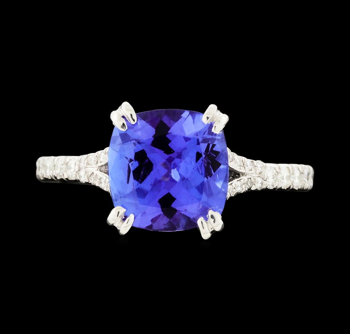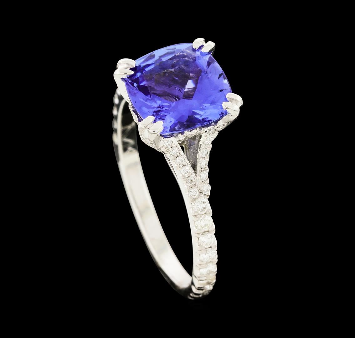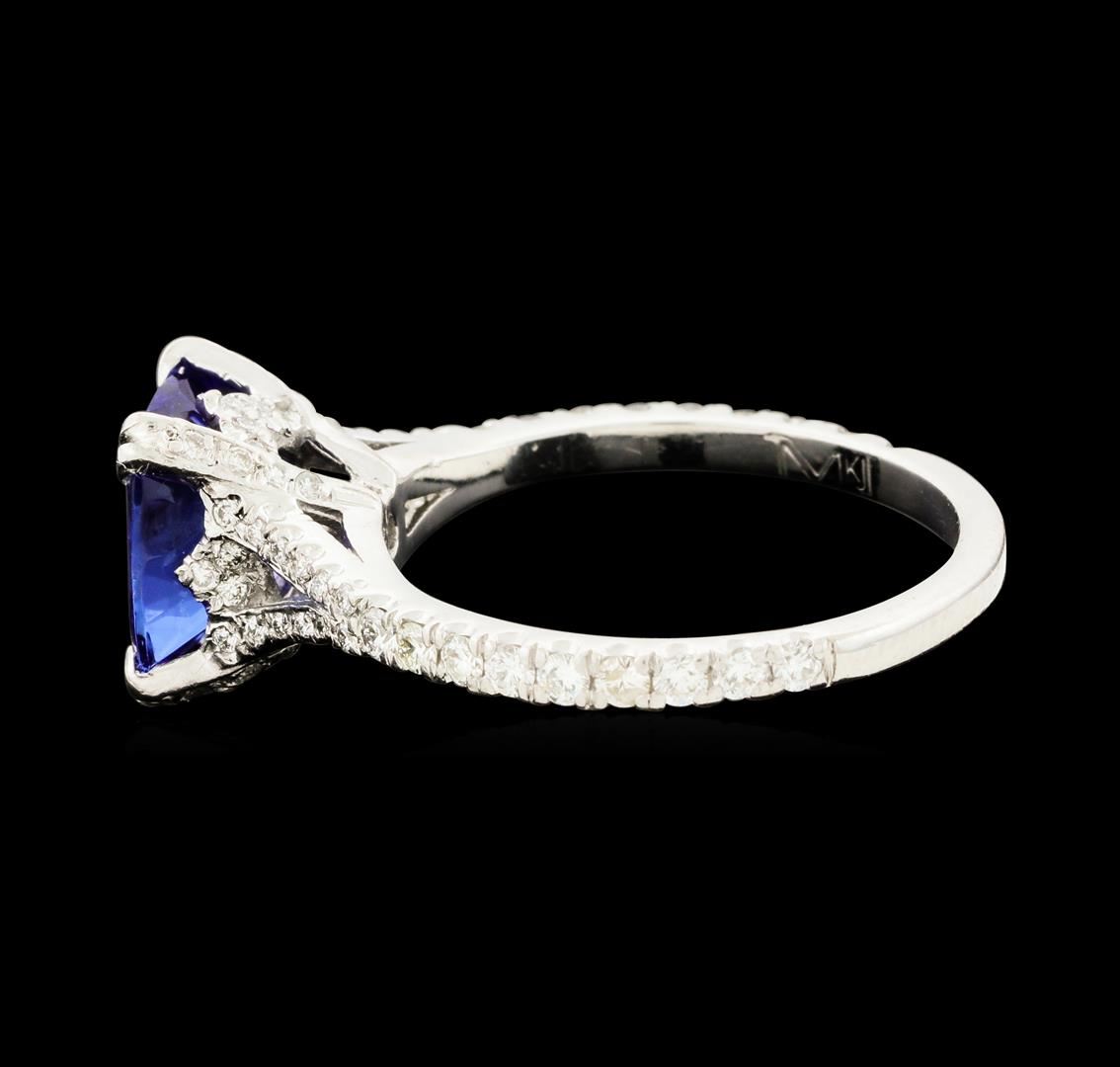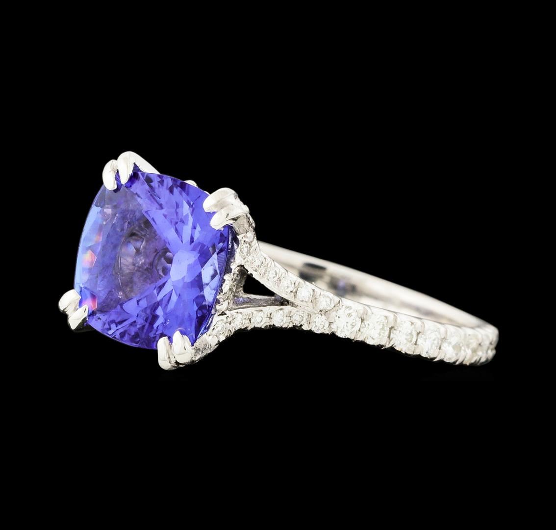 One electronically tested platinum lady's cast fashion ring with a split cathedral shank with a bright polish finish. The featured lady's ring has a shank measuring 1.60 millimeters wide. Identified with markings of 'PLAT'. Condition is new, good workmanship. Containing: One prong set square cushion modified brilliant cut natural tanzanite, measuring 7.80 x 7.74 x 4.20mm, (depth est.) approximate weight of 1.77ct., clarity is eye clean, medium, moderately strong, violetish blue color, (GIA vB 5/4), cut is very good. Transmitting light with no distortion, transparent. Colored gemstones are presumed to have been subjected to commonly used enhancement processes. Graded in the setting. Eighteen prong set round brilliant cut diamonds, measuring 1.50 - 1.40 x 0.90mm (depth est.) approximate total weight of 18 Stones = 0.21ct. Graded in the setting. Clarity VS-2 to SI-1. Color: G - H Cut Very Good Sixty-Two prong set round brilliant cut diamonds, measuring 1.10 - 1.00 x 0.65mm (depth est.) approximate total weight of 62 Stones = 0.29ct. Graded in the setting. Clarity VS-2 to SI-1. Color: G - H Cut Good. Total Weight of Colored Stones 1.77ct.. Total Weight of Diamonds 0.50ct.. Total Weight of Ring 4.00gm. GAS Appraised at $4,445.00.