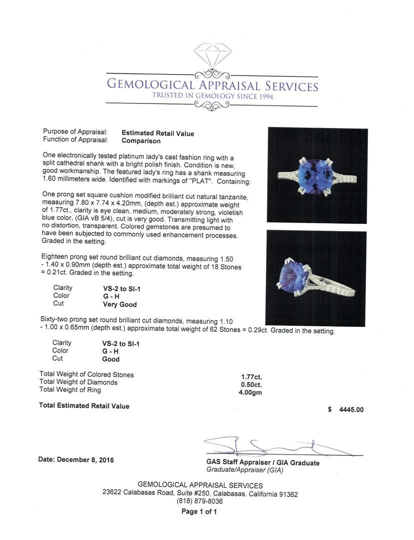 One electronically tested platinum lady's cast fashion ring with a split cathedral shank with a bright polish finish. The featured lady's ring has a shank measuring 1.60 millimeters wide. Identified with markings of 'PLAT'. Condition is new, good workmanship. Containing: One prong set square cushion modified brilliant cut natural tanzanite, measuring 7.80 x 7.74 x 4.20mm, (depth est.) approximate weight of 1.77ct., clarity is eye clean, medium, moderately strong, violetish blue color, (GIA vB 5/4), cut is very good. Transmitting light with no distortion, transparent. Colored gemstones are presumed to have been subjected to commonly used enhancement processes. Graded in the setting. Eighteen prong set round brilliant cut diamonds, measuring 1.50 - 1.40 x 0.90mm (depth est.) approximate total weight of 18 Stones = 0.21ct. Graded in the setting. Clarity VS-2 to SI-1. Color: G - H Cut Very Good Sixty-Two prong set round brilliant cut diamonds, measuring 1.10 - 1.00 x 0.65mm (depth est.) approximate total weight of 62 Stones = 0.29ct. Graded in the setting. Clarity VS-2 to SI-1. Color: G - H Cut Good. Total Weight of Colored Stones 1.77ct.. Total Weight of Diamonds 0.50ct.. Total Weight of Ring 4.00gm. GAS Appraised at $4,445.00.