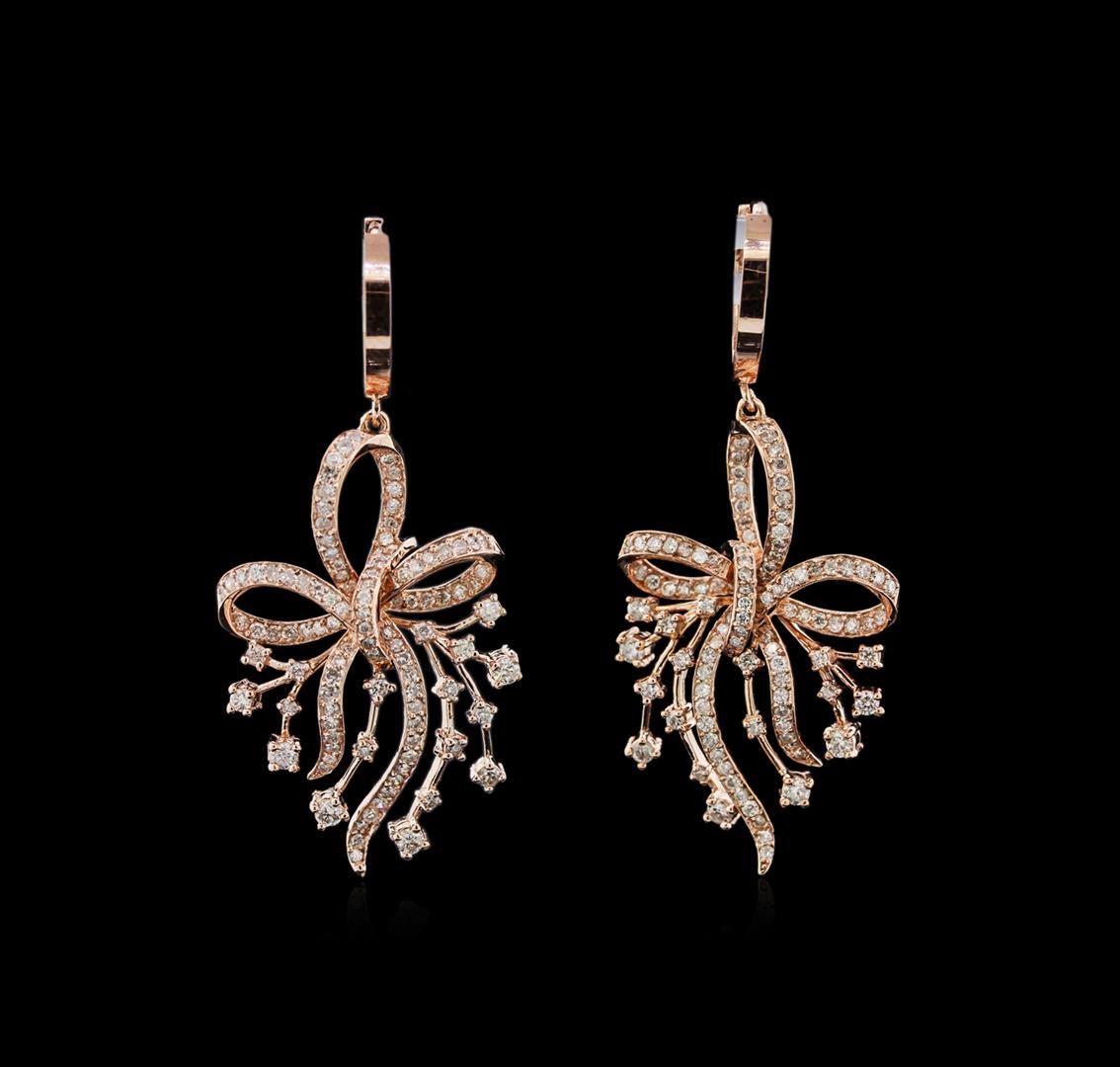 One pair electronically tested 14KT rose gold lady's combination cast & assembled fashion earrings with hinged clip backs with a bright polish finish. Identified with markings of "585". Condition is new, good workmanship. Containing: Fourteen prong set round brilliant cut diamonds, measuring 2.20 - 1.90 x 1.23mm (depth est.) approximate total weight of 14 Stones = 0.44ct. Graded in the setting. Clarity: SI-2 to I-1. Color: H - I. Cut Good One Hundred Ninety-Two prong set round brilliant cut diamonds, measuring 1.30 - 1.20 x 0.75mm (depth est.) approximate total weight of 192 Stones = 1.33ct. Graded in the setting. Clarity: SI-2 to I-1. Color: H - I. Cut Good. Total Weight of Diamonds 1.77ct. Total Weight of Earrings 9.20gm. GAS Appraised at $7,265.00.