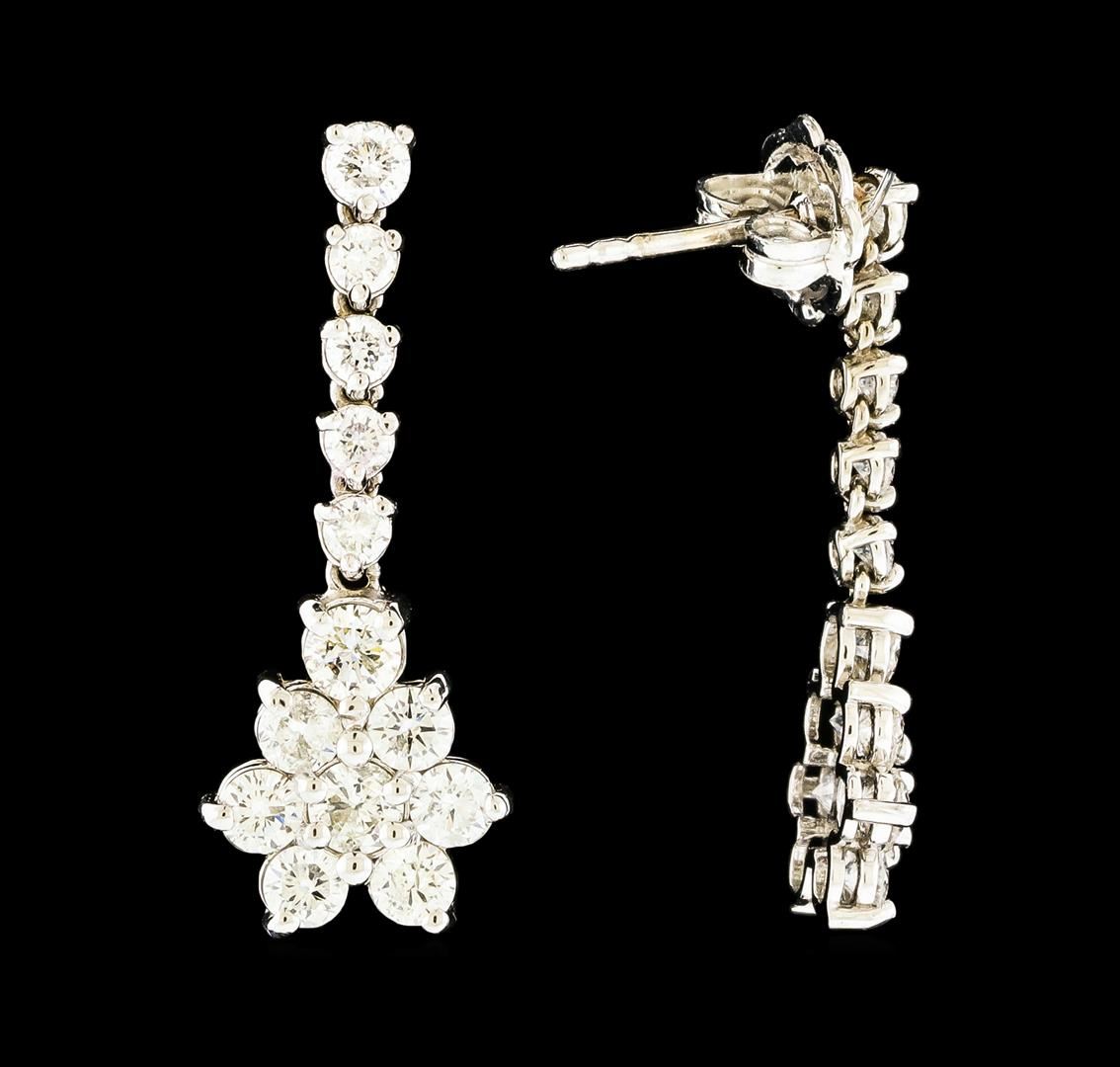 One pair electronically tested 14KT white gold lady's combination cast & assembled dangle flower design earrings with friction posts with a bright polish finish. The featured lady's earrings have a drop of approximately 26 millimeters. Identified with markings of '14K'. Condition is new, good workmanship. Containing: Four prong set round brilliant cut diamonds, measuring 3.10 - 3.00 x 1.86mm (depth est.) approximate total weight of 4 Stones = 0.42ct. Graded in the setting. Clarity SI-2 to I-1. Color: H - I Cut Good Fourteen prong set round brilliant cut diamonds, measuring 2.75 - 2.65 x 1.67mm (depth est.) approximate total weight of 14 Stones = 1.05ct. Graded in the setting. Clarity SI-1 to I-1. Color: G - H Cut Good Eight prong set round brilliant cut diamonds, measuring 2.20 - 2.15 x 1.35mm (depth est.) approximate total weight of 8 Stones = 0.31ct. Graded in the setting. Clarity SI-1 to SI-2. Color: H - I Cut Good. Total Weight of Diamonds 1.78ct.. Total Weight of Earrings 2.90gm. GAS Appraised at $4,120.00.