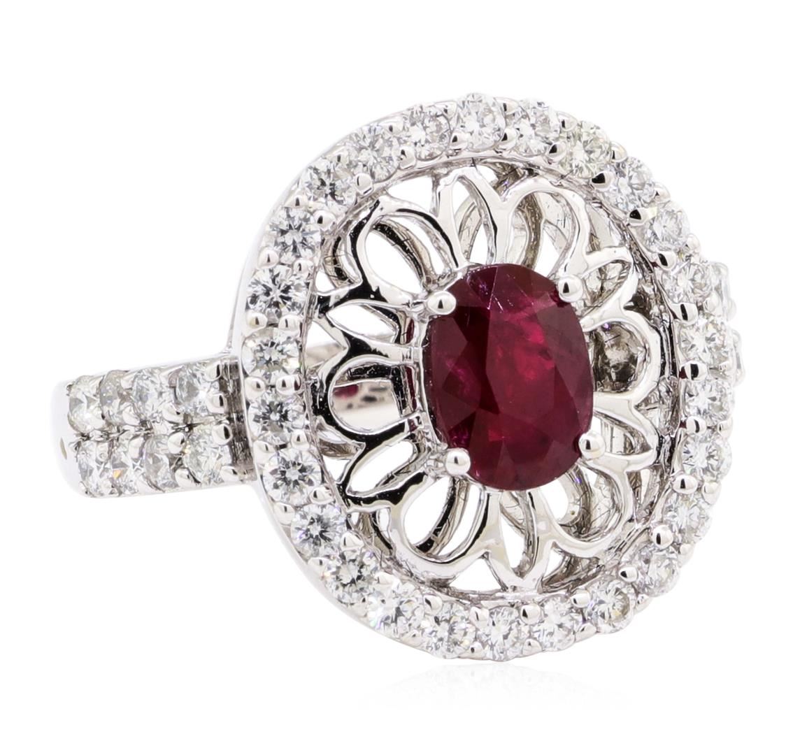 One electronically tested 14KT white gold lady's cast fashion ring with a double row oval halo with a bright polish finish. The featured lady's ring has a shank measuring 2.50 millimeters wide. Identified with markings of '14K'. Condition is new, good workmanship. Containing: One prong set oval modified mixed cut natural ruby, measuring 6.85 x 4.98 x 2.98mm, (depth est.) 5%. bulge factor, approximate weight of 0.93ct., clarity is heavily included, medium dark, moderately strong, red color, (GIA R 6/4), cut is good. Transmitting light somewhat diffusely, semi-transparent to translucent. Colored gemstones are presumed to have been subjected to commonly used enhancement processes. Graded in the setting. Forty prong set round brilliant cut diamonds, measuring 1.80 - 1.75 x 1.10mm (depth est.) approximate total weight of 40 Stones = 0.85ct. Graded in the setting. Color H - I Clarity SI-1 to SI-2 Cut Good. Total Weight of Colored Stones 0.93ct.. Total Weight of Diamonds 0.85ct.. Total Weight of Ring 6.30gm GAS Appraised at $4425.00. GAS Appraised.