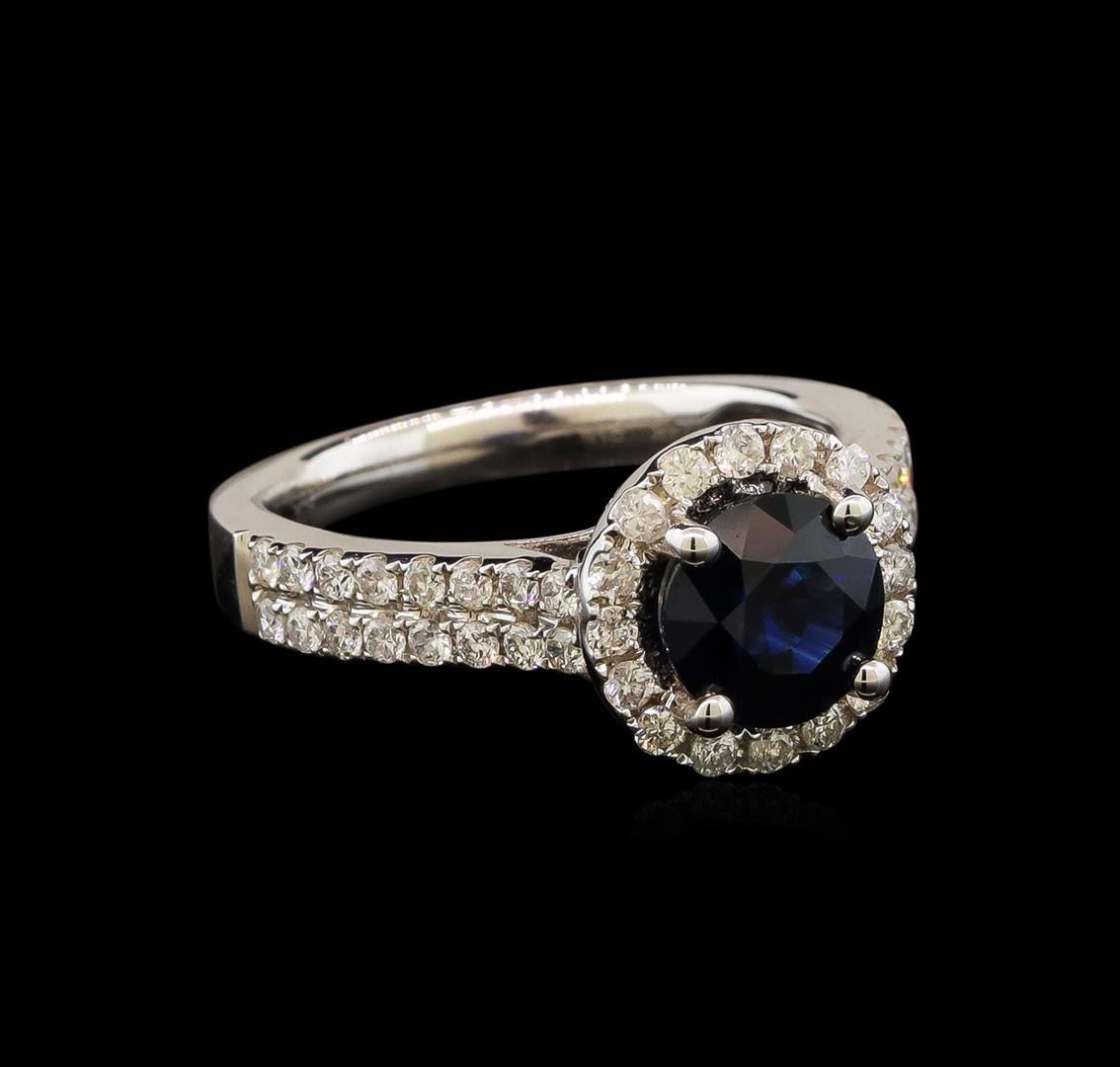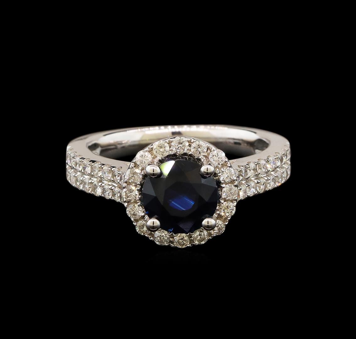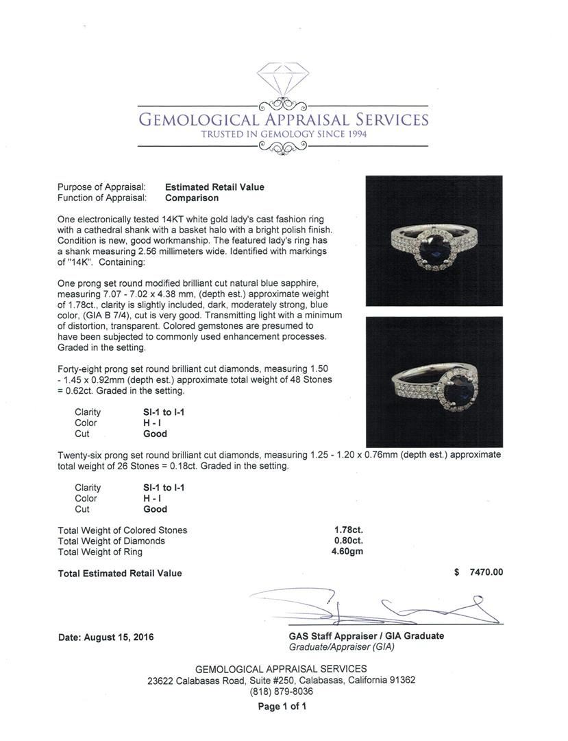 One electronically tested 14KT white gold lady's cast fashion ring with a cathedral shank with a basket halo with a bright polish finish. The featured lady's ring has a shank measuring 2.56 millimeters wide. Identified with markings of '14K'. Condition is new, good workmanship. Containing: One prong set round modified brilliant cut natural blue sapphire, measuring 7.07 - 7.02 x 4.38 mm, (depth est.) approximate weight of 1.78ct., clarity is slightly included, dark, moderately strong, blue color, (GIA B 7/4), cut is very good. Transmitting light with a minimum of distortion, transparent. Colored gemstones are presumed to have been subjected to commonly used enhancement processes. Graded in the setting. Forty-Eight prong set round brilliant cut diamonds, measuring 1.50 - 1.45 x 0.92mm (depth est.) approximate total weight of 48 Stones = 0.62ct. Graded in the setting. Clarity SI-1 to I-1. Color: H - I Cut Good Twenty-Six prong set round brilliant cut diamonds, measuring 1.25 - 1.20 x 0.76mm (depth est.) approximate total weight of 26 Stones = 0.18ct. Graded in the setting. Clarity SI-1 to I-1. Color: H - I Cut Good. Total Weight of Colored Stones 1.78ct.. Total Weight of Diamonds 0.80ct.. Total Weight of Ring 4.60gm. GAS Appraised at $7,470.00.