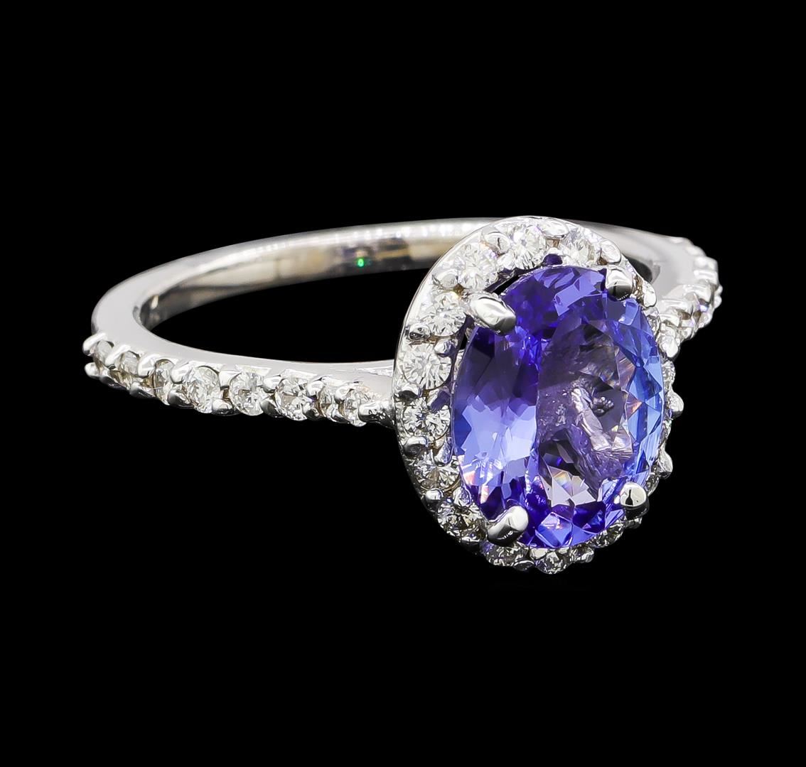 One electronically tested 14KT white gold lady's cast fashion ring with a cathedral shank with a basket halo with a bright polish finish. The featured lady's ring has a shank measuring 1.55 millimeters wide. Identified with markings of '14K'. Condition is new, good workmanship. Containing: One prong set oval modified brilliant cut natural tanzanite, measuring 9.53 x 7.44 x 3.77mm, (depth est.) approximate weight of 1.78ct., clarity is eye clean, medium, moderately strong, violetish blue color, (GIA vB 5/4), cut is very good. Transmitting light with no distortion, transparent. Colored gemstones are presumed to have been subjected to commonly used enhancement processes. Graded in the setting. Twenty-Eight prong set round brilliant cut diamonds, measuring 1.80 - 1.70 x 1.07mm (depth est.) approximate total weight of 28 Stones = 0.56ct. Graded in the setting. Clarity SI-1 to SI-2. Color: H - I Cut Good Four prong set round brilliant cut diamonds, measuring 1.40 - 1.35 x 0.86mm (depth est.) approximate total weight of 4 Stones = 0.04ct. Graded in the setting. Clarity SI-1 to I-1. Color: G - I Cut Good. Total Weight of Colored Stones 1.78ct.. Total Weight of Diamonds 0.60ct.. Total Weight of Ring 3.90gm. GAS Appraised at $4,520.00.