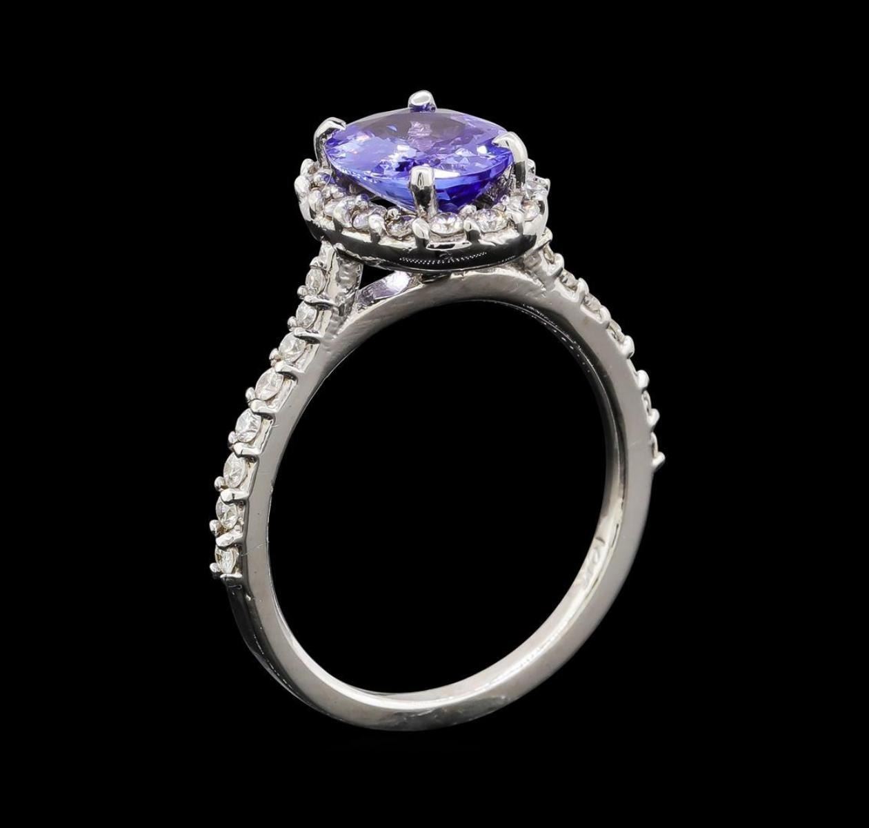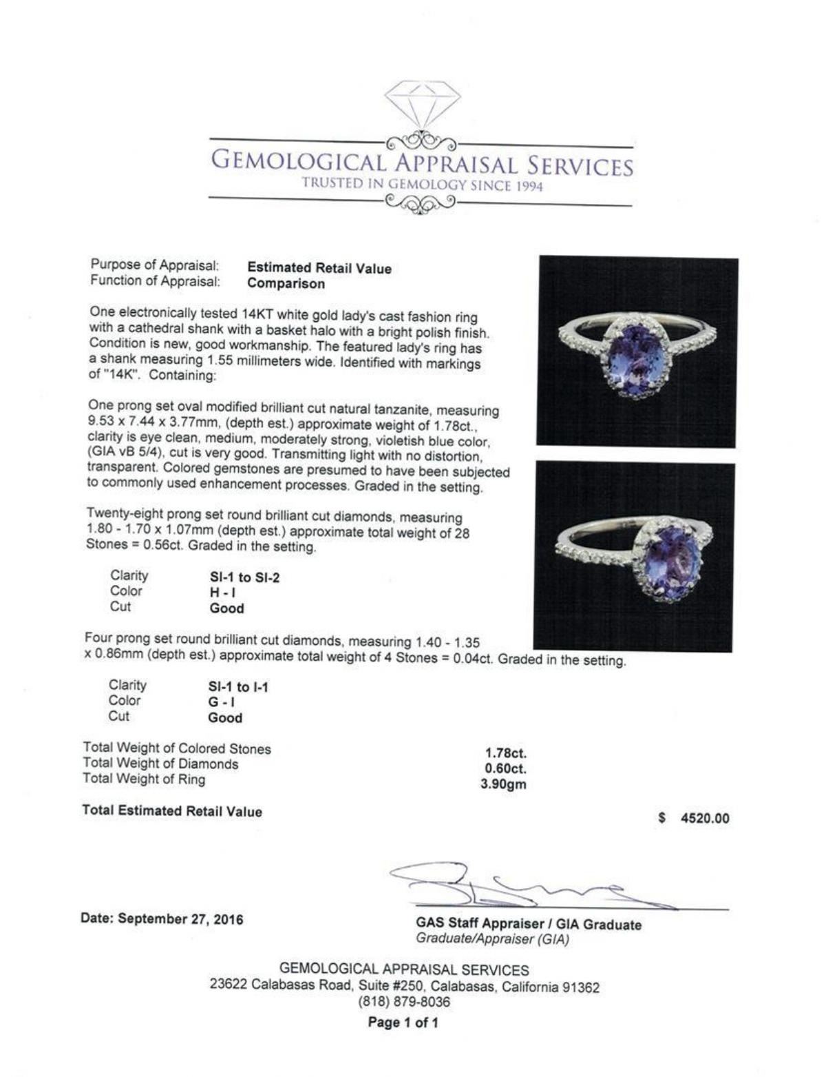 One electronically tested 14KT white gold lady's cast fashion ring with a cathedral shank with a basket halo with a bright polish finish. The featured lady's ring has a shank measuring 1.55 millimeters wide. Identified with markings of '14K'. Condition is new, good workmanship. Containing: One prong set oval modified brilliant cut natural tanzanite, measuring 9.53 x 7.44 x 3.77mm, (depth est.) approximate weight of 1.78ct., clarity is eye clean, medium, moderately strong, violetish blue color, (GIA vB 5/4), cut is very good. Transmitting light with no distortion, transparent. Colored gemstones are presumed to have been subjected to commonly used enhancement processes. Graded in the setting. Twenty-Eight prong set round brilliant cut diamonds, measuring 1.80 - 1.70 x 1.07mm (depth est.) approximate total weight of 28 Stones = 0.56ct. Graded in the setting. Clarity SI-1 to SI-2. Color: H - I Cut Good Four prong set round brilliant cut diamonds, measuring 1.40 - 1.35 x 0.86mm (depth est.) approximate total weight of 4 Stones = 0.04ct. Graded in the setting. Clarity SI-1 to I-1. Color: G - I Cut Good. Total Weight of Colored Stones 1.78ct.. Total Weight of Diamonds 0.60ct.. Total Weight of Ring 3.90gm. GAS Appraised.