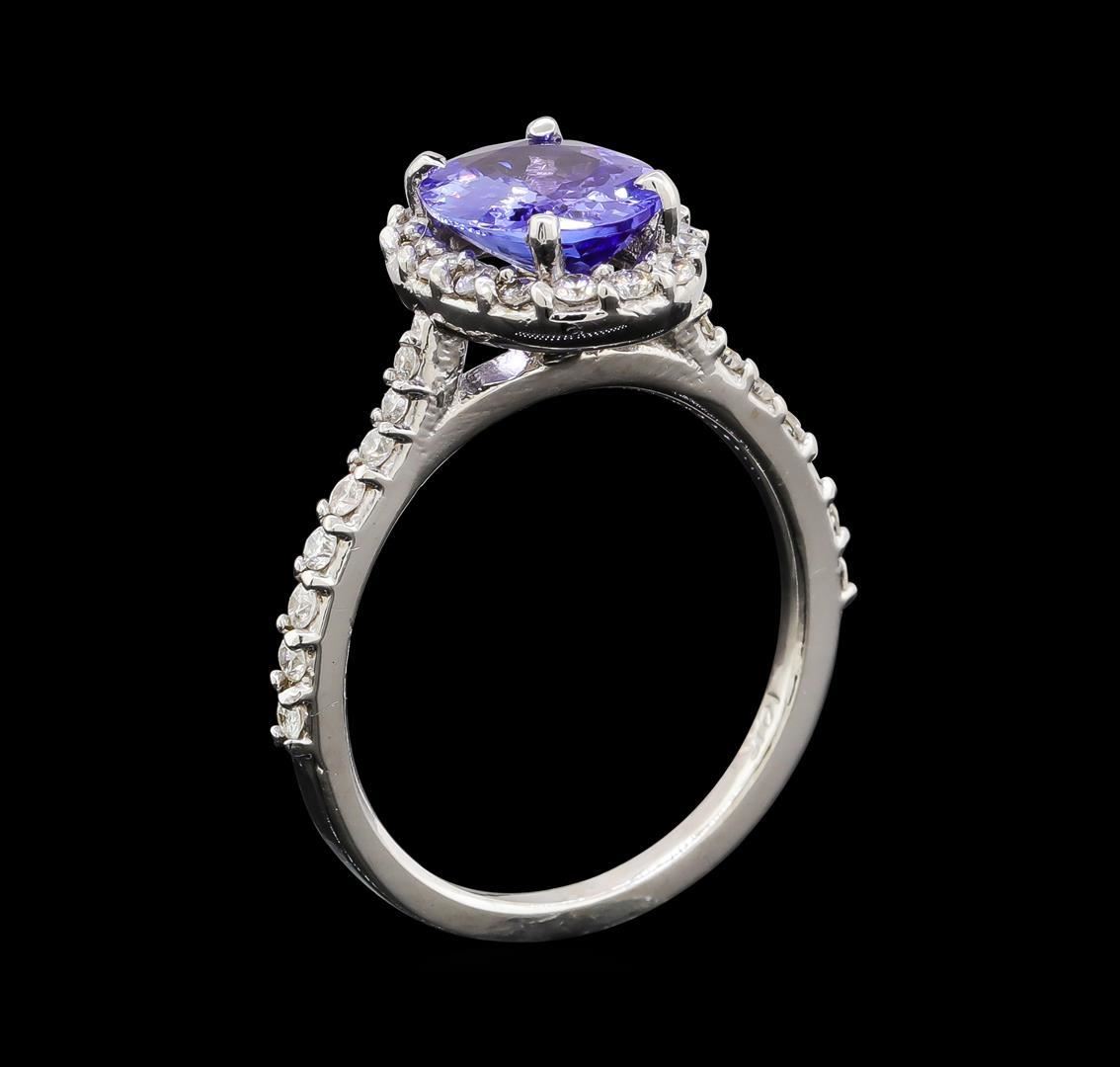 One electronically tested 14KT white gold lady's cast fashion ring with a cathedral shank with a basket halo with a bright polish finish. The featured lady's ring has a shank measuring 1.55 millimeters wide. Identified with markings of '14K'. Condition is new, good workmanship. Containing: One prong set oval modified brilliant cut natural tanzanite, measuring 9.53 x 7.44 x 3.77mm, (depth est.) approximate weight of 1.78ct., clarity is eye clean, medium, moderately strong, violetish blue color, (GIA vB 5/4), cut is very good. Transmitting light with no distortion, transparent. Colored gemstones are presumed to have been subjected to commonly used enhancement processes. Graded in the setting. Twenty-Eight prong set round brilliant cut diamonds, measuring 1.80 - 1.70 x 1.07mm (depth est.) approximate total weight of 28 Stones = 0.56ct. Graded in the setting. Clarity SI-1 to SI-2. Color: H - I Cut Good Four prong set round brilliant cut diamonds, measuring 1.40 - 1.35 x 0.86mm (depth est.) approximate total weight of 4 Stones = 0.04ct. Graded in the setting. Clarity SI-1 to I-1. Color: G - I Cut Good. Total Weight of Colored Stones 1.78ct.. Total Weight of Diamonds 0.60 ct.. Total Weight of Ring 3.90gm. GAS Appraised.