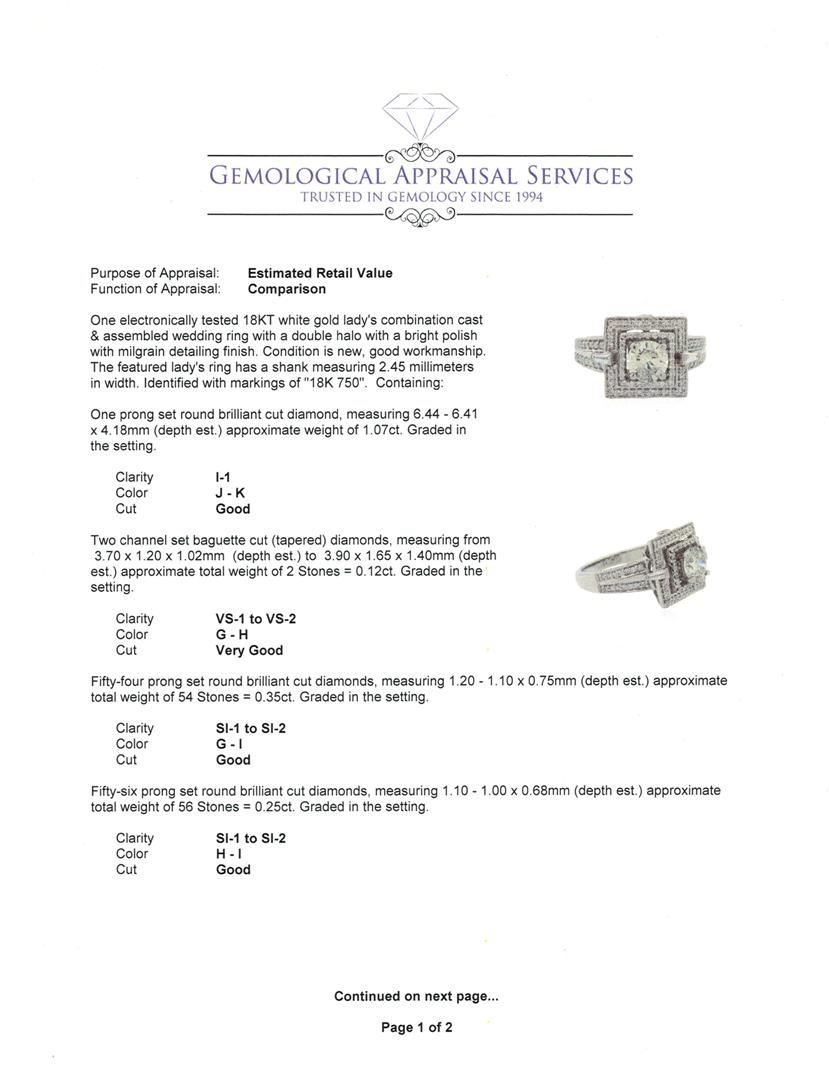 One electronically tested 18KT white gold lady's combination cast & assembled wedding ring with a double halo with a bright polish with milgrain detailing finish. The featured lady's ring has a shank measuring 2.45 millimeters in width. Identified with markings of "18K 750". Condition is new, good workmanship. Containing: One prong set round brilliant cut diamond, measuring 6.44 - 6.41 x 4.18mm (depth est.) approximate weight of 1.07ct. Graded in the setting. Clarity: I-1. Color: J - Good Two channel set baguette cut (tapered) diamonds, measuring from 3.70 x 1.20 x 1.02mm (depth est.) to 3.90 x 1.65 x 1.40mm (depth est.) approximate total weight of 2 Stones = 0.12ct. Graded in the setting. Clarity: VS-1 to VS-2. Color: G - Very Good Fifty-Four prong set round brilliant cut diamonds, measuring 1.20 - 1.10 x 0.75mm (depth est.) approximate total weight of 54 Stones = 0.35ct. Graded in the setting. Clarity: SI-1 to SI-2. Color: G - I. Cut Good Fifty-Six prong set round brilliant cut diamonds, measuring 1.10 - 1.00 x 0.68mm (depth est.) approximate total weight of 56 Stones = 0.25ct. Graded in the setting. Clarity: SI-1 to SI-2. Color: H - I. Cut Good. Total Weight of Diamonds 1.79ct. Total Weight of Ring 8.10gm. GAS Appraised at $12,025.00.