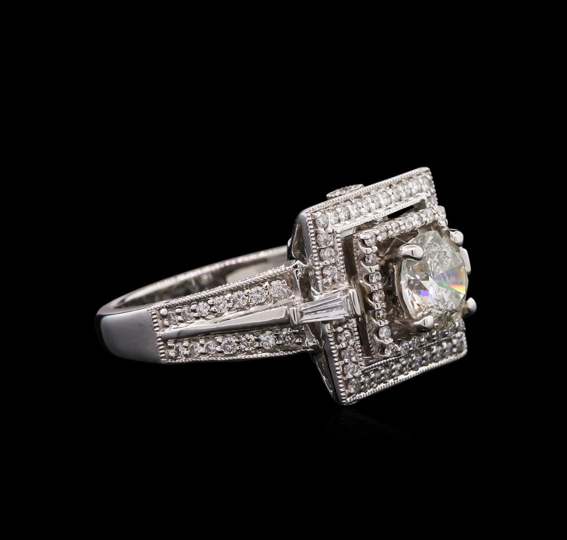 One electronically tested 18KT white gold lady's combination cast & assembled wedding ring with a double halo with a bright polish with milgrain detailing finish. The featured lady's ring has a shank measuring 2.45 millimeters in width. Identified with markings of "18K 750". Condition is new, good workmanship. Containing: One prong set round brilliant cut diamond, measuring 6.44 - 6.41 x 4.18mm (depth est.) approximate weight of 1.07ct. Graded in the setting. Clarity: I-1. Color: J - Good Two channel set baguette cut (tapered) diamonds, measuring from 3.70 x 1.20 x 1.02mm (depth est.) to 3.90 x 1.65 x 1.40mm (depth est.) approximate total weight of 2 Stones = 0.12ct. Graded in the setting. Clarity: VS-1 to VS-2. Color: G - Very Good Fifty-Four prong set round brilliant cut diamonds, measuring 1.20 - 1.10 x 0.75mm (depth est.) approximate total weight of 54 Stones = 0.35ct. Graded in the setting. Clarity: SI-1 to SI-2. Color: G - I. Cut Good Fifty-Six prong set round brilliant cut diamonds, measuring 1.10 - 1.00 x 0.68mm (depth est.) approximate total weight of 56 Stones = 0.25ct. Graded in the setting. Clarity: SI-1 to SI-2. Color: H - I. Cut Good. Total Weight of Diamonds 1.79ct. Total Weight of Ring 8.10gm. GAS Appraised at $12,025.00.