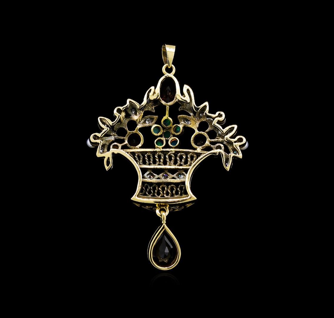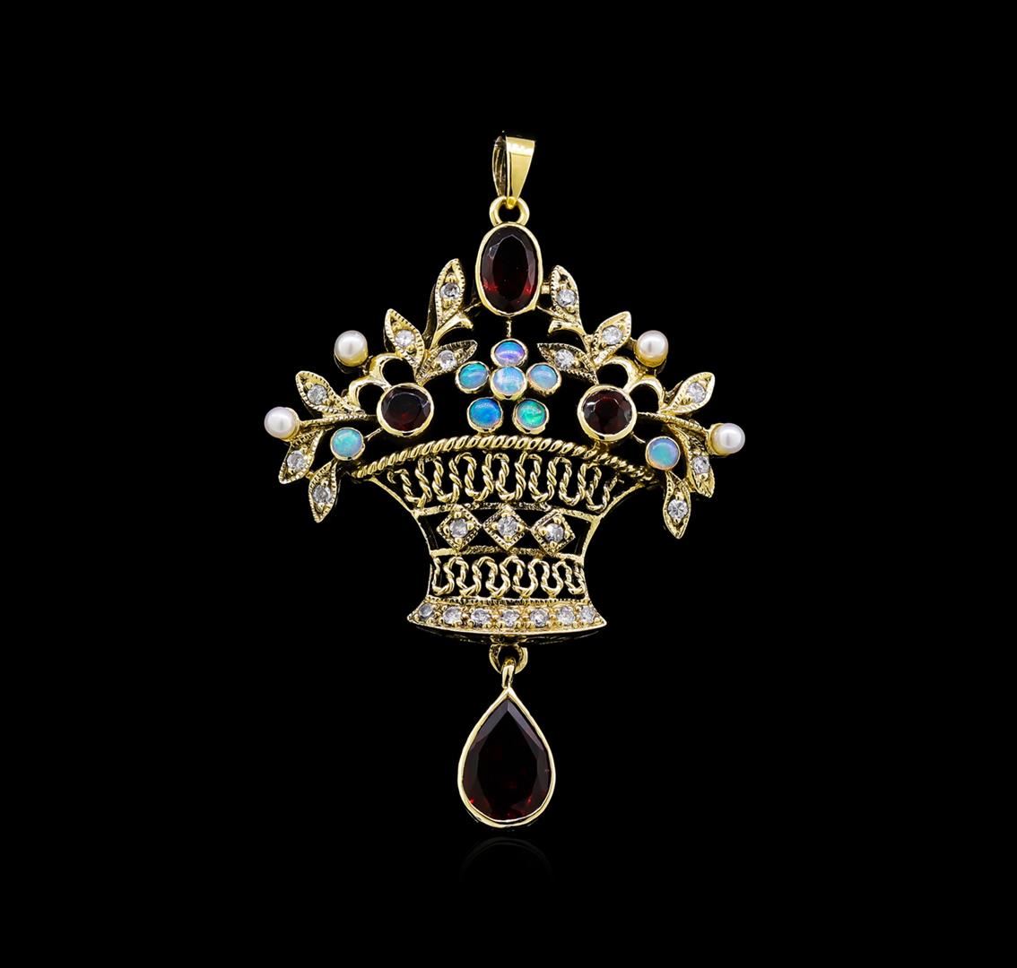 One pendant featuring: 18KT yellow gold weighing 5.50 grams containing garnets with a total weight of 1.79ct, opals with a total weight of 0.12ct, pearls, diamonds with total weight 0.20ct.