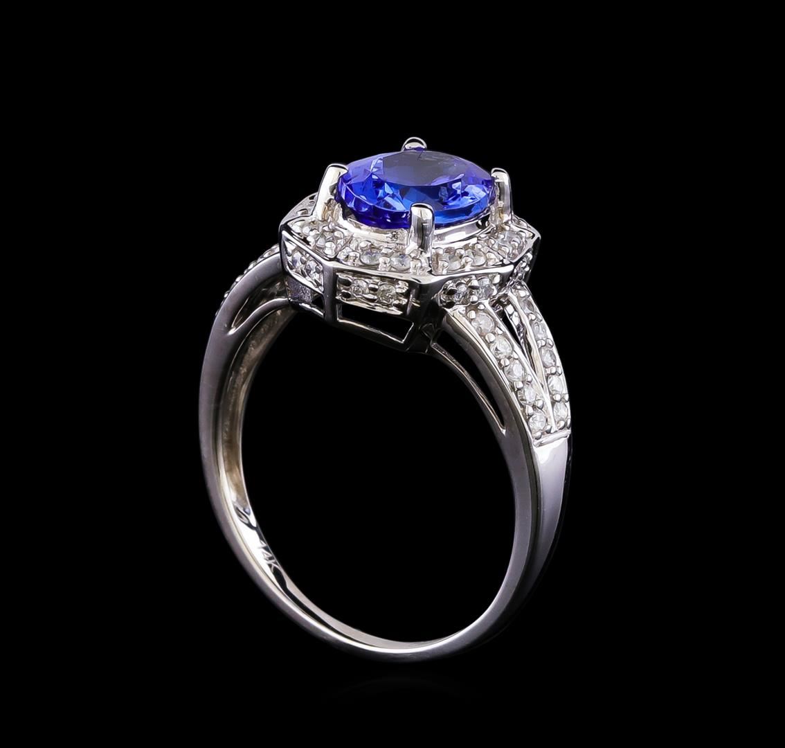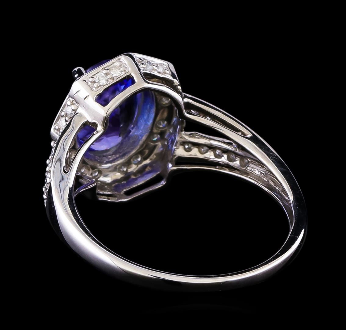 One electronically tested 14KT white gold ladies cast tanzanite and diamond ring with a bright polish finish. The featured tanzanite is set within a stylized diamond bezel supported by diamond set split shoulders, completed by a one and one-half millimeter wide band. Trademark is Orianne. Identified with markings of "14K". Condition is new, good workmanship. Containing: One prong set oval mixed cut natural tanzanite approximate weight of 1.79ct., clarity is slightly included, type I, medium dark, very slightly grayish, bluish violet color, (GIA bV 6/3), cut is good. Transmitting light with a minimum of distortion, transparent. Naturally occurring internal & external characteristics are present. Graded in the setting. Tanzanite is a very rare gemstone that is only found in the country of Tanzania. Originally discovered in 1967. Tiffany & Company, named the stone Tanzanite. It is found in the Usumburu Mountains that border the Umba Valley of northern Tanzania. Tanzanite occurs in gray, brown, violet, blue, reddish-purple, & green. The gem is interesting because of its exceptional pleochroism. Rotated in different directions a tanzanite will exhibit multiple changes of color. Tanzanite has a low tolerance to ultrasonic cleaning, and should not be cleaned using this method. Fifty-Two prong set round brilliant cut diamonds approximate total weight of 52 Stones = 0.34ct. Graded in the setting. Clarity: I-2 to I-3. Color: H - J. Total Weight of Colored Stones 1.79ct. Total Weight of Diamonds 0.34ct. Total Weight of Ring 3.49gm. AIG Appraised at $4,550.00.