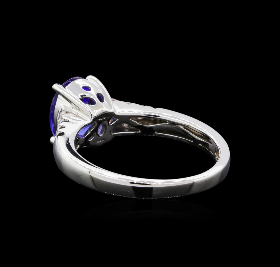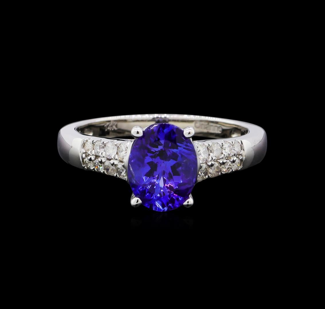 One electronically tested 14KT white gold ladies cast tanzanite and diamond ring with a bright polish finish. The featured cathedral set tanzanite is supported by diamond set shoulders, completed by a two millimeter wide band. Trademark is Orianne. Identified with markings of "14K". Condition is new, good workmanship. Containing: One prong set oval mixed cut natural tanzanite approximate weight of 1.79ct., clarity is slightly included, type I, medium dark, very slightly grayish, violetish blue color, (GIA vB 6/3), cut is good. Transmitting light with a minimum of distortion, transparent. Naturally occurring internal & external characteristics are present. Graded in the setting. Tanzanite is a very rare gemstone that is only found in the country of Tanzania. Originally discovered in 1967. Tiffany & Company, named the stone Tanzanite. It is found in the Usumburu Mountains that border the Umba Valley of northern Tanzania. Tanzanite occurs in gray, brown, violet, blue, reddish-purple, & green. The gem is interesting because of its exceptional pleochroism. Rotated in different directions a tanzanite will exhibit multiple changes of color. Tanzanite has a low tolerance to ultrasonic cleaning, and should not be cleaned using this method. Sixteen prong set round brilliant cut diamonds approximate total weight of 16 Stones = 0.31ct. Graded in the setting. Clarity: I-1 to I-2. Color: G - I. Total Weight of Colored Stones 1.79ct. Total Weight of Diamonds 0.31ct. Total Weight of Ring 4.38gm. AIG Appraised at $4,730.00.