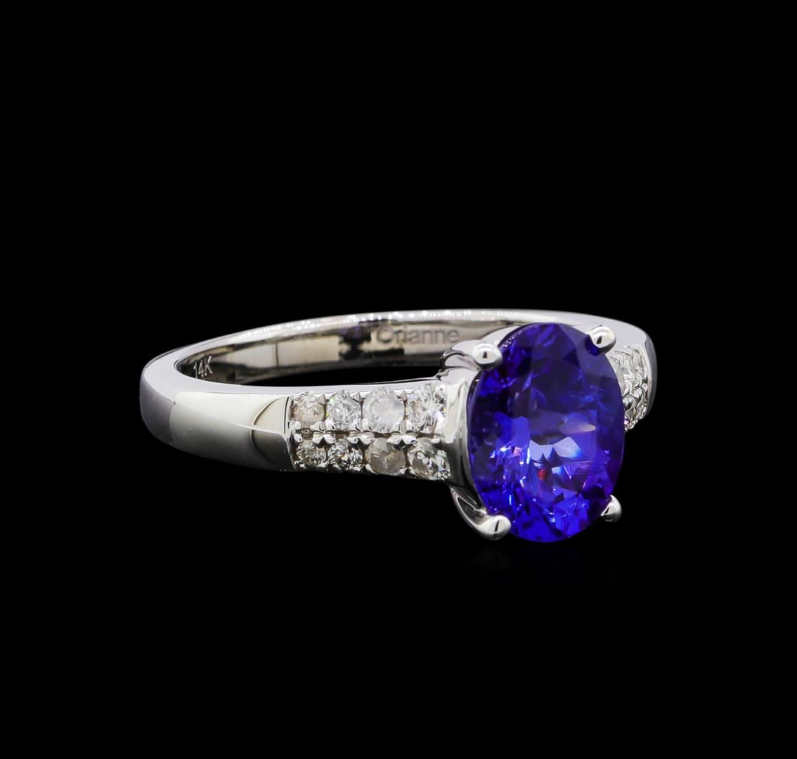 One electronically tested 14KT white gold ladies cast tanzanite and diamond ring with a bright polish finish. The featured cathedral set tanzanite is supported by diamond set shoulders, completed by a two millimeter wide band. Trademark is Orianne. Identified with markings of "14K". Condition is new, good workmanship. Containing: One prong set oval mixed cut natural tanzanite approximate weight of 1.79ct., clarity is slightly included, type I, medium dark, very slightly grayish, violetish blue color, (GIA vB 6/3), cut is good. Transmitting light with a minimum of distortion, transparent. Naturally occurring internal & external characteristics are present. Graded in the setting. Tanzanite is a very rare gemstone that is only found in the country of Tanzania. Originally discovered in 1967. Tiffany & Company, named the stone Tanzanite. It is found in the Usumburu Mountains that border the Umba Valley of northern Tanzania. Tanzanite occurs in gray, brown, violet, blue, reddish-purple, & green. The gem is interesting because of its exceptional pleochroism. Rotated in different directions a tanzanite will exhibit multiple changes of color. Tanzanite has a low tolerance to ultrasonic cleaning, and should not be cleaned using this method. Sixteen prong set round brilliant cut diamonds approximate total weight of 16 Stones = 0.31ct. Graded in the setting. Clarity: I-1 to I-2. Color: G - I. Total Weight of Colored Stones 1.79ct. Total Weight of Diamonds 0.31ct. Total Weight of Ring 4.38gm. AIG Appraised at $4,730.00.