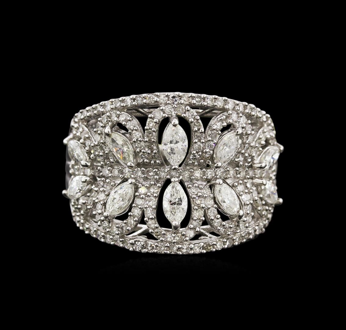 One electronically tested 14KT white gold lady's cast fashion ring with a tapered shank with a bright polish finish. Condition is new. Identified with markings of "14KT". Containing: Ten prong set marquise shaped cut diamonds, measuring 4.00 x 2.50 x 1.58mm (depth est.) approximate total weight of 10 Stones = 0.94ct. Graded in the setting. Clarity: SI-2. Color: H - I. Cut: Good. Total weight of Diamonds: 1.79ct. Total Weight of Ring: 6.50 gm. GAS Appraised at $7,665.00.
