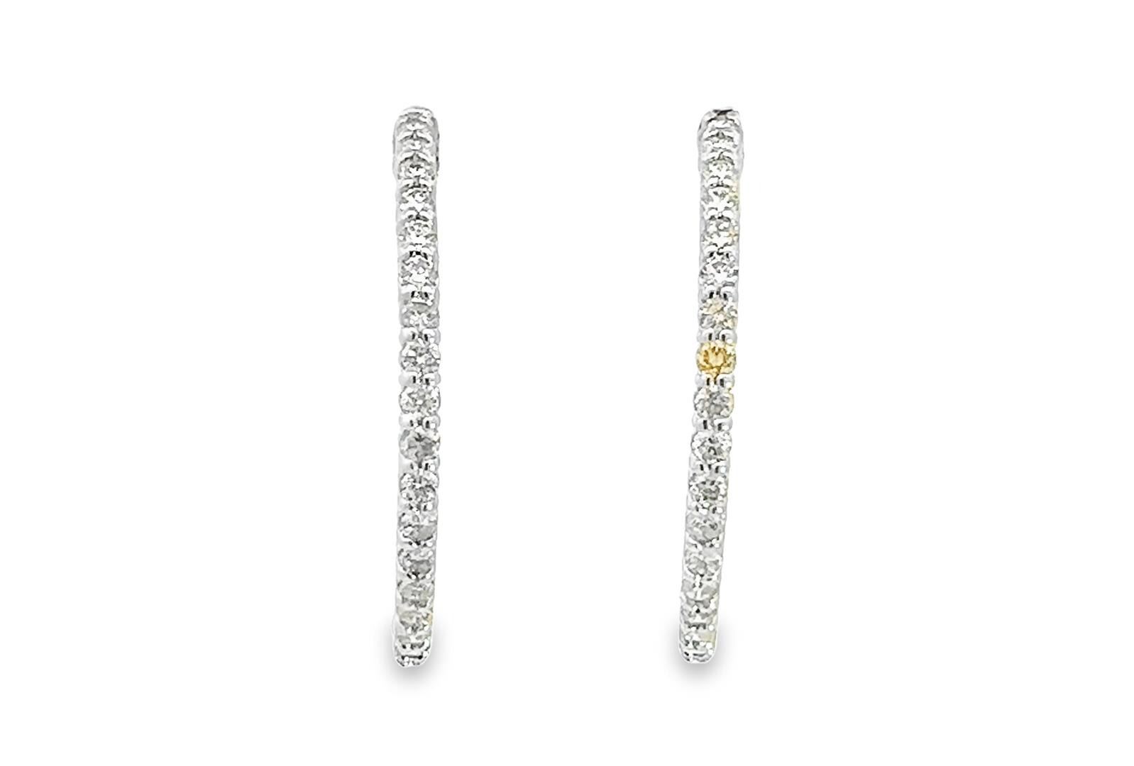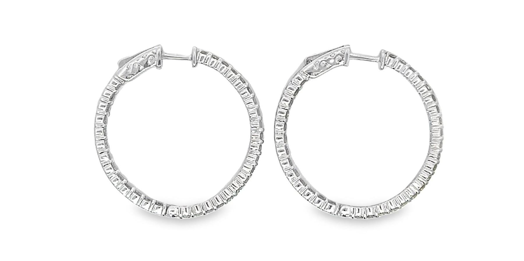 One pair electronically tested 14KT white gold lady's combination cast & assembled fashion inside-out hoop earrings with a bright polish finish. The featured hoop earring has a diameter of 30 millimeter. Identified with markings of "14K". Condition is new, good workmanship.Containing: Sixty-Six prong set round brilliant cut diamonds, measuring 1.90 - 1.85 x 1.22mm (depth est.) approximate total weight of 66 Stones = 1.80ct. Graded in the setting.Color I - JClarity VS-2 to SI-1 Cut Very Good Total Weight of Diamonds 1.80ct. Total Weight of Earrings 7.40gm Estimated Retail Value 7140