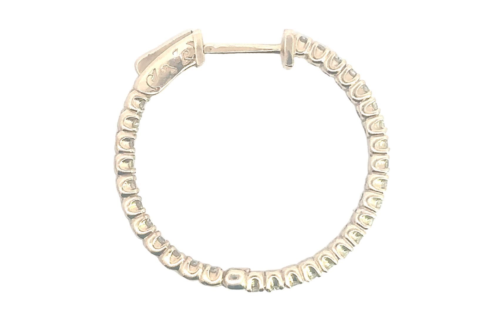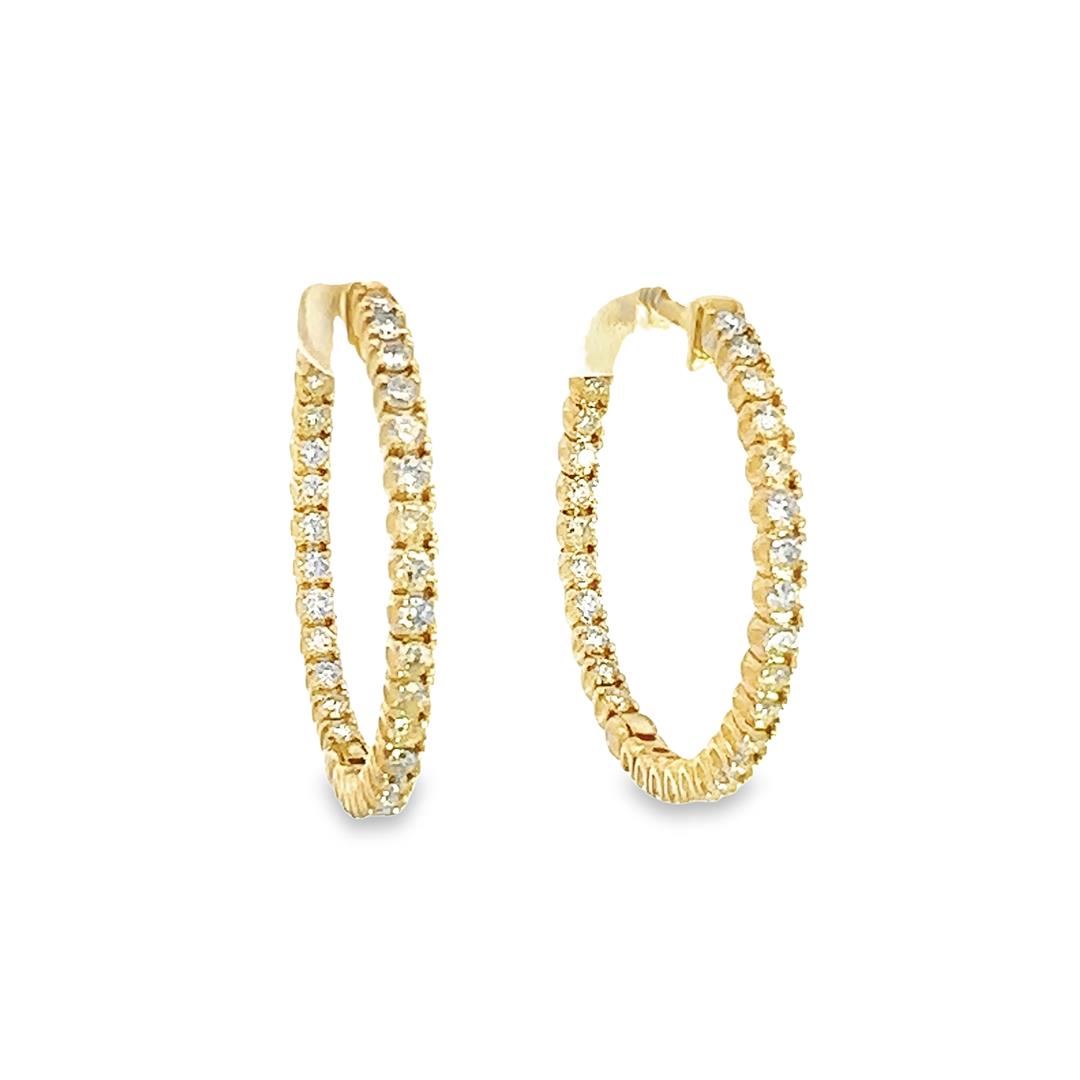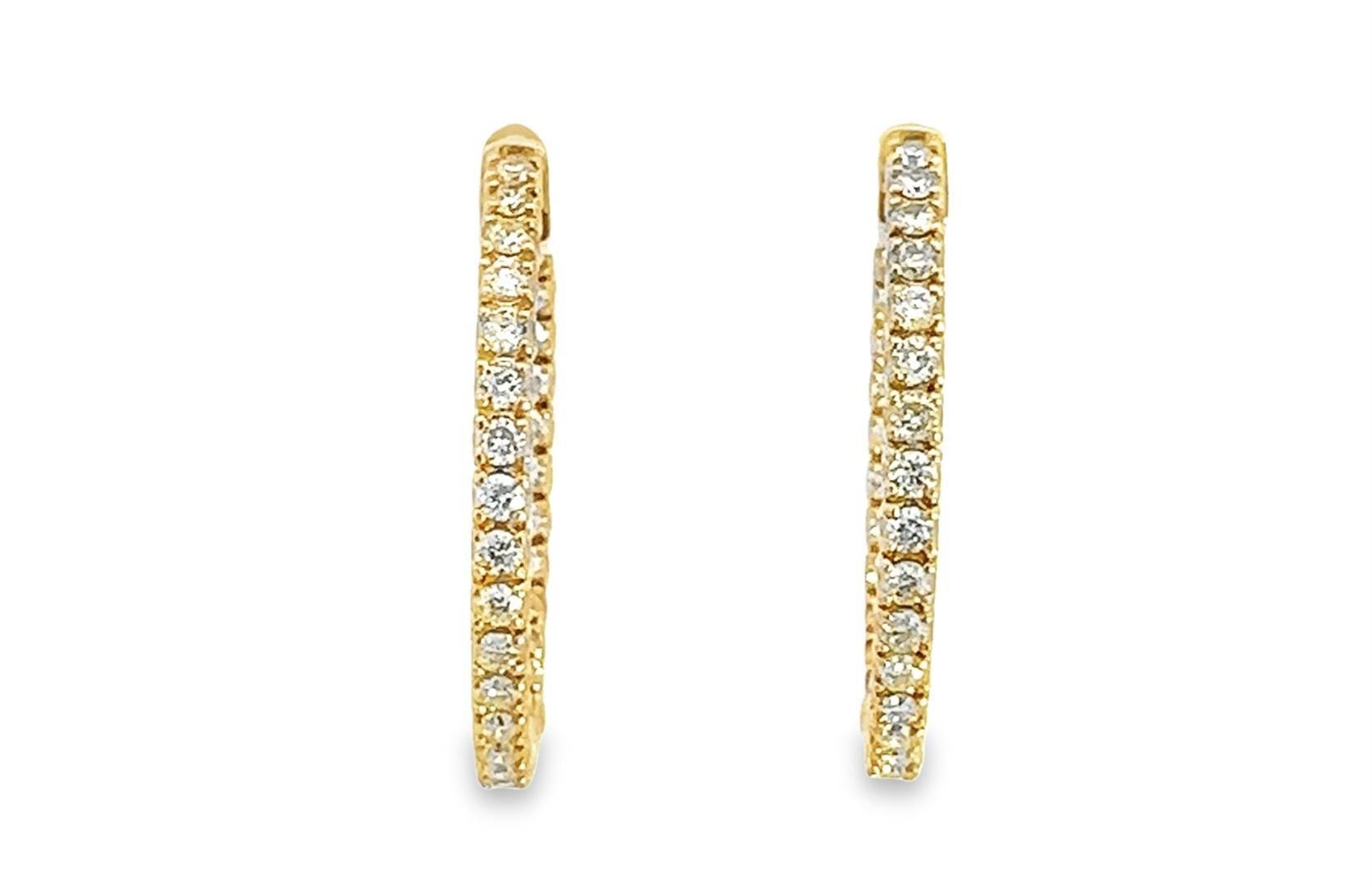 One pair electronically tested 14KT yellow gold lady's combination cast & assembled fashion inside-out hoop earrings with hinged, snap locking posts with a bright polish finish. The featured hoop earring has a diameter of 29.00 millimeter. Identified with markings of "14K". Condition is new, good workmanship. Containing: Sixty prong set round brilliant cut diamonds, measuring 2.00 - 1.90 x 1.25mm (depth est.) approximate total weight of 60 Stones = 1.80ct. Graded in the setting. Color I - K Clarity VS-2 to SI-1 Cut Very Good Total Weight of Diamonds 1.80ct. Total Weight of Earrings 7.90gm Estimated Retail Value $ 7460.00