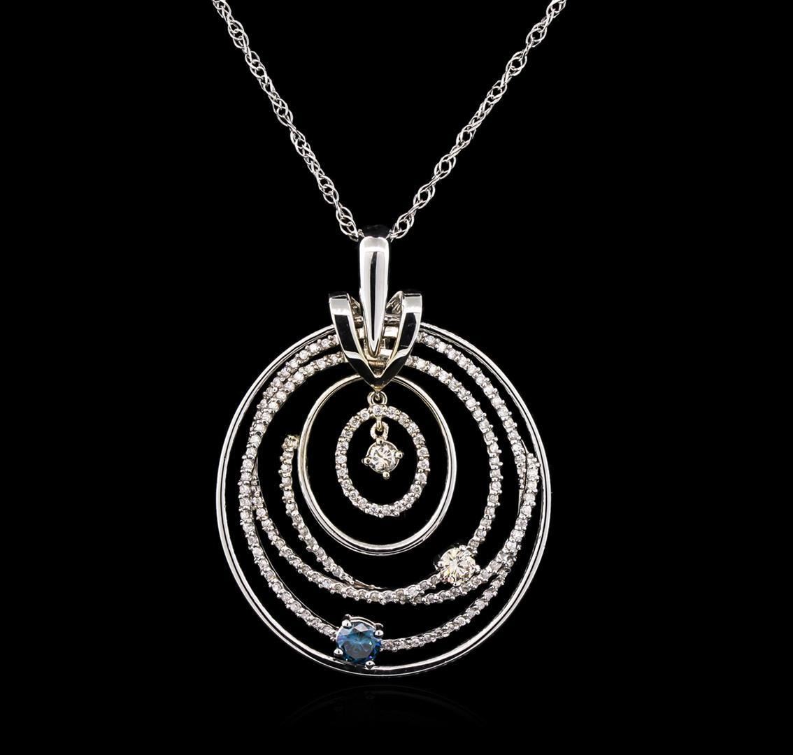 One electronically tested 14KT white gold lady's combination cast & assembled fashion pendant & chain 18.0" long, 1.7mm diamond cut loose rope chain with a spring ring clasp with a bright polish finish. Identified with markings of "14K". Condition is new, good workmanship. Containing: One round brilliant cut diamond, measuring 5.01 - 5.00 x 2.86mm (depth est.) approximate weight of 0.45ct. Colored gemstones are presumed to have been subjected to commonly used enhancement processes. Graded in the setting. Clarity: SI-2 One prong set round brilliant cut diamond, measuring 4.45 - 4.42 x 2.57mm (depth est.) approximate weight of 0.30 ct. Graded in the setting. Clarity: SI-1. Color: L - M. Cut Good One prong set round brilliant cut diamond, measuring 3.35 - 3.32 x 2.23mm (depth est.) approximate weight of 0.15ct. Graded in the setting. Clarity: SI-2. Color: J - K. Cut Good One Hundred Sixty-Five prong set round brilliant cut diamonds, measuring 1.20 - 1.10 x 0.69mm (depth est.) approximate total weight of 165 Stones = 0.90 ct. Graded in the setting. Clarity: I-1 to I-2. Color: H - Good. Total Weight of Diamonds 1.80 ct. Total Weight of Pendant & Chain 11.60gm at $7255.00.. GAS Appraised.
