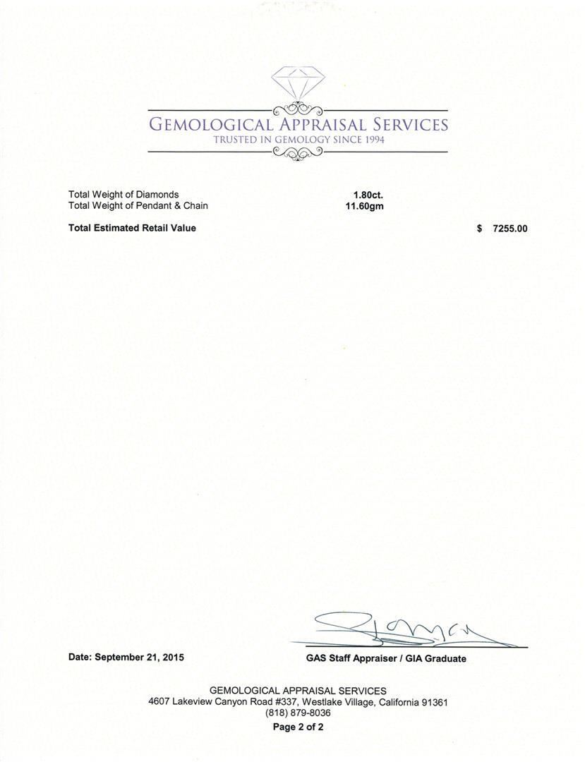 One electronically tested 14KT white gold lady's combination cast & assembled fashion pendant & chain 18.0" long, 1.7mm diamond cut loose rope chain with a spring ring clasp with a bright polish finish. Identified with markings of "14K". Condition is new, good workmanship. Containing: One round brilliant cut diamond, measuring 5.01 - 5.00 x 2.86mm (depth est.) approximate weight of 0.45ct. Colored gemstones are presumed to have been subjected to commonly used enhancement processes. Graded in the setting. Clarity: SI-2 One prong set round brilliant cut diamond, measuring 4.45 - 4.42 x 2.57mm (depth est.) approximate weight of 0.30 ct. Graded in the setting. Clarity: SI-1. Color: L - M. Cut Good One prong set round brilliant cut diamond, measuring 3.35 - 3.32 x 2.23mm (depth est.) approximate weight of 0.15ct. Graded in the setting. Clarity: SI-2. Color: J - K. Cut Good One Hundred Sixty-Five prong set round brilliant cut diamonds, measuring 1.20 - 1.10 x 0.69mm (depth est.) approximate total weight of 165 Stones = 0.90 ct. Graded in the setting. Clarity: I-1 to I-2. Color: H - Good. Total Weight of Diamonds 1.80 ct. Total Weight of Pendant & Chain 11.60gm at $7255.00.. GAS Appraised.