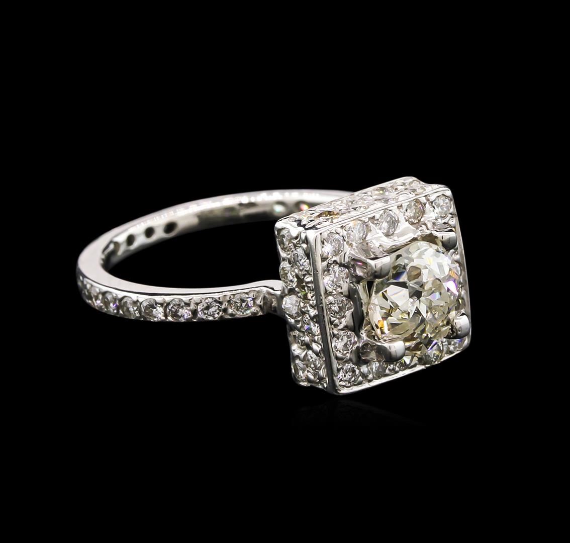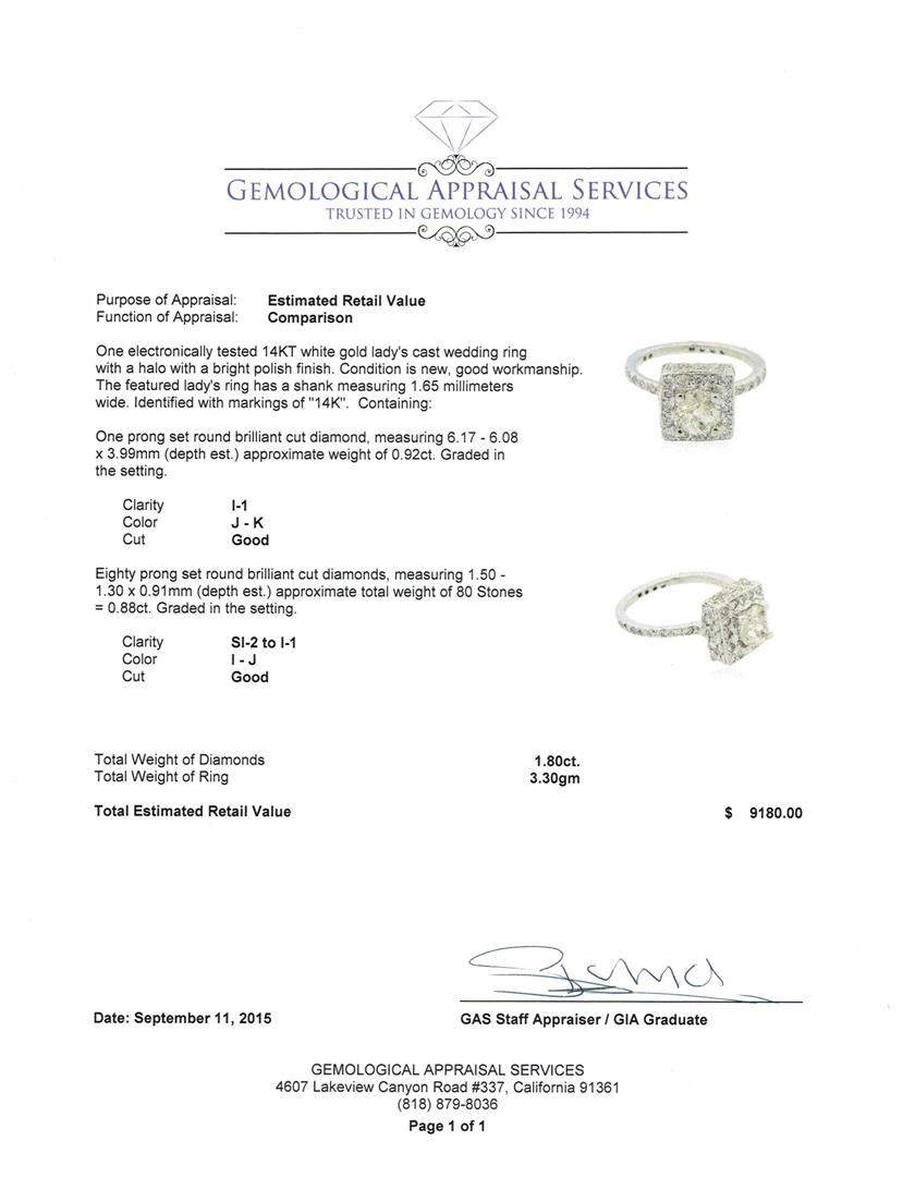One electronically tested 14KT white gold lady's cast wedding ring with a halo with a bright polish finish. The featured lady's ring has a shank measuring 1.65 millimeters wide. Identified with markings of "14K". Condition is new, good workmanship. Containing: One prong set round brilliant cut diamond, measuring 6.17 - 6.08 x 3.99mm (depth est.) approximate weight of 0.92ct. Graded in the setting. Clarity: I-1. Color: J - K. Cut Good Eighty prong set round brilliant cut diamonds, measuring 1.50 - 1.30 x 0.91mm (depth est.) approximate total weight of 80 Stones = 0.88ct. Graded in the setting. Clarity: SI-2 to I-1. Color: I - Good. Total Weight of Diamonds 1.80ct. Total Weight of Ring 3.30gm. GAS Appraised at $9,180.00.