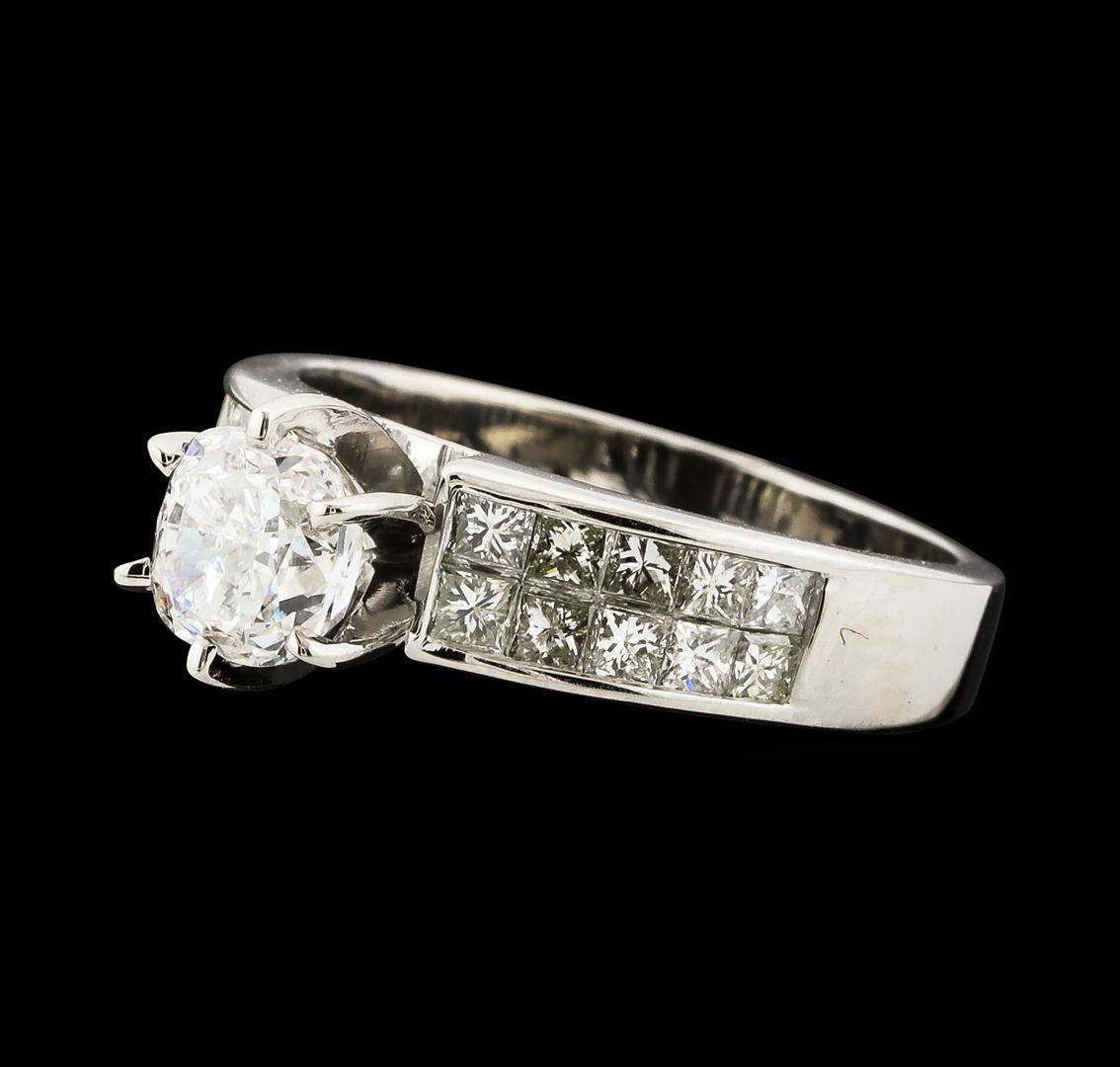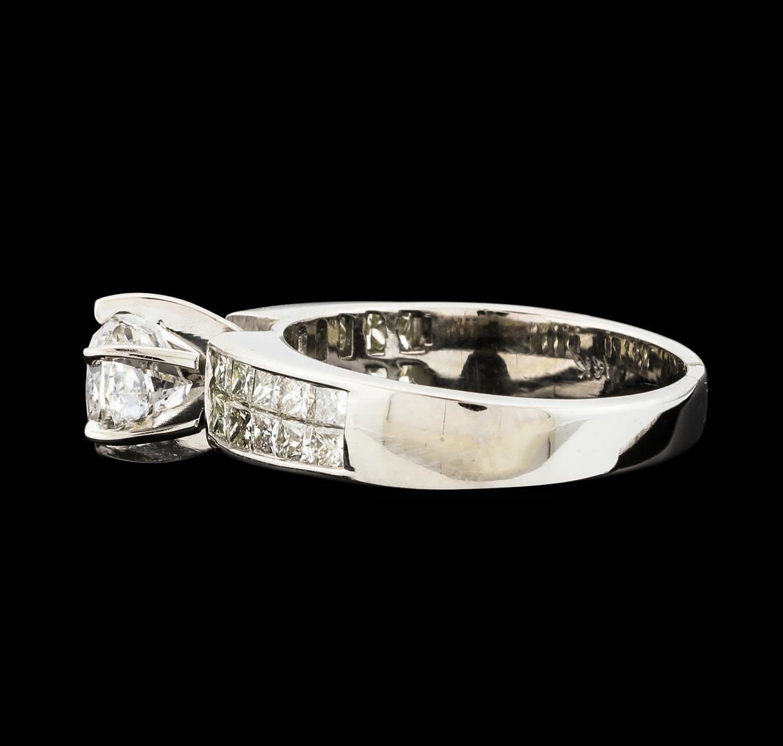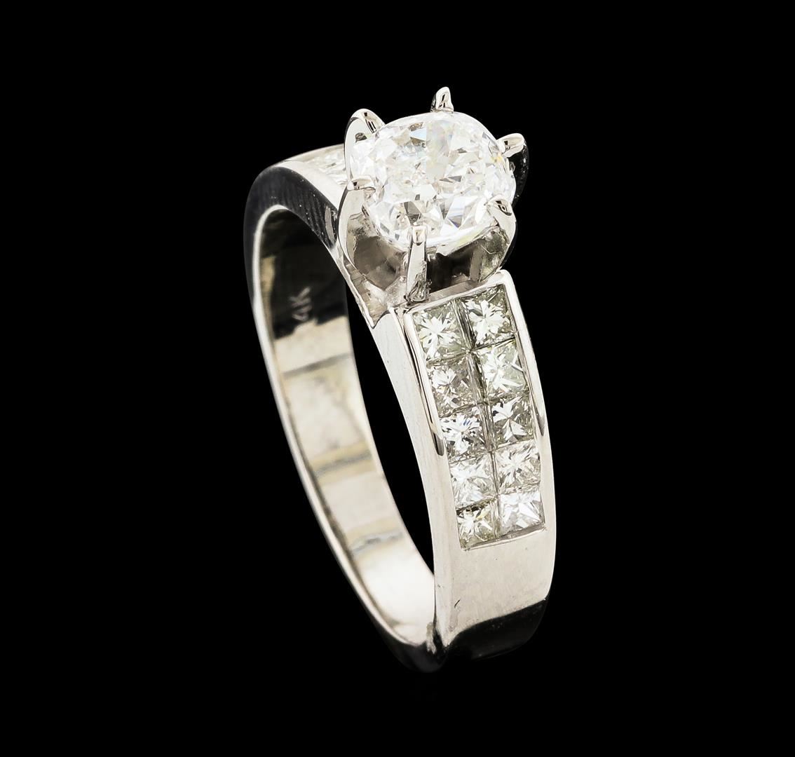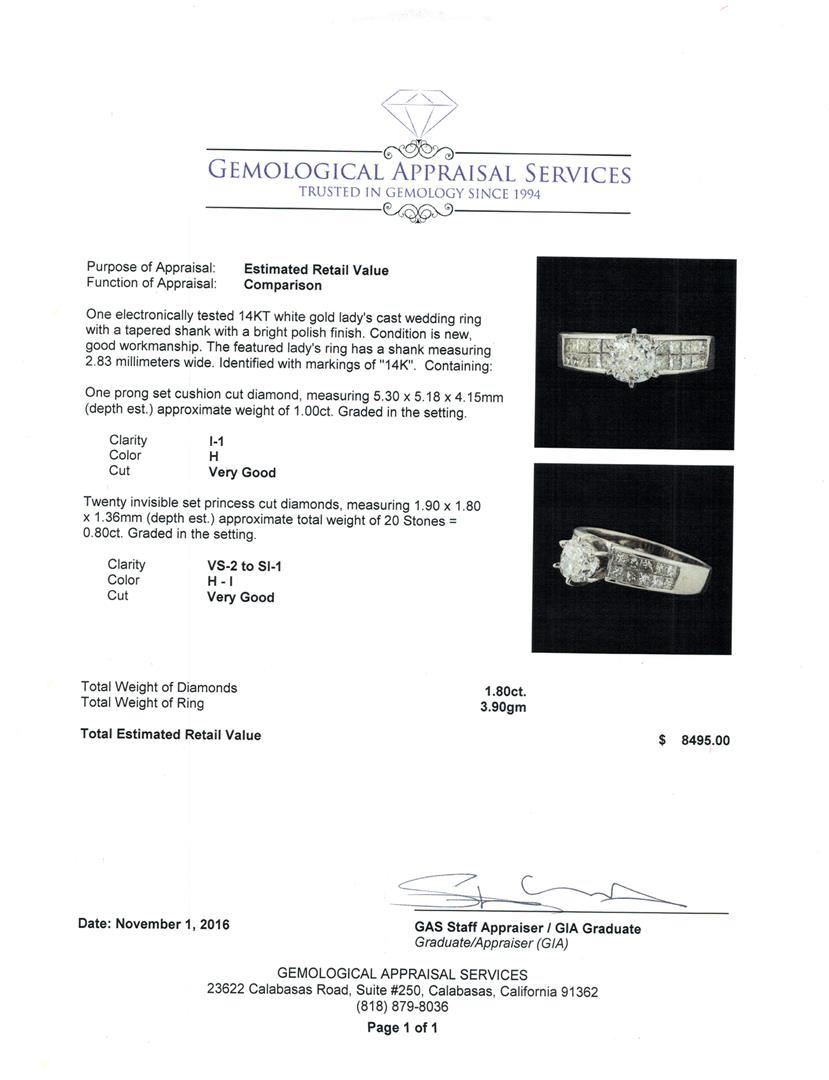 One electronically tested 14KT white gold lady's cast wedding ring with a tapered shank with a bright polish finish. The featured lady's ring has a shank measuring 2.83 millimeters wide. Identified with markings of '14K'. Condition is new, good workmanship. Containing: One prong set cushion cut diamond, measuring 5.30 x 5.18 x 4.15mm (depth est.) approximate weight of 1.00ct. Graded in the setting. Clarity I-1. Color: H Cut Very Good Twenty invisible set princess cut diamonds, measuring 1.90 x 1.80 x 1.36mm (depth est.) approximate total weight of 20 Stones = 0.80ct. Graded in the setting. Clarity VS-2 to SI-1. Color: H - I Cut Very Good. Total Weight of Diamonds 1.80ct.. Total Weight of Ring 3.90gm. GAS Appraised at $8,495.00.
