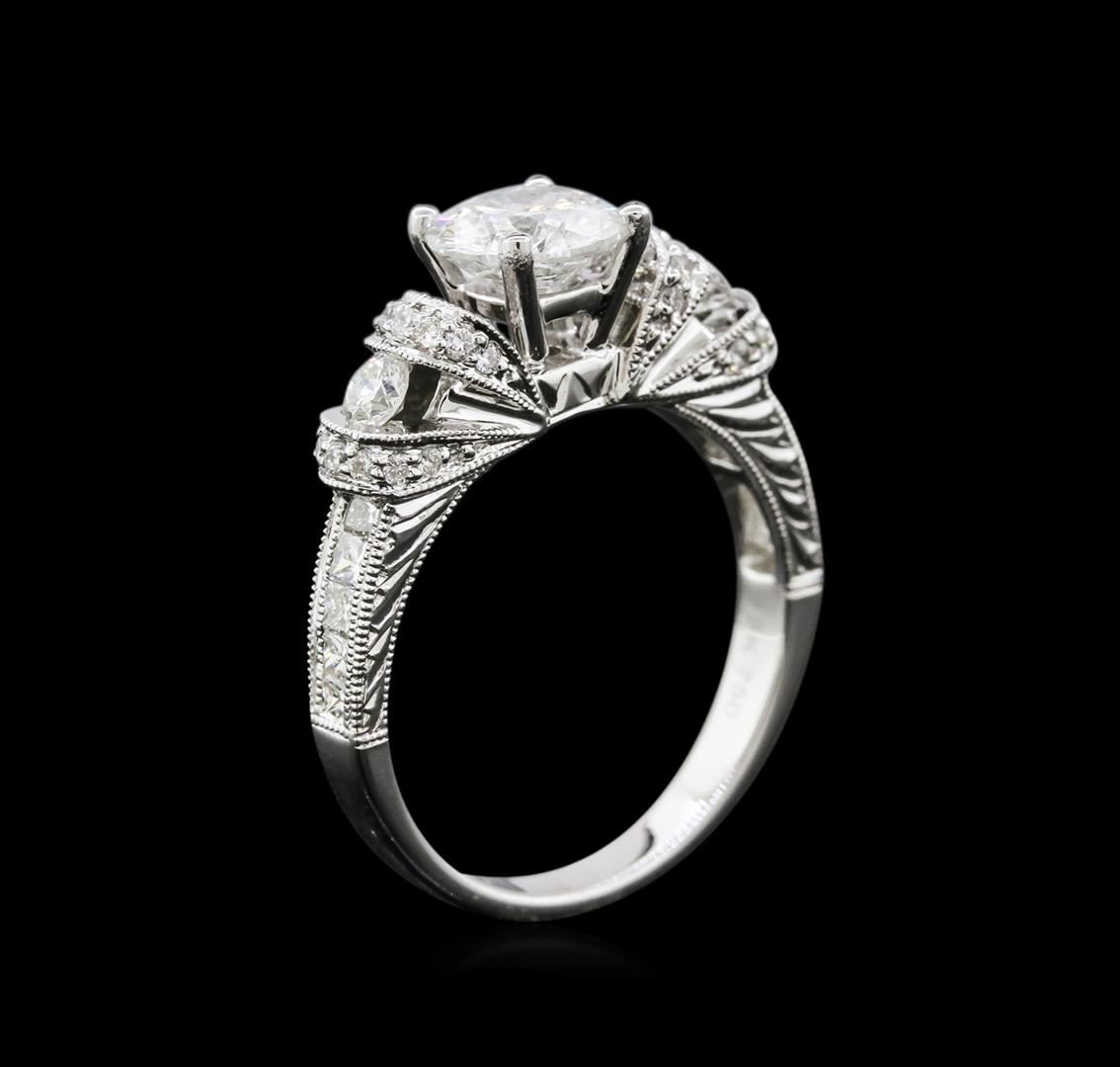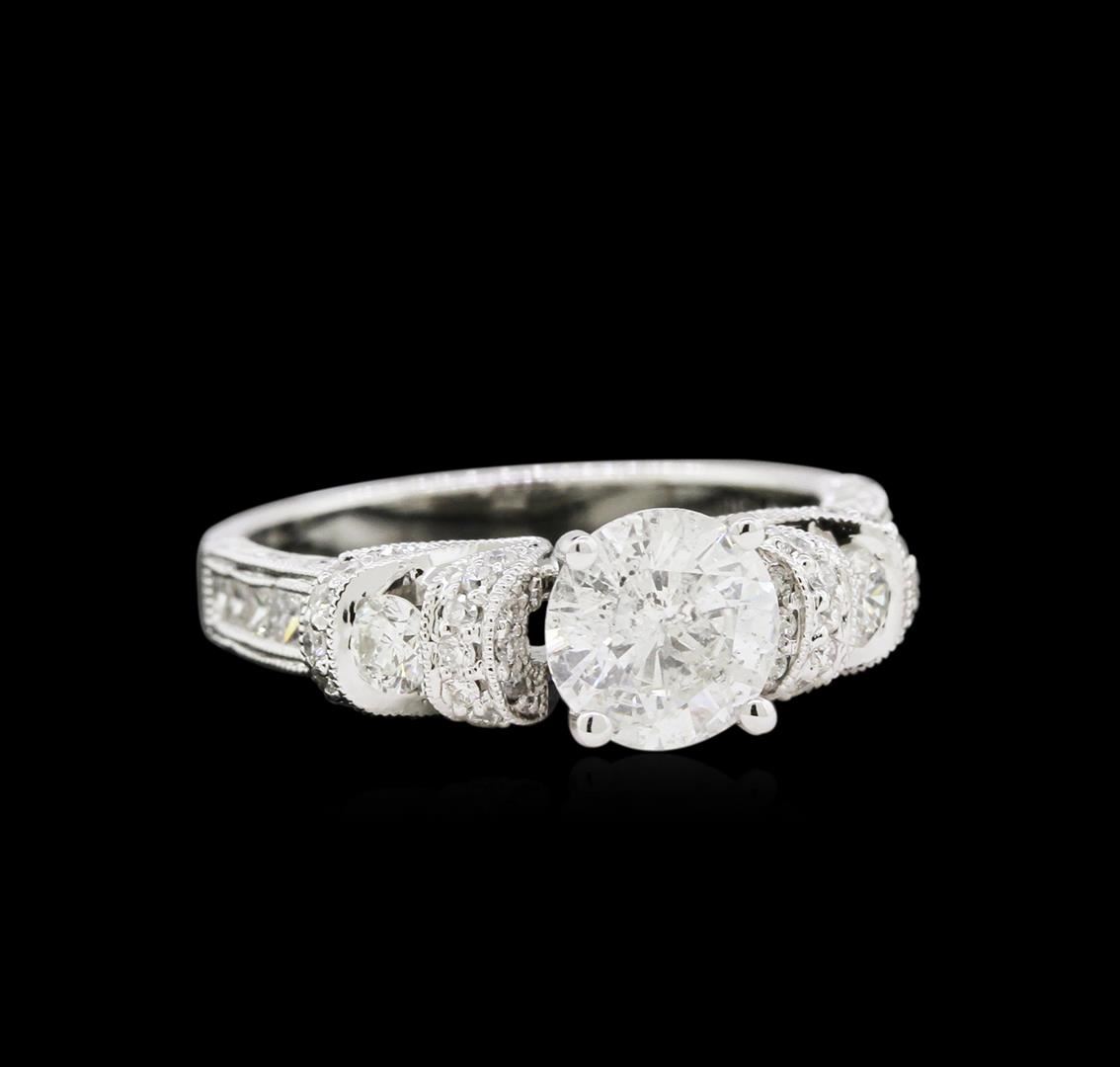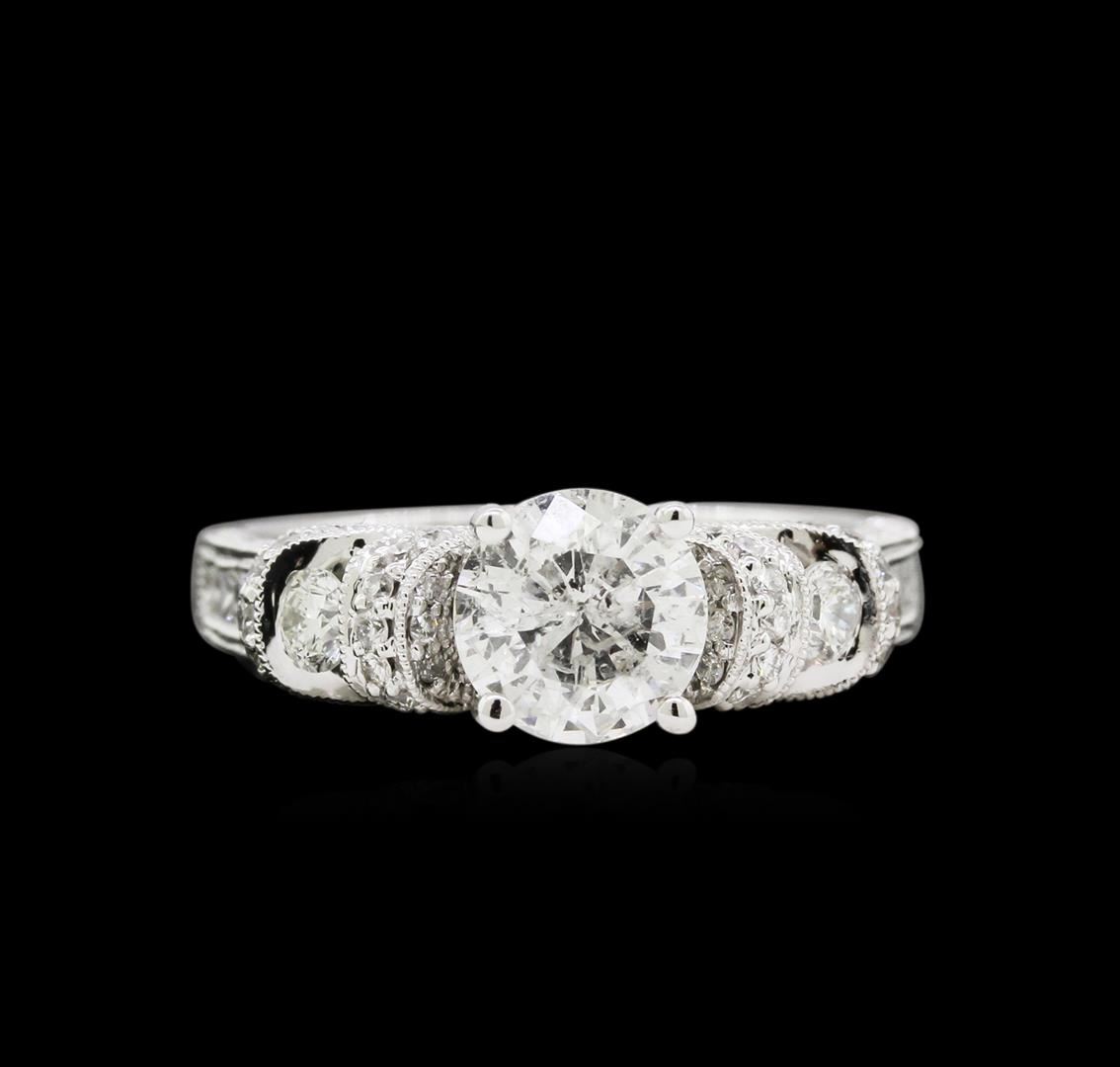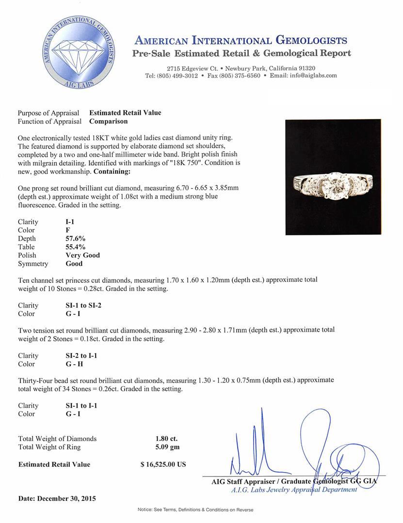 One electronically tested 18KT white gold ladies cast diamond unity ring. The featured diamond is supported by elaborate diamond set shoulders, completed by a two and one-half millimeter wide band. Bright polish finish with milgrain detailing. Identified with markings of "18K 750". Condition is new, good workmanship. Containing: One prong set round brilliant cut diamond, measuring 6.70 - 6.65 x 3.85mm (depth est.) approximate weight of 1.08ct with a medium strong blue fluorescence. Graded in the setting. Clarity: I-1. Color: 57.6%. Table 55.4%. Ten channel set princess cut diamonds, measuring 1.70 x 1.60 x 1.20mm (depth est.) approximate total weight of 10 Stones = 0.28ct. Graded in the setting. Clarity: SI-1 to SI-2. Color: G - I Two tension set round brilliant cut diamonds, measuring 2.90 - 2.80 x 1.71mm (depth est.) approximate total weight of 2 Stones = 0.18ct. Graded in the setting. Clarity: SI-2 to I-1. Color: G - H Thirty-Four bead set round brilliant cut diamonds, measuring 1.30 - 1.20 x 0.75mm (depth est.) approximate total weight of 34 Stones = 0.26ct. Graded in the setting. Clarity: SI-1 to I-1. Color: G - I. Total Weight of Diamonds 1.80ct. Total Weight of Ring 5.09gm. AIG Appraised at $16,525.00.