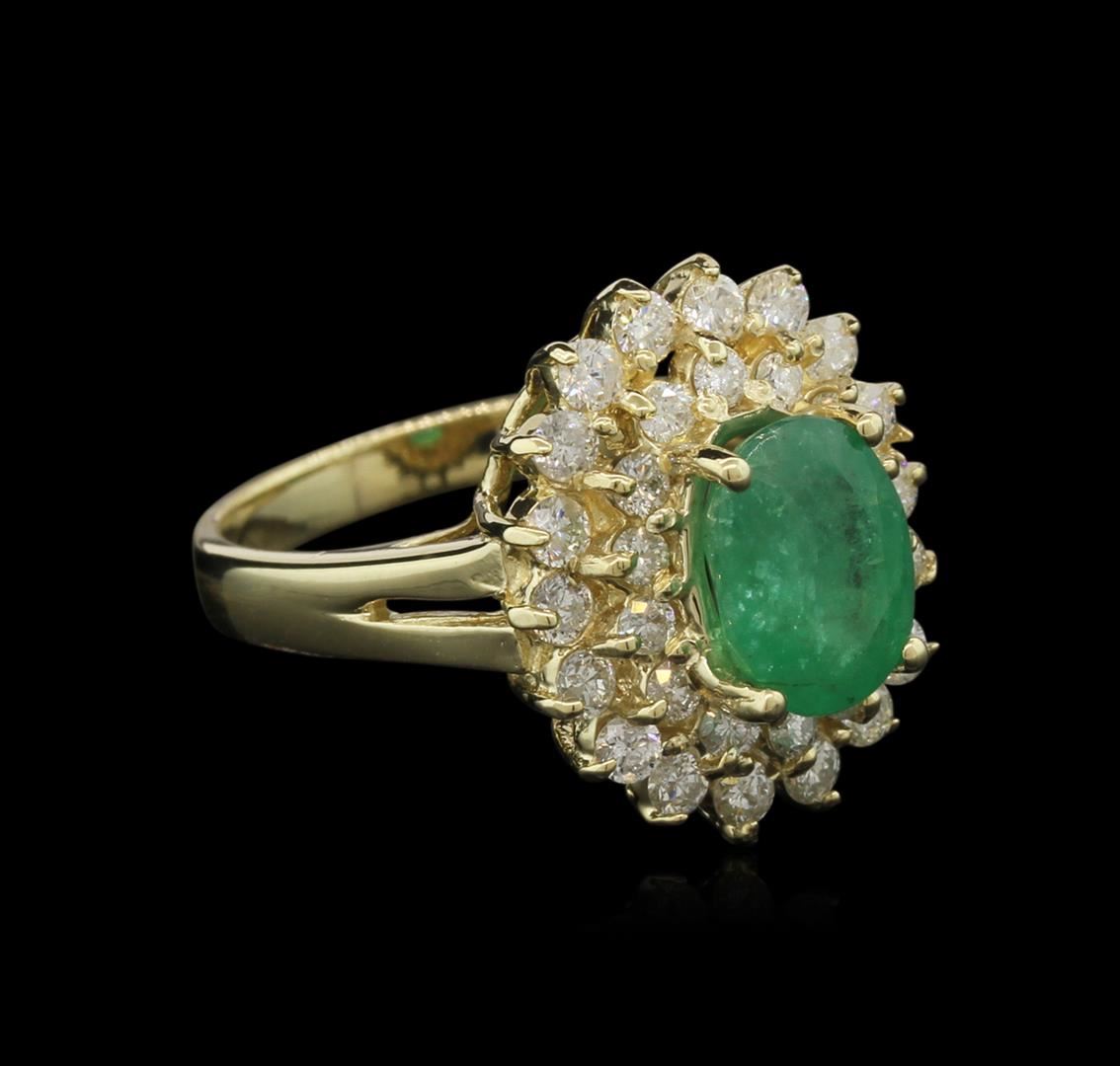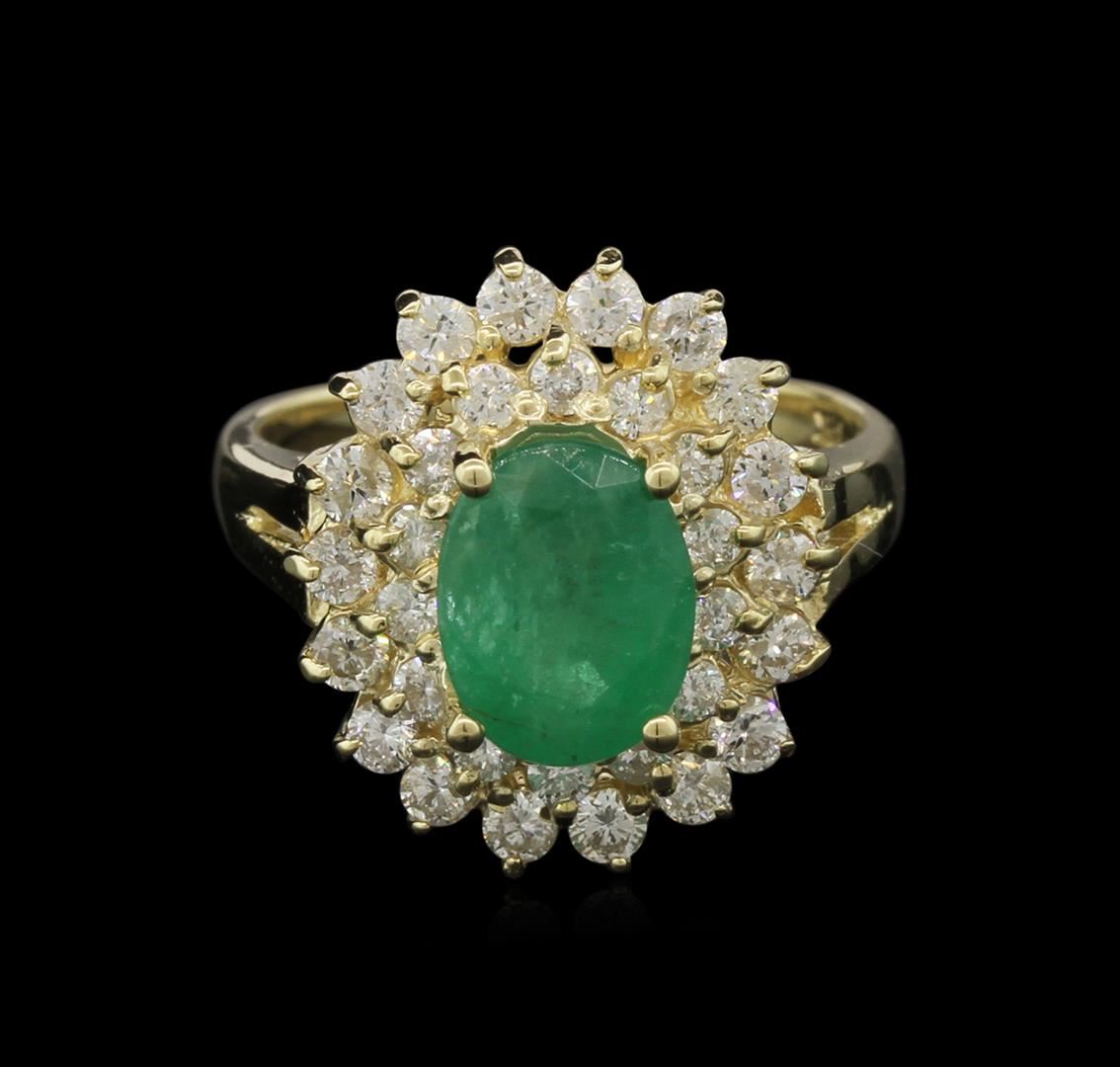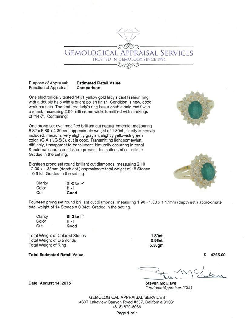 One electronically tested 14KT yellow gold lady's cast fashion ring with a double halo with a bright polish finish. The featured lady's ring has a double halo motif with a shank measuring 2.60 millimeters wide. Identified with markings of "14K". Condition is new, good workmanship. Containing: One prong set oval modified brilliant cut natural emerald, measuring 8.82 x 6.80 x 4.80mm, approximate weight of 1.80ct., clarity is heavily included, medium, very slightly grayish, slightly yellowish green color, (GIA slyG 5/3), cut is good. Transmitting light somewhat diffusely, transparent to translucent. Naturally occurring internal & external characteristics are present. Indications of oil residue. Graded in the setting. Eighteen prong set round brilliant cut diamonds, measuring 2.10 - 2.00 x 1.33mm (depth est.) approximate total weight of 18 Stones = 0.61ct. Graded in the setting. Clarity: SI-2 to I-1. Color: H - I. Cut Good Fourteen prong set round brilliant cut diamonds, measuring 1.90 - 1.80 x 1.17mm (depth est.) approximate total weight of 14 Stones = 0.34ct. Graded in the setting. Clarity: SI-2 to I-1. Color: H - I. Cut Good. Total Weight of Colored Stones 1.80ct. Total Weight of Diamonds 0.95ct. Total Weight of Ring 5.50gm. GAS Appraised at $4,765.00.