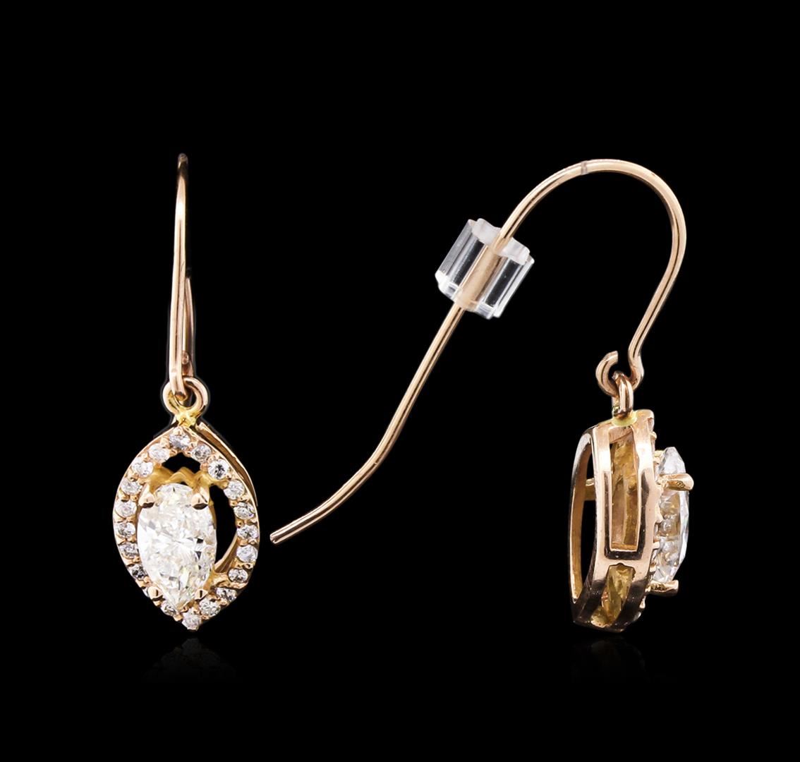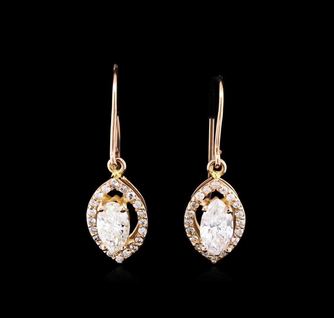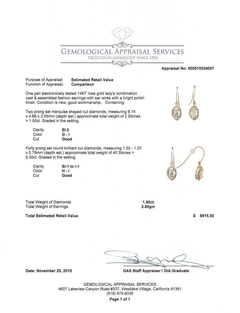 One pair electronically tested 14KT rose gold lady's combination cast & assembled fashion earrings with ear wires with a bright polish finish. Condition is new, good workmanship. Containing: Two prong set marquise shaped cut diamonds, measuring 8.74 x 4.66 x 3.05mm (depth est.) approximate total weight of 2 Stones = 1.50ct. Graded in the setting. Clarity: SI-2. Color: G - I. Cut Good Forty prong set round brilliant cut diamonds, measuring 1.30 - 1.20 x 0.79mm (depth est.) approximate total weight of 40 Stones = 0.30ct. Graded in the setting. Clarity: SI-1 to I-1. Color: H - I. Cut Good. Total Weight of Diamonds 1.80ct. Total Weight of Earrings 2.80gm. GAS Appraised at $8,815.00.